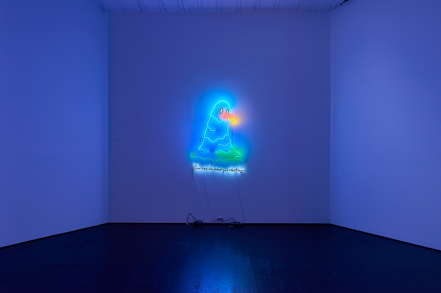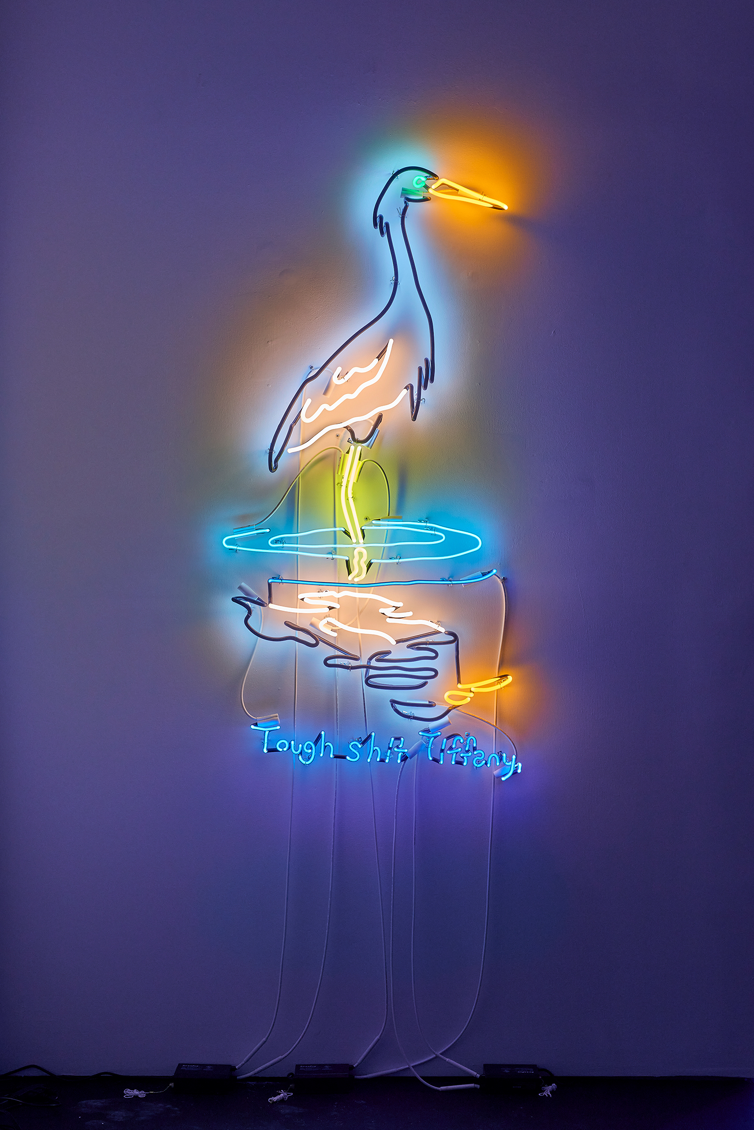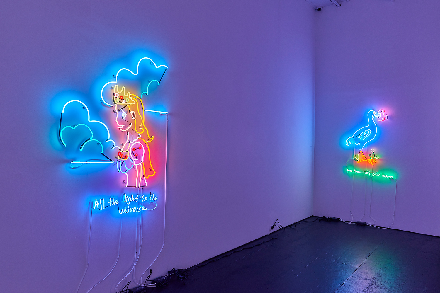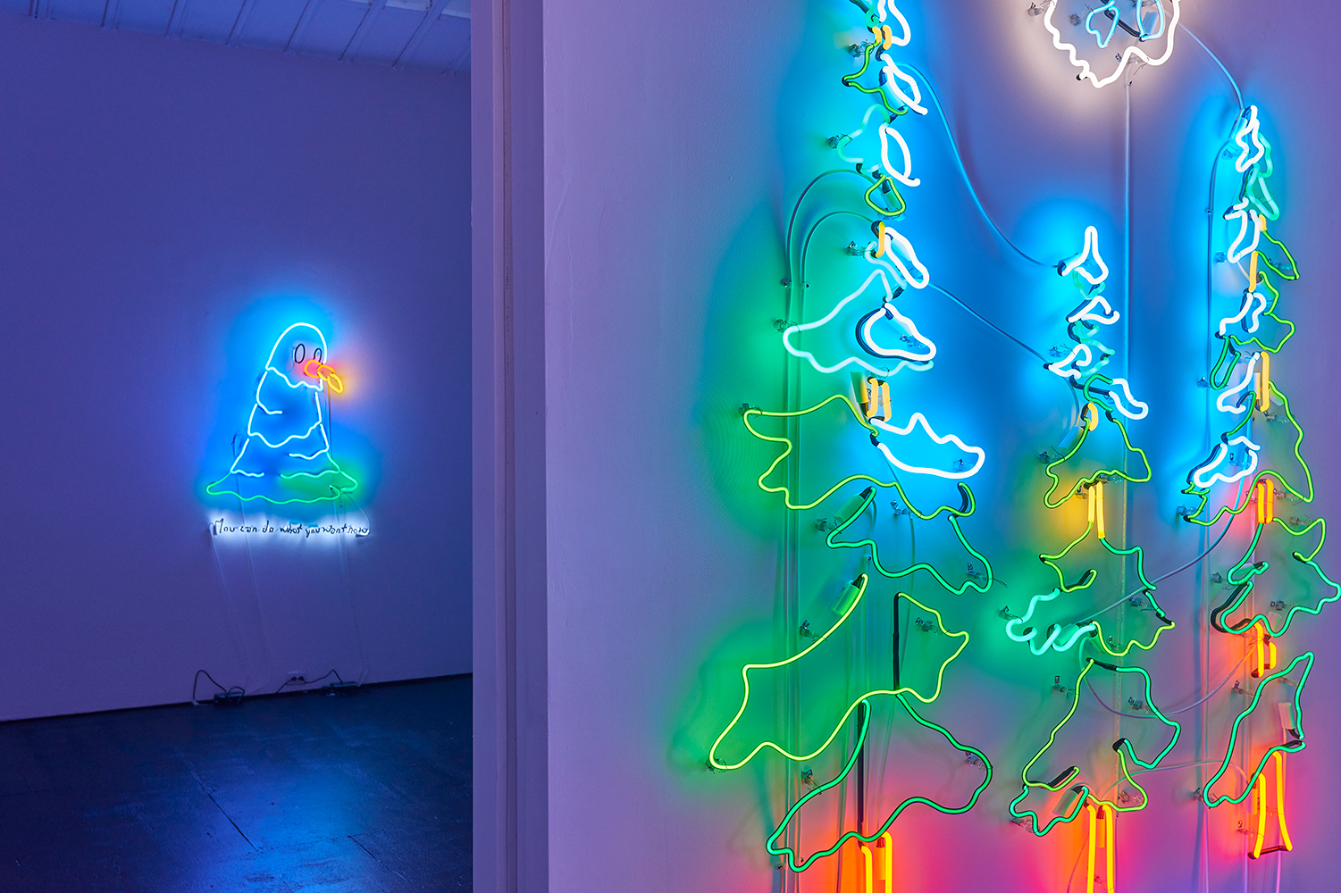 Two illuminating ladies offer some light at the end of the winter tunnel, tho perhaps quixotically. One Lady Godiva in jeans shorts straddles what looks like a horse drawn by someone who has never seen a horse. The other is a pretty princess, insipidly offering “all the light in the universe.” These works bring us back to the reason Attoe has maintained a relationship to neon which is its ability to connote both Las Vegas seduction and dive bar philosophy; we are drawn to the flame but it provides no comforting warmth.