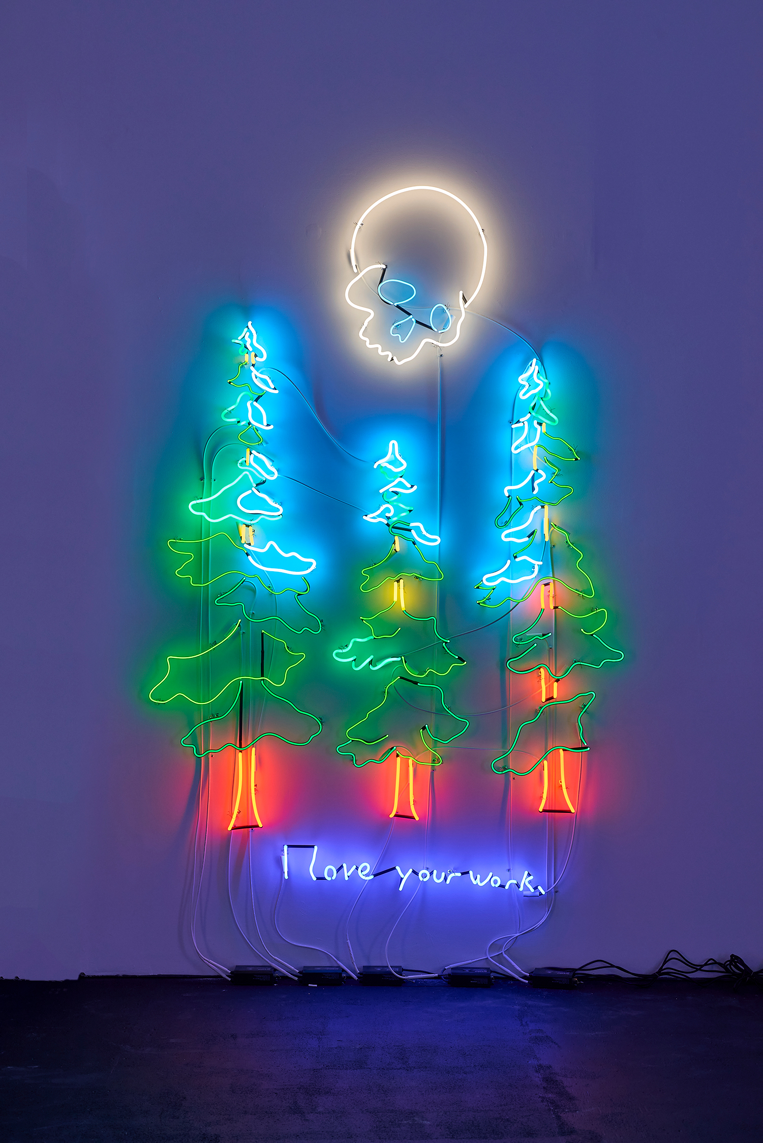 For this exhibition Attoe revisits an important aspect of his oeuvre, the neon wall drawing. Known for painting immaculate and haunting miniature oil on canvas works of man and nature, Attoe nonetheless has always maintained active engagement with the medium of neon. I remember in 2008 showing a great neon work by him with Deitch Projects in Miami; "There is electricity in your head.” The texts are always provocative non-sequiturs that set off the edge of the image paired with it. In this piece above, for example, we can ponder whether nature is telling Death they love his work, Death is complimenting nature on their work, or perhaps the artist is just reflexively repeating a phrase often overheard at art openings.