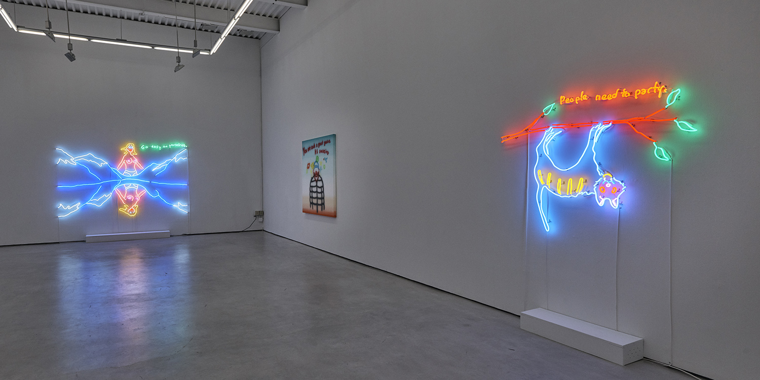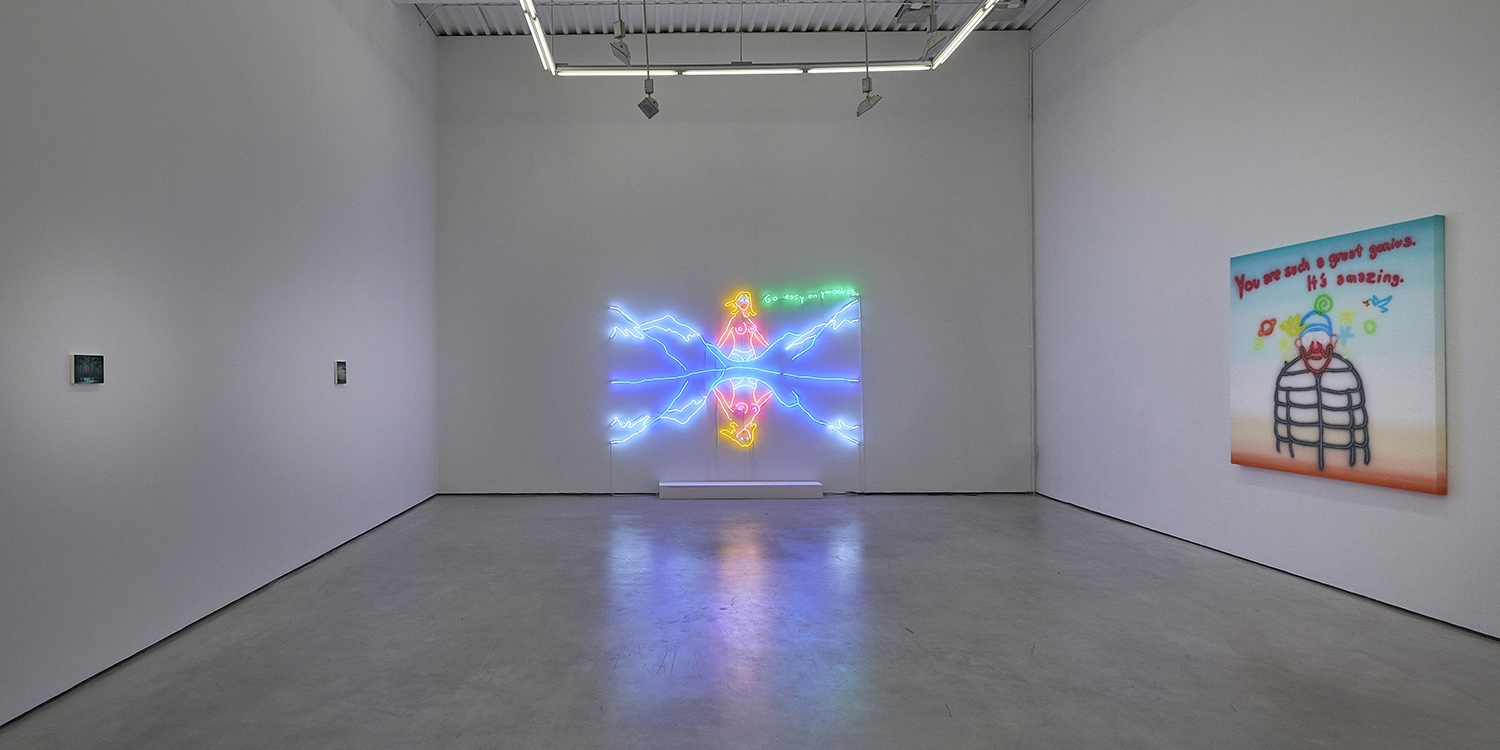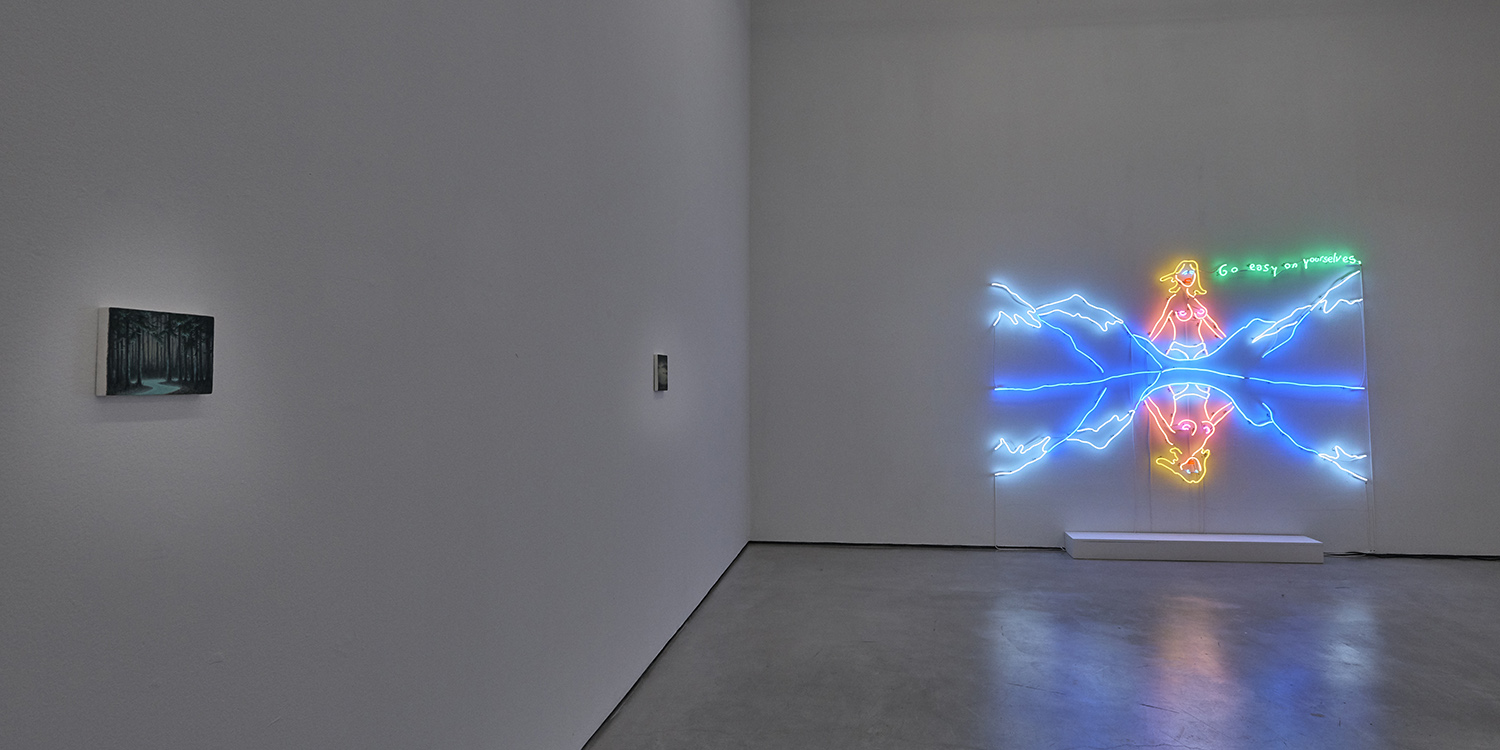 The most sensational part of this exhibition is of course the two large neon wall works that bathe the gallery in colored light and create a church-like—or dive-bar like—reverence in the room. “Go easy on yourselves” a topless lady tells us, emerging from the mountains like an angel—or stripper—and reflected in the lake below. Across the room a tweaker cat hangs upside down admitting “People need to party” and eerily encouraging us to do so. These light-based works show a dual reading of rural Americana signage from the holy to the prurient and tease a kind of contemporary rugged individualism that goes beyond good and evil.