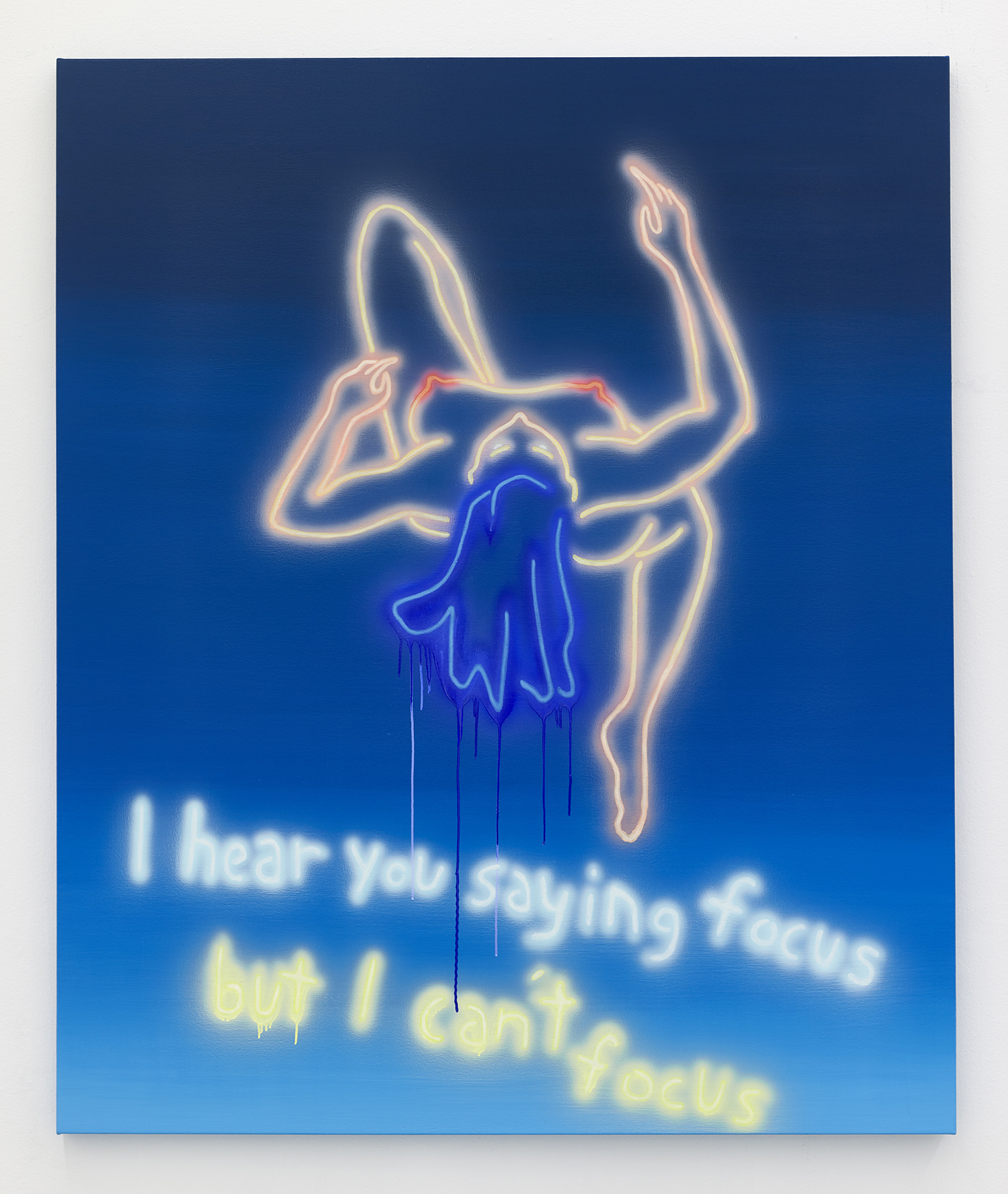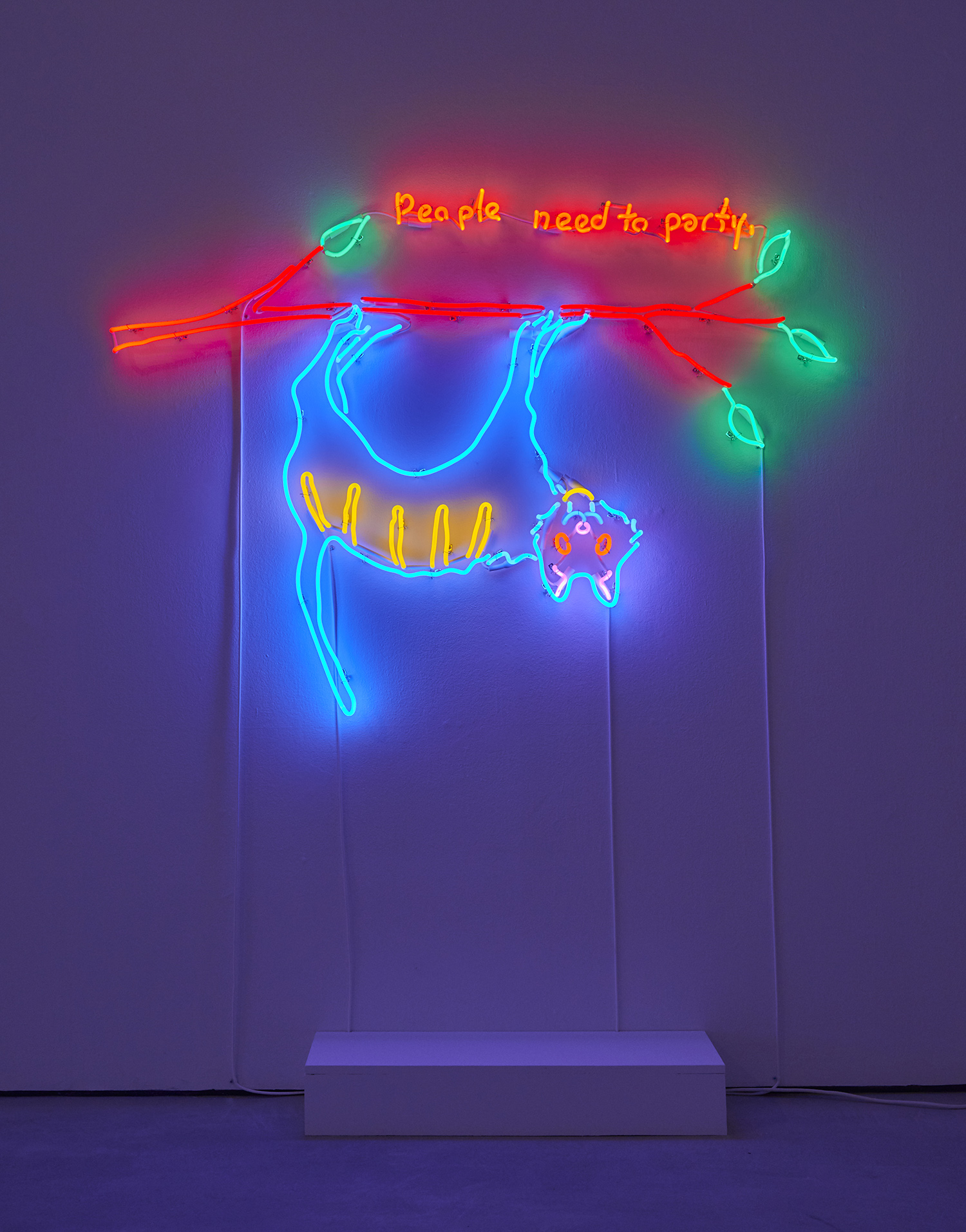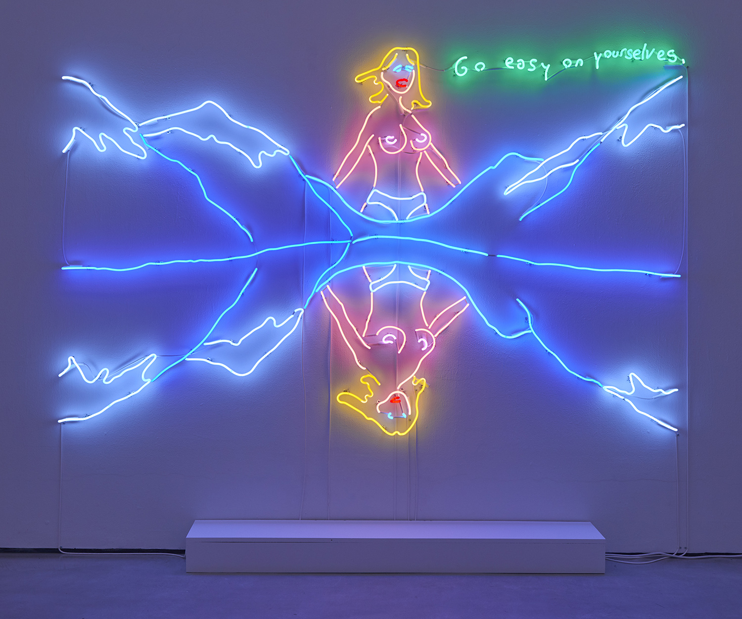 The most sensational part of this exhibition is of course the two large neon wall works that bathe the gallery in colored light and create a church-like—or dive-bar like—reverence in the room. “Go easy on yourselves” a topless lady tells us, emerging from the mountains like an angel—or stripper—and reflected in the lake below. Across the room a tweaker cat hangs upside down admitting “People need to party” and eerily encouraging us to do so. These light-based works show a dual reading of rural Americana signage from the holy to the prurient and tease a kind of contemporary rugged individualism that goes beyond good and evil.