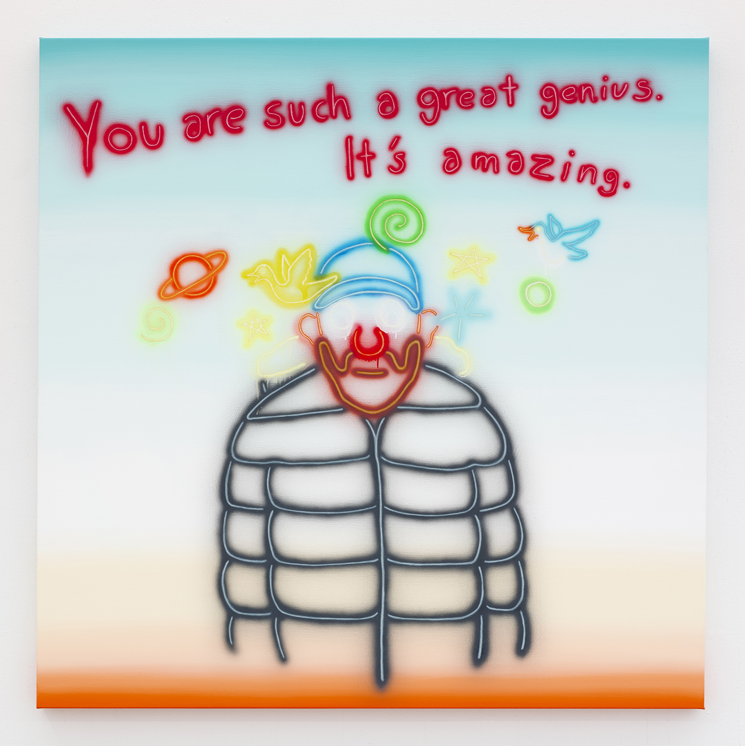 In a new direction Attoe exhibits a very large painting of a neon, an interesting in between zone for the neon works and miniatures, here painting illusionistic tubes of light. In this work a puffer jacket mountain man tells, perhaps, himself “You are such a great genius it’s amazing” as bemused blips of neon doo-dads circle his head. The delusional potential of artistic isolation is here both ridiculed and sympathized with.