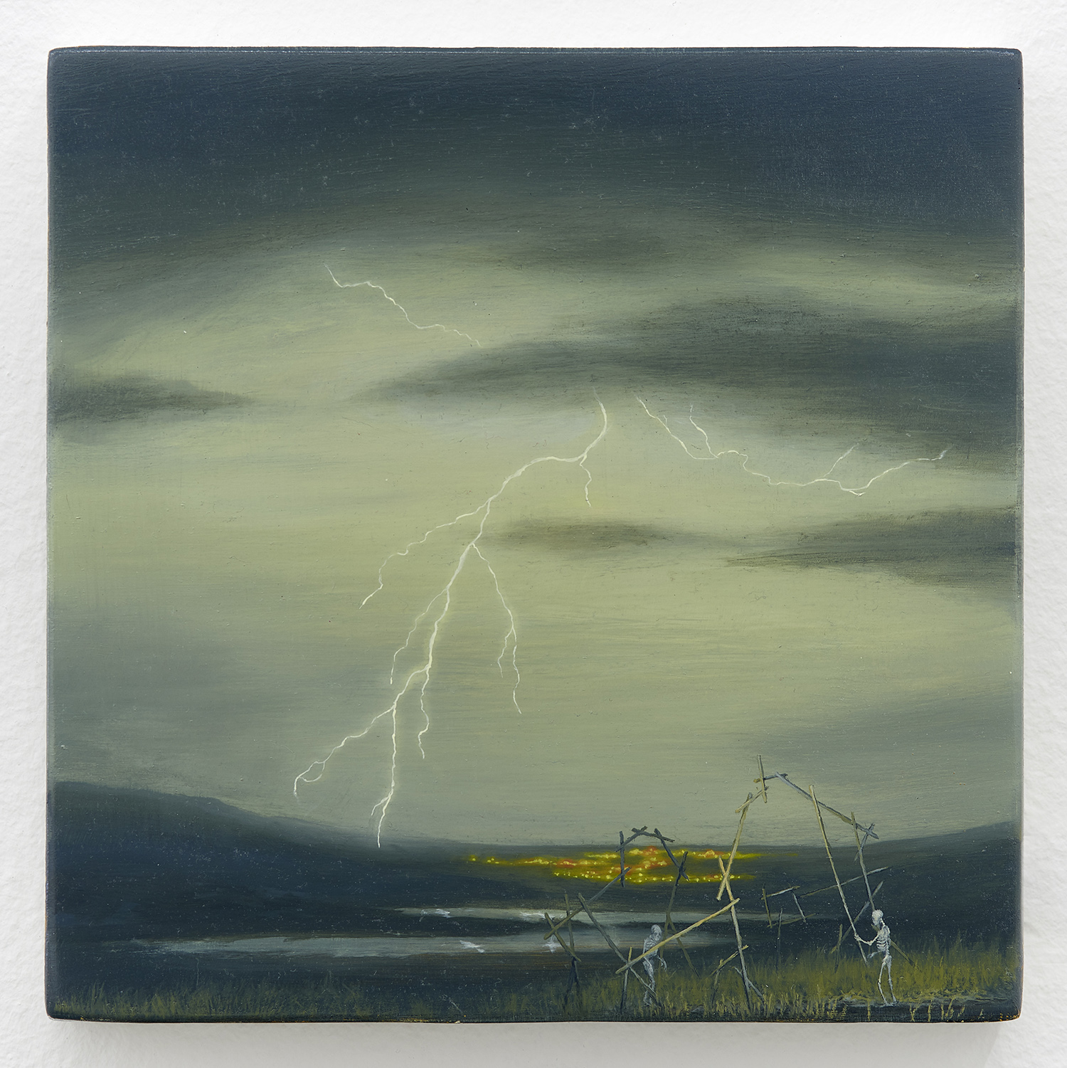Known for his miniature and meditative oil paintings of the natural world, Attoe here exhibits three new bite-sized beauties. In the five-inch tall titular work above, a forest stream glows ice-blue illuminating the tiny figures hidden amongst the pine trees. In a similarly-sized square piece two skeletons erect an imperfect abode on a hilltop lit by lightning. Lastly in “Beached” we see a whale-like form, punctured by scores of tiny points of light, and the minuscule humans assembling ceremonially around the behemoth. These works have a timeless quality to them but each contain an eerie intrusion of culture or humanity; light is the protagonist here, light as a guide.