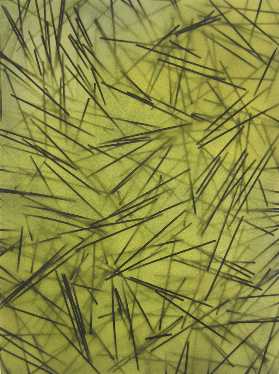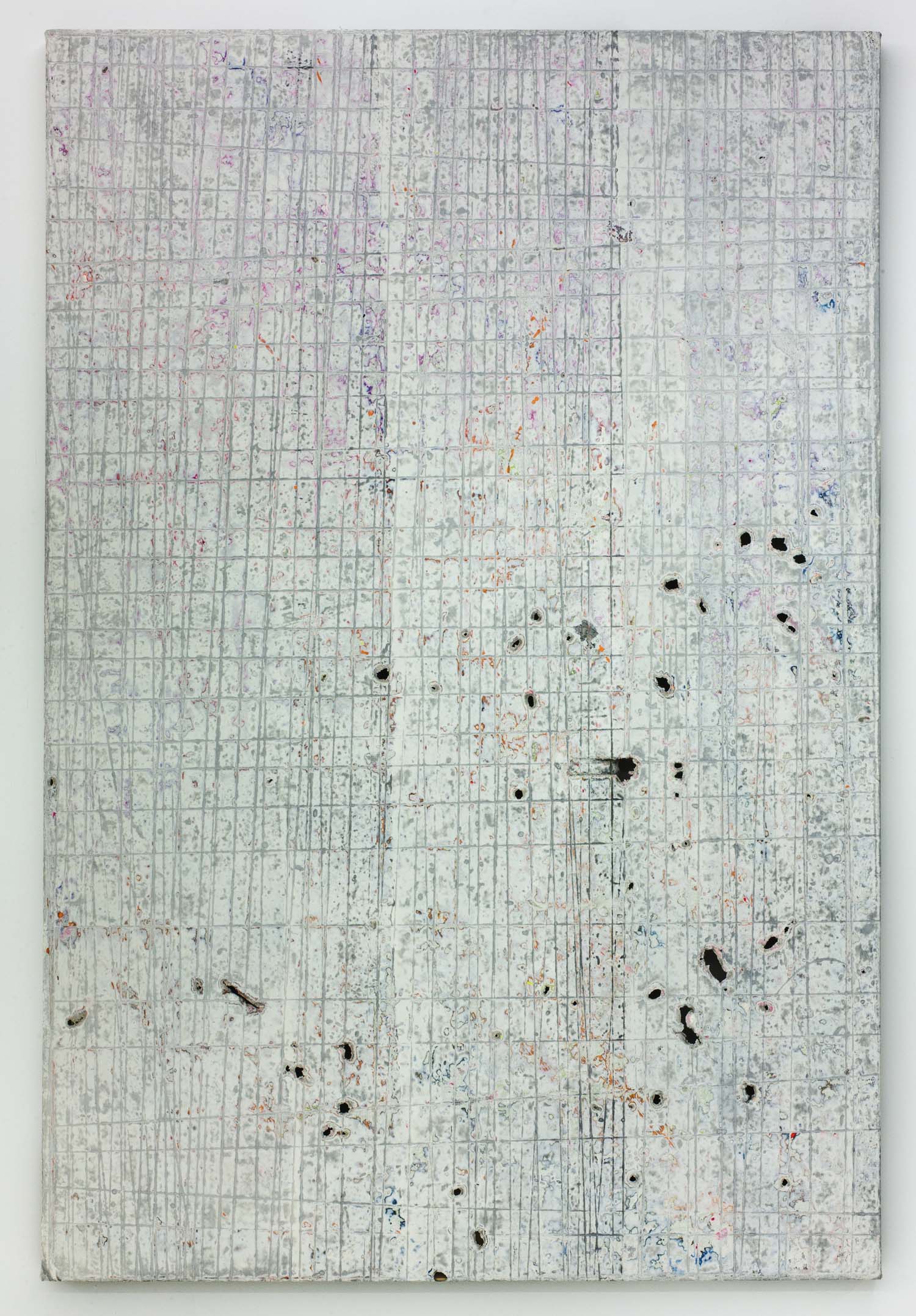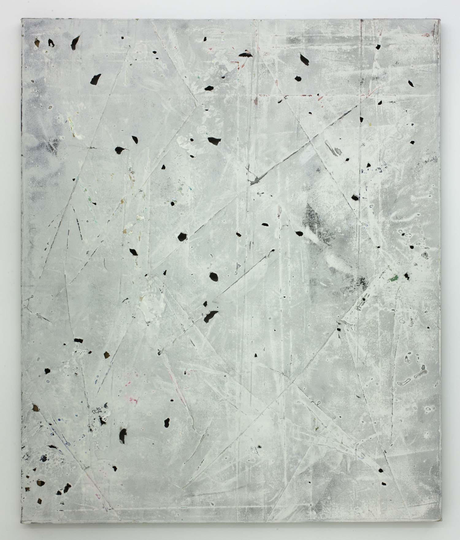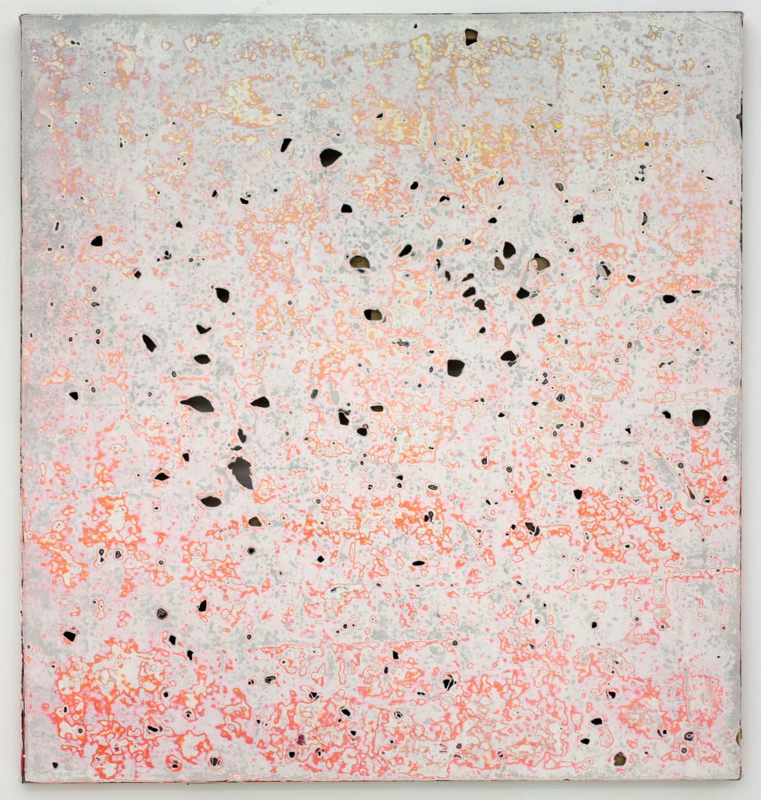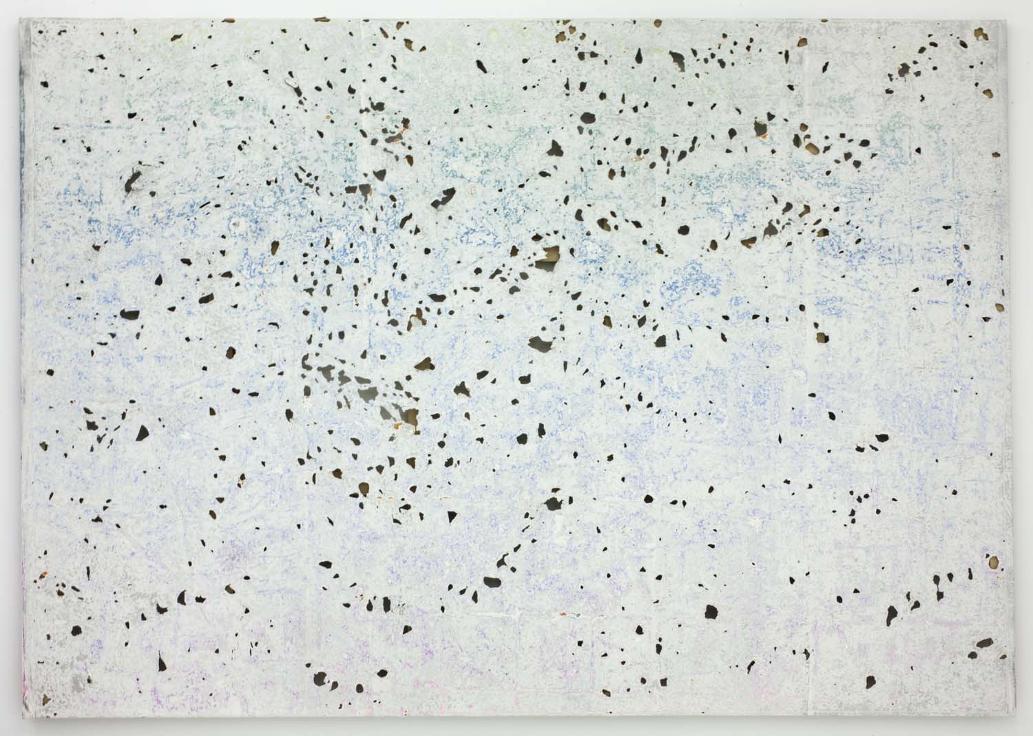 Scott Reeder makes visually scintillating spray paintings on canvas using the shadows left behind from spaghetti, lentils, and other foodstuffs. These products are often Italian—the nationality of the Arte Povera movement he is reprising. Pasta, Italy, capito? If the Arte Povera movement challenged established art conventions through its use of found or “low” materials, and if abstract expressionism was in many ways a tradition of American hegemony during the Cold War and the ultimate in “high art seriousness” as practitioners confronted the sublime and the subconscious in their energetic output, Scott’s paintings are a strange hybrid of both. Reeder calls himself an “agnostic” when it comes to painting and these works exhibit a profound ambivalence, with nonetheless a visual seductiveness that aims to engage.