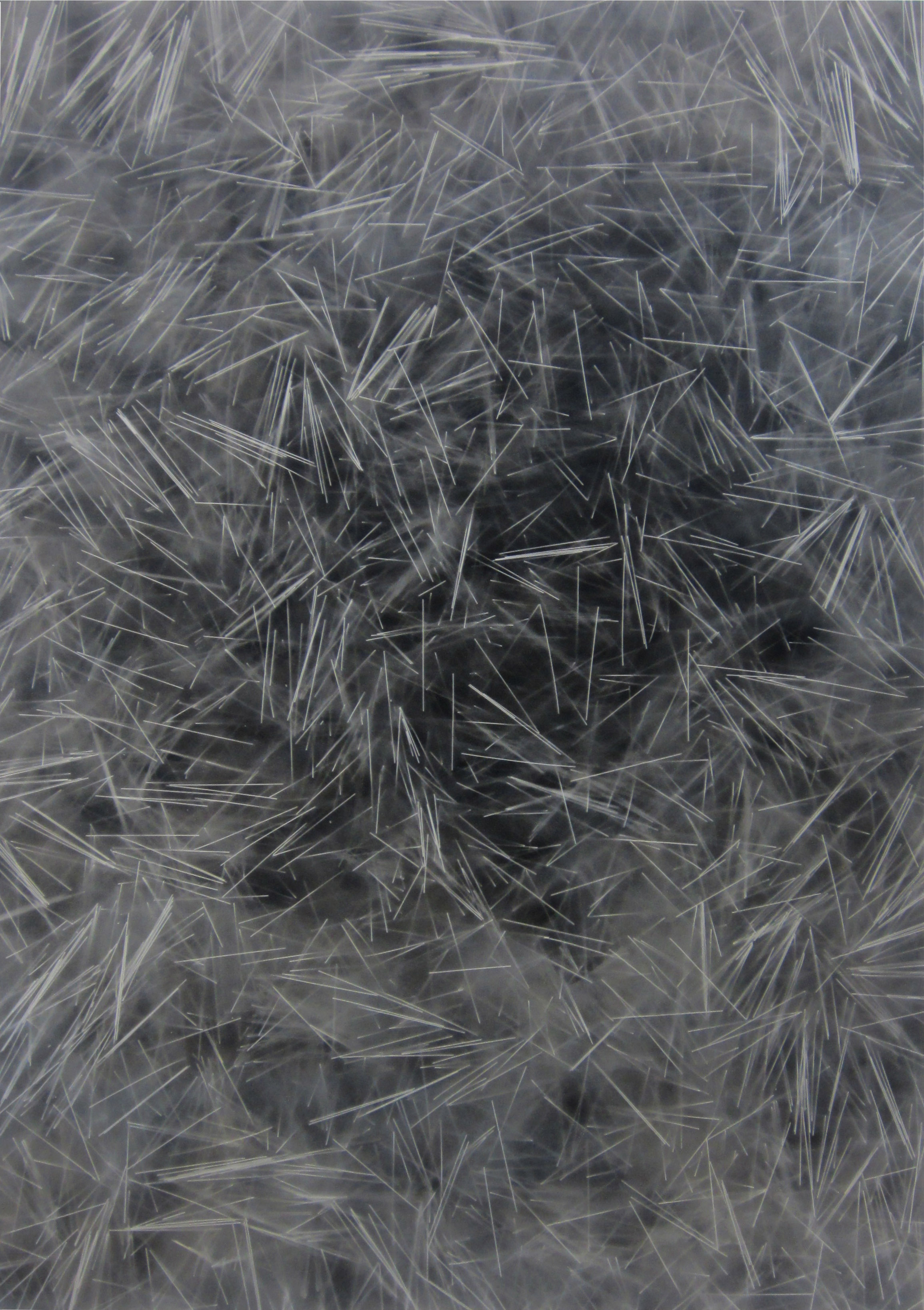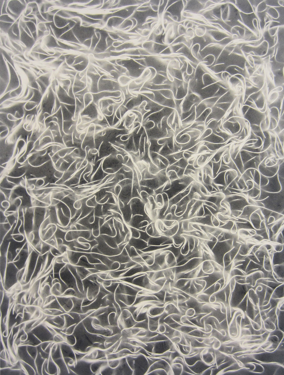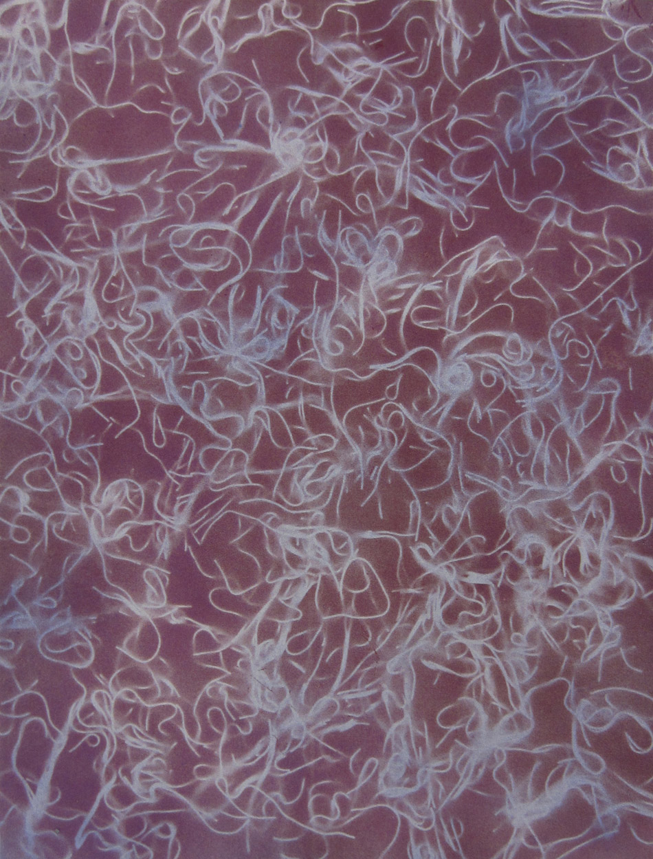 Kadar Brock took the neon paintings from his “failed” series of canvasses from 2005-2008 and in a seeming fit of despair, covered them with various whites, blues and greyed-out paints negating his former exuberance. Folded and pulled, they are then subjected to more angsty torture of sanding, shredding with a razor, more paint and more sanding until Kadar ends up with a result that is a smooth as a baby’s butt; an evocative, ethereal surface. The patterns are dictated largely by a series of 12-sided die rolls and an arbitrary compositional formula attached to the die. How could so much despair and futility, not to mention arbitrariness turn into something so sublime? That is our puzzle.