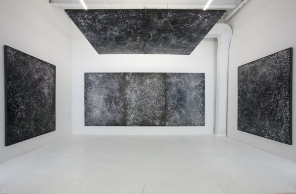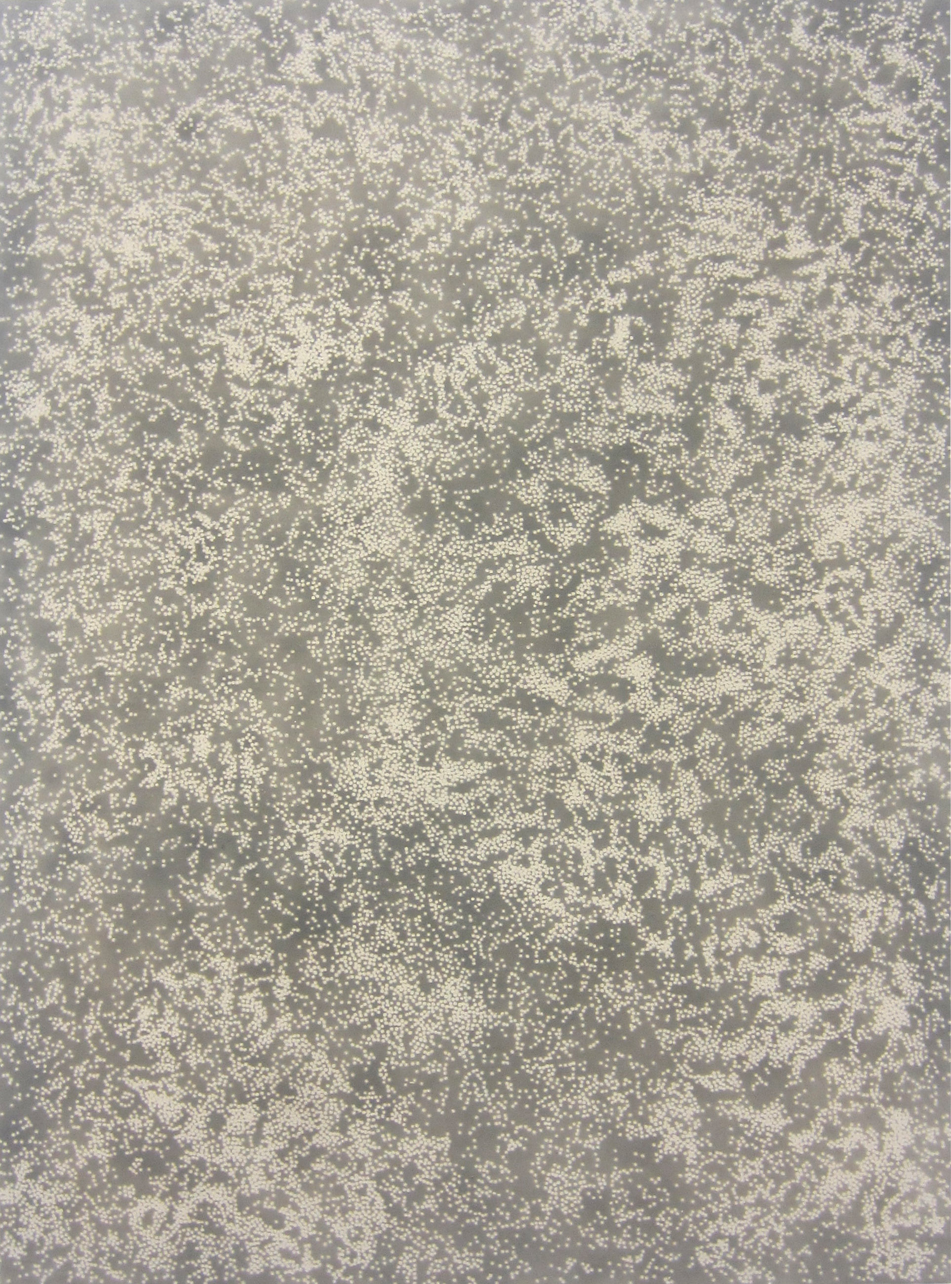 Matt Jones was once told that he needed to hone and focus his use of space. Grumpily he threw white paint onto wet black paint and painted outer space. Whether his peers accepted this as a concerted exploration of space in a painting is unknown; but what he ended up with, perhaps accidentally, is a richly textured, beautifully depth-filled galactic series of abstract paintings. Hiding reds, purples, greens and blues in the rich black, Matt throws white paint onto the surface pulling colors out of the deep void to create small halos of color around each droplet. In case you did not realize that Matt is an abstract artist exploring space, he has hung a planetarium painting above our heads for good measure. While the space paintings are paintings of “everything that exists simultaneously”, his internal energy paintings on the adjacent wall are paintings of the intangibility of experience. They are “the you that you can’t see.”
