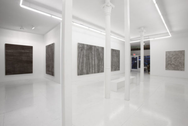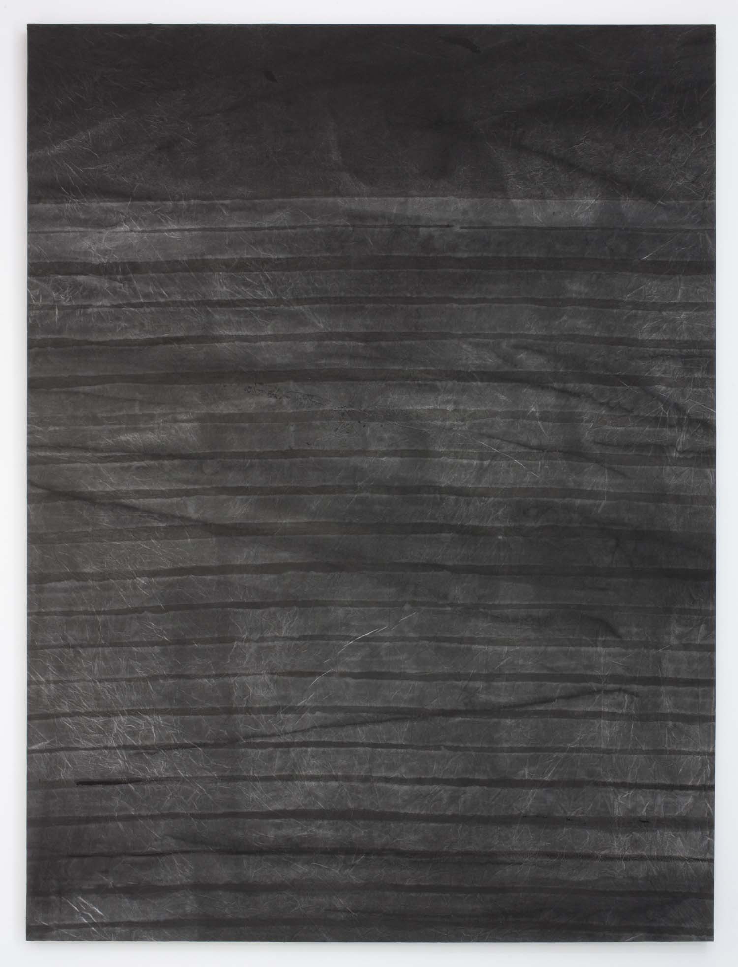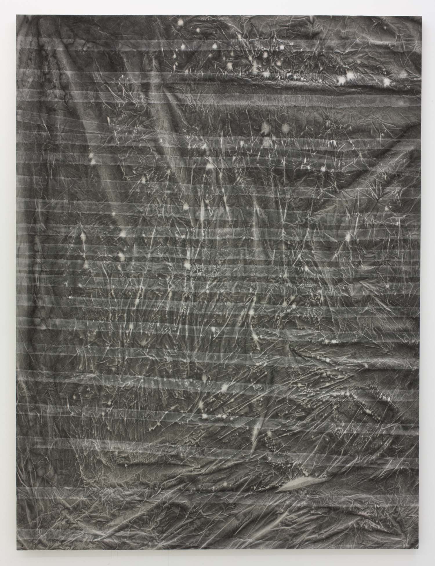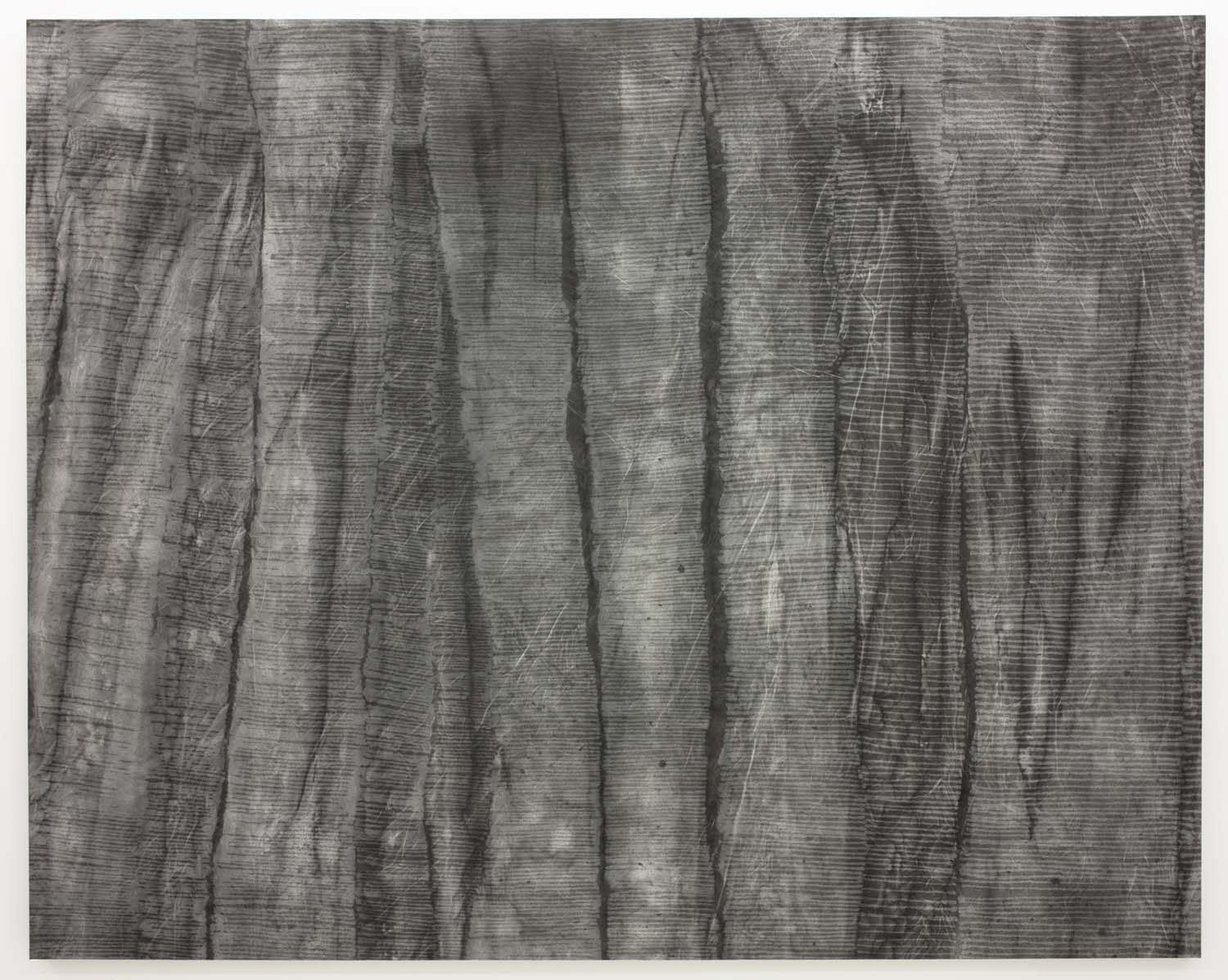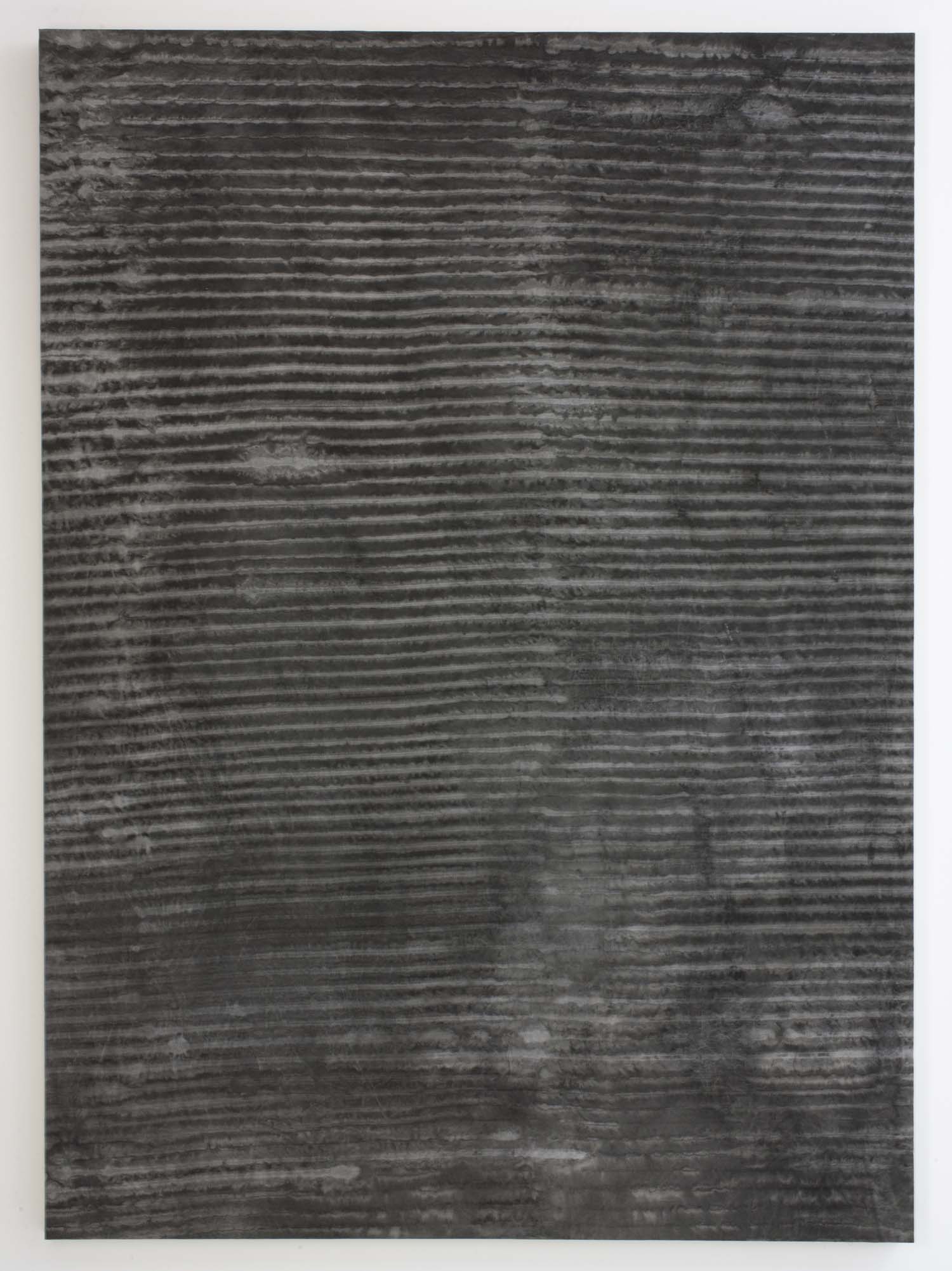 Sam Moyer makes tonal paintings with bleach and dye, treating the canvas as just another swath of cloth, but also turning the canvas into an illusion of fabric with her weaving, patterned strokes and her illusionistic implications of a fluffy duvet cover all puckered and folded. Unlike Morris Louis or the other poured and stained Color Field painters, Sam makes her viewers unable to consider the work as a window into something or a transportation to another place by insisting on the visual reality that they are staring at a piece of cloth mounted onto some wood. The attention to line and tone evoke the considerations one might encounter pondering an Agnes Martin, while her process insists upon the domesticity or even craftiness of her work.