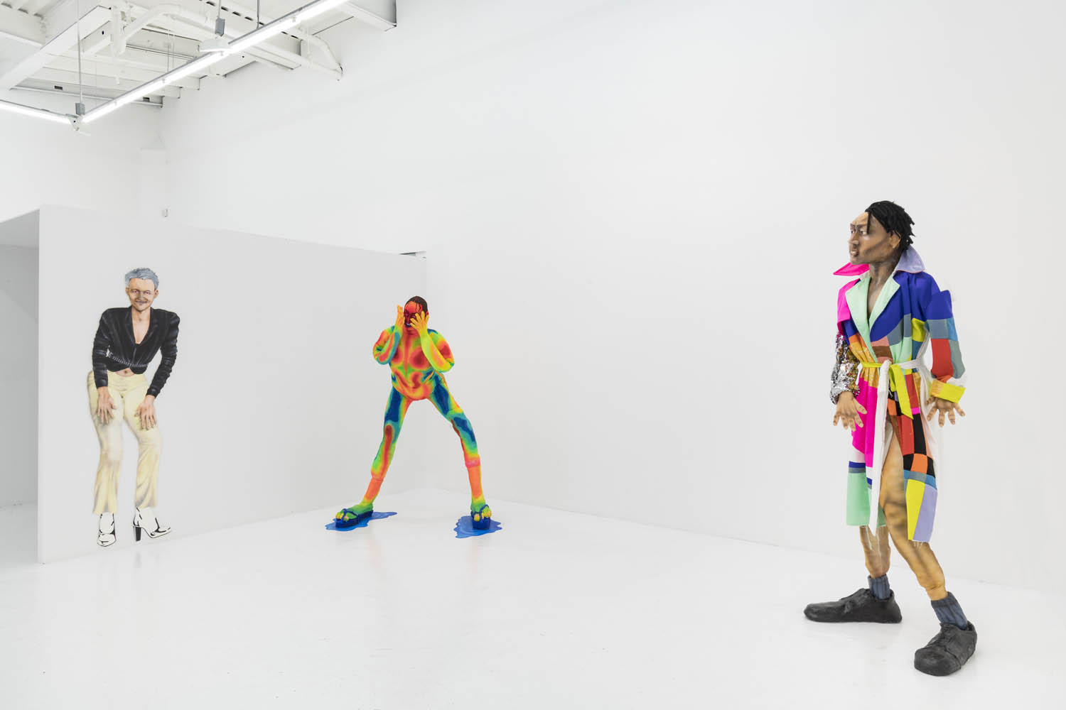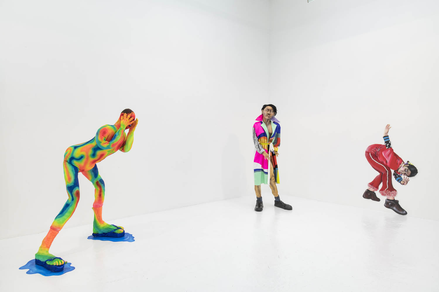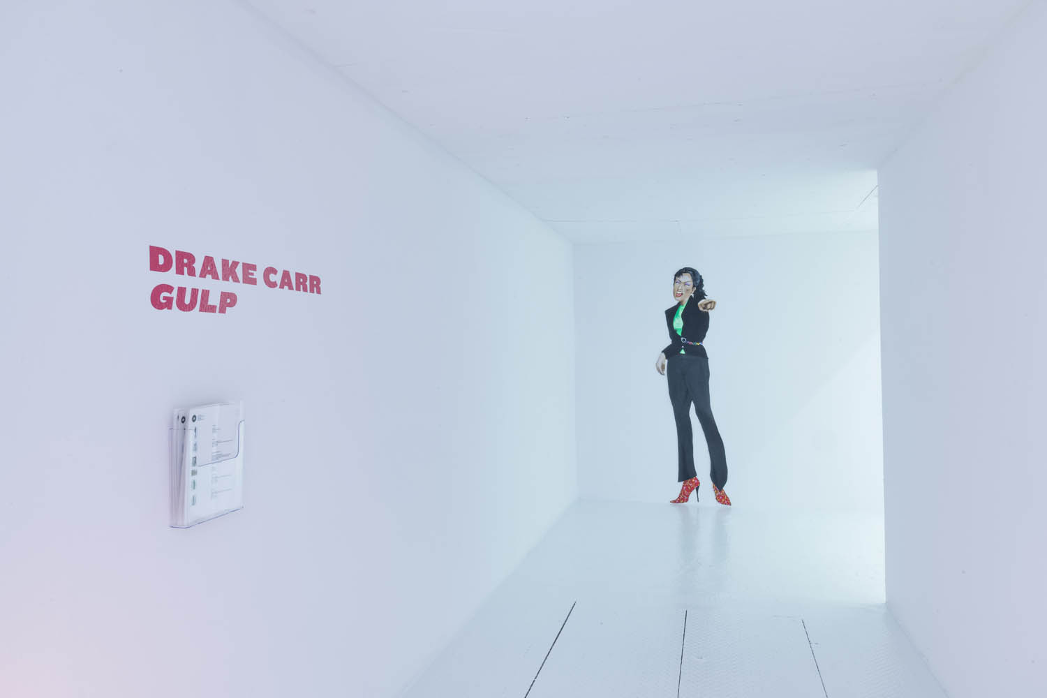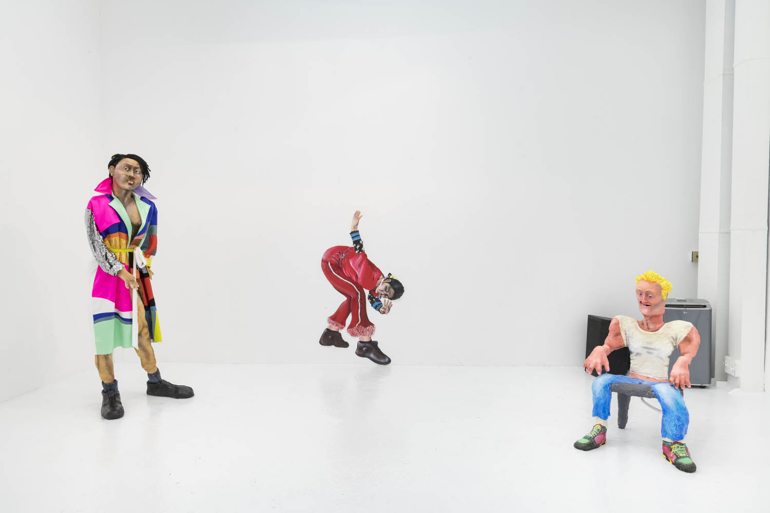 Drake Carr presents Gulp, a new series of figurative sculptures composed in two parts. Like the composition of an album, Carr’s sculptural ensemble segues between genres, time signatures, and themes to populate a scene built of multiple tracks. Irregularities in scale and texture animate and describe the boundaries between each of the figures, casting kaleidoscopic patterning as the crux of the soiree’s representational and interpersonal logic. Stuffed and dressed, bodysuits and armatures shuffle and skip (like a scratched CD) in a warp of orientations.