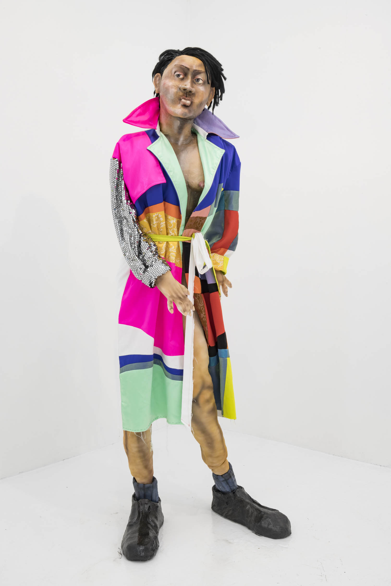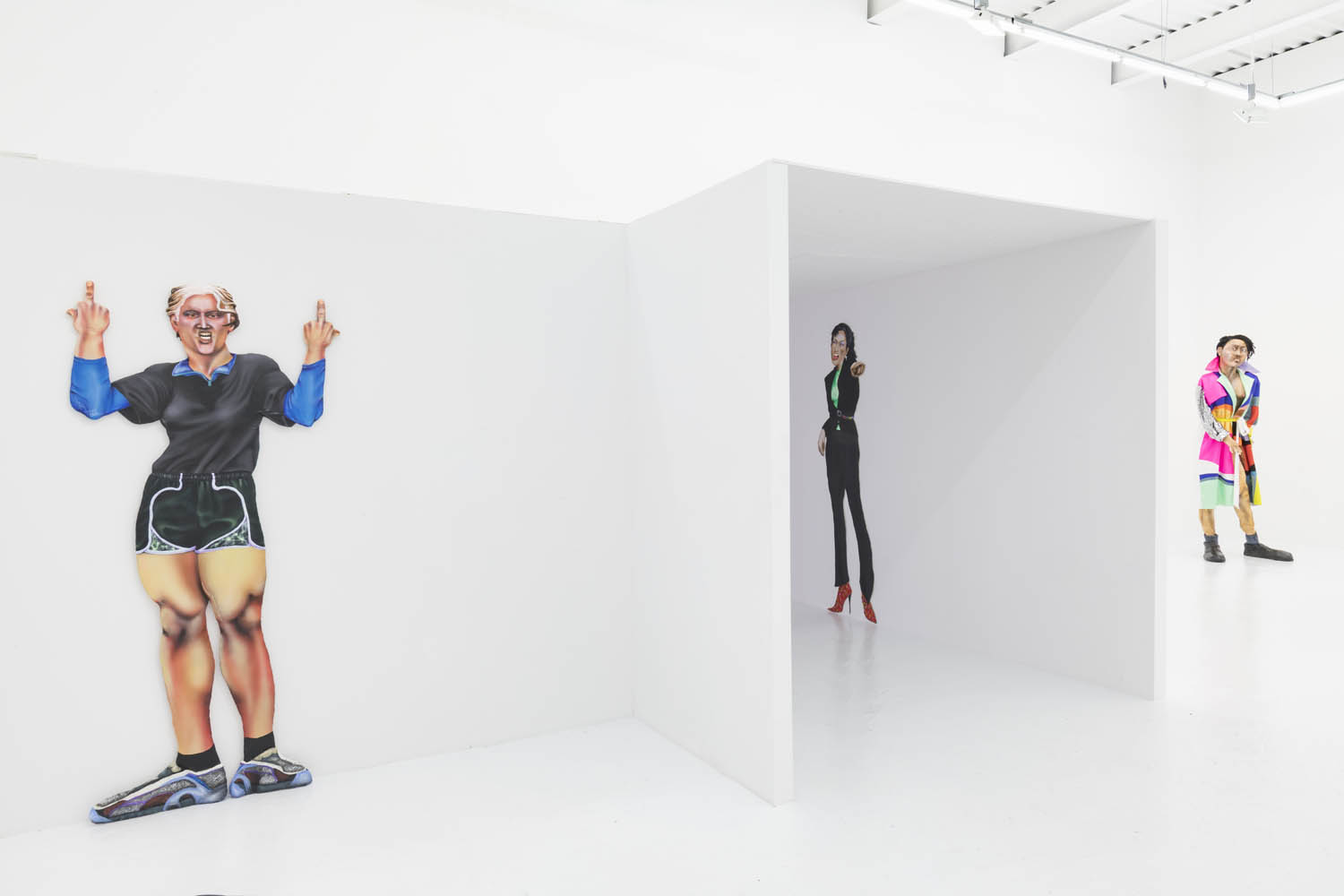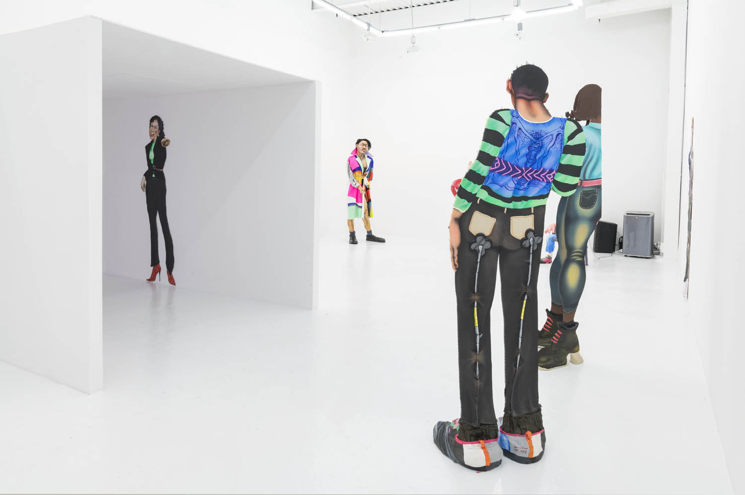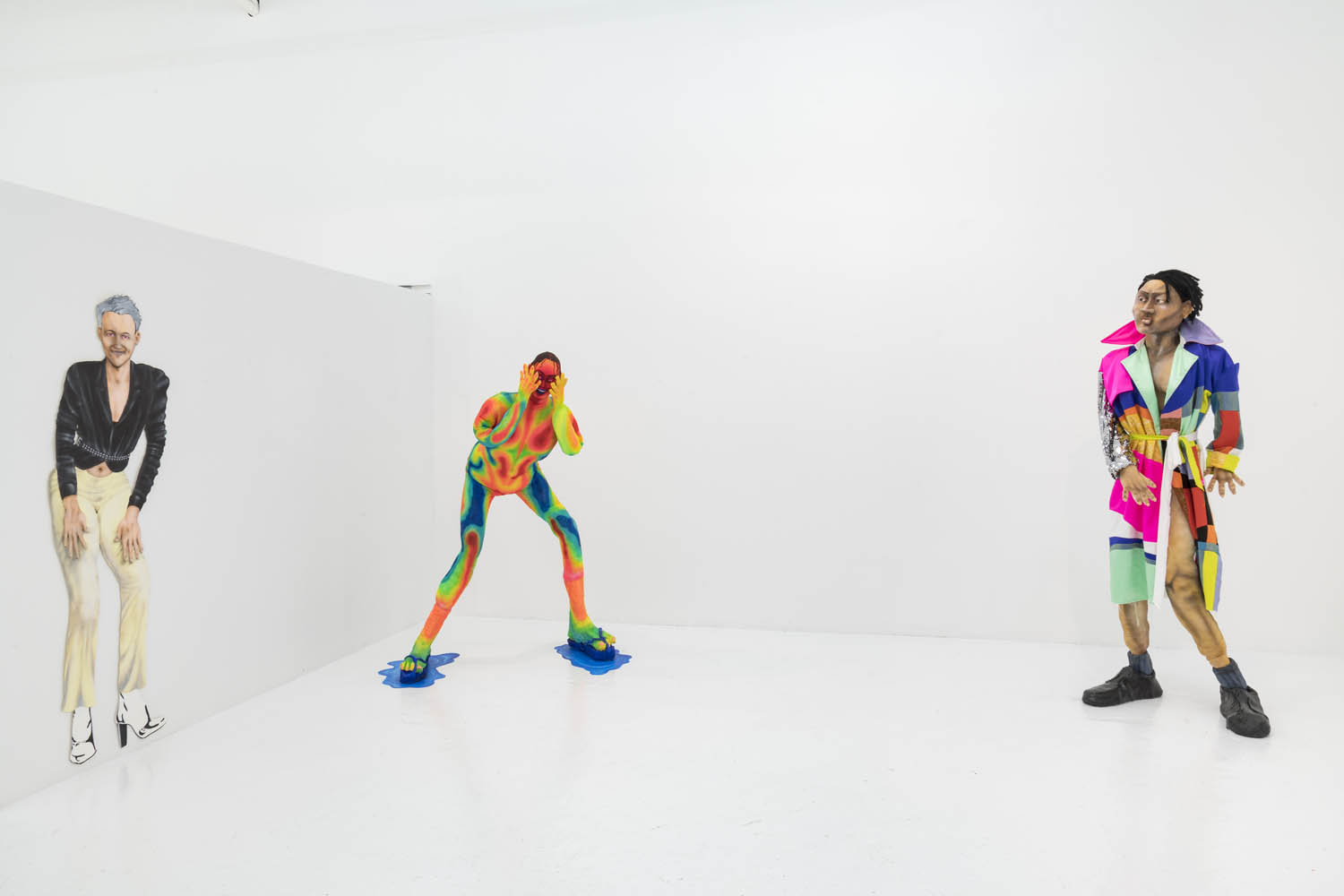 Drake Carr presents Gulp, a new series of figurative sculptures composed in two parts. Like the composition of an album, Carr’s sculptural ensemble segues between genres, time signatures, and themes to populate a scene built of multiple tracks. Irregularities in scale and texture animate and describe the boundaries between each of the figures, casting kaleidoscopic patterning as the crux of the soiree’s representational and interpersonal logic. Stuffed and dressed, bodysuits and armatures shuffle and skip (like a scratched CD) in a warp of orientations.