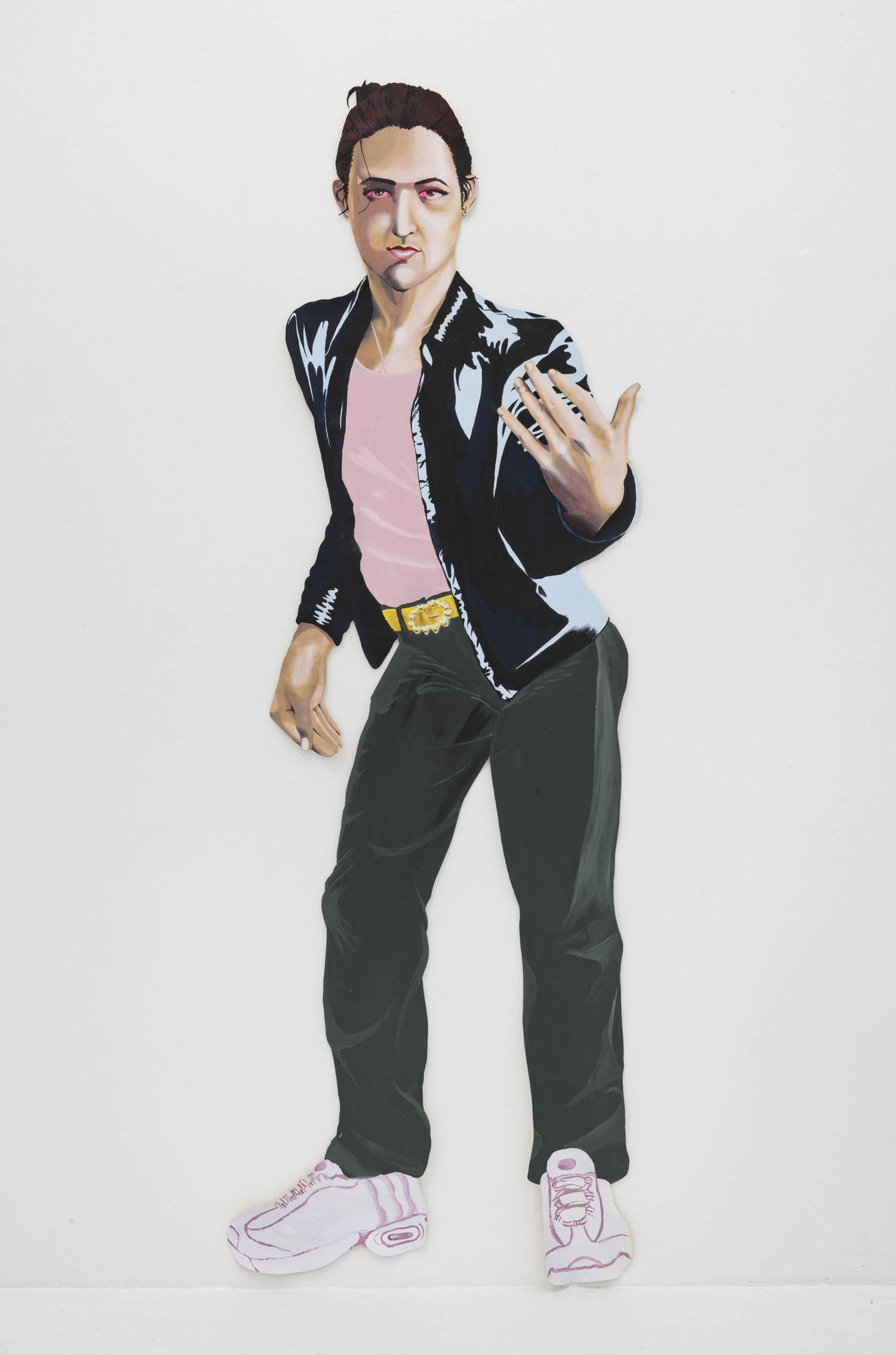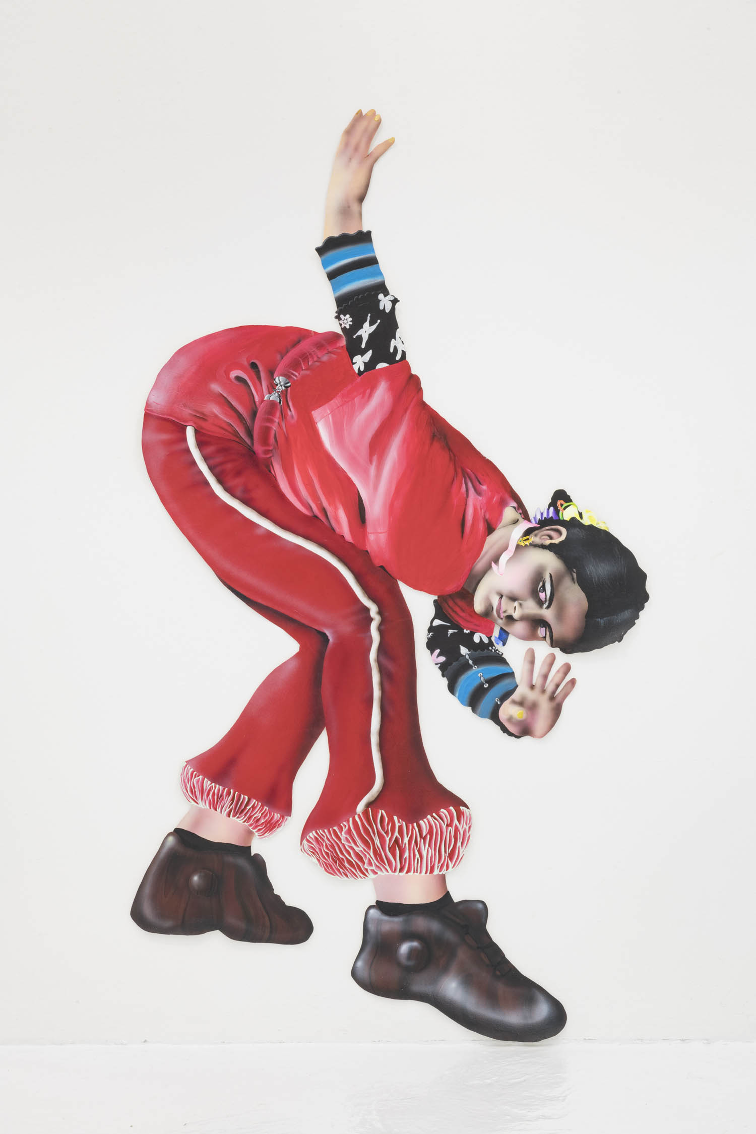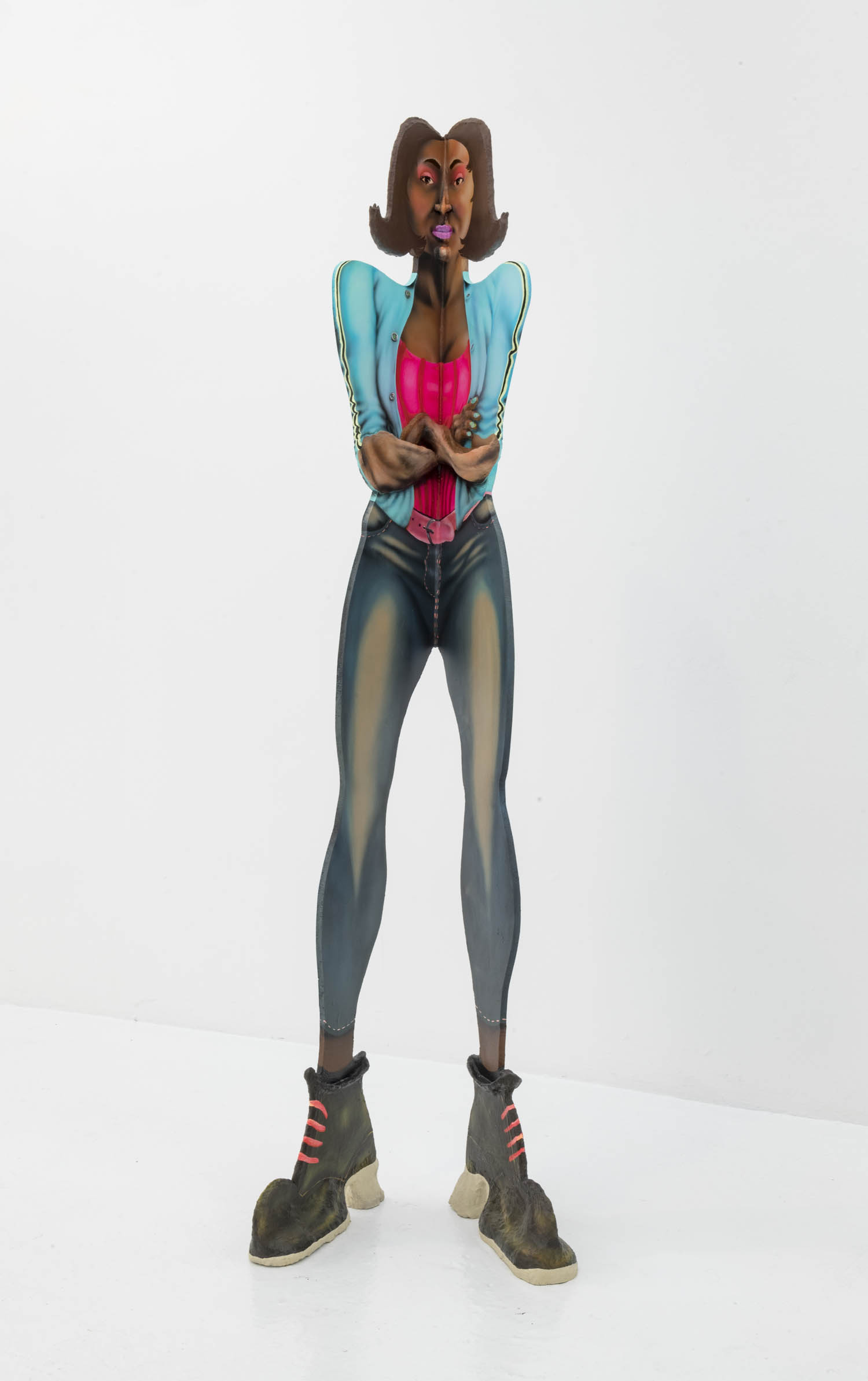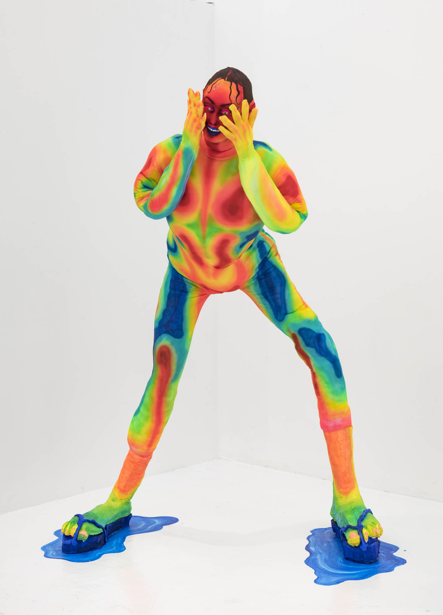 Drake Carr presents Gulp, a new series of figurative sculptures composed in two parts. Like the composition of an album, Carr’s sculptural ensemble segues between genres, time signatures, and themes to populate a scene built of multiple tracks. Irregularities in scale and texture animate and describe the boundaries between each of the figures, casting kaleidoscopic patterning as the crux of the soiree’s representational and interpersonal logic. Stuffed and dressed, bodysuits and armatures shuffle and skip (like a scratched CD) in a warp of orientations.
