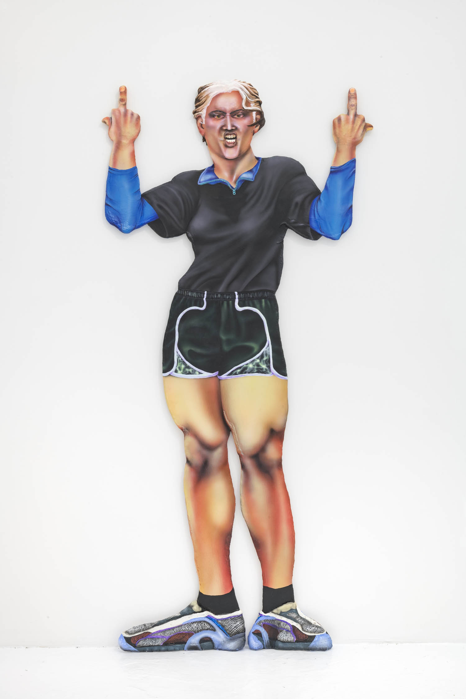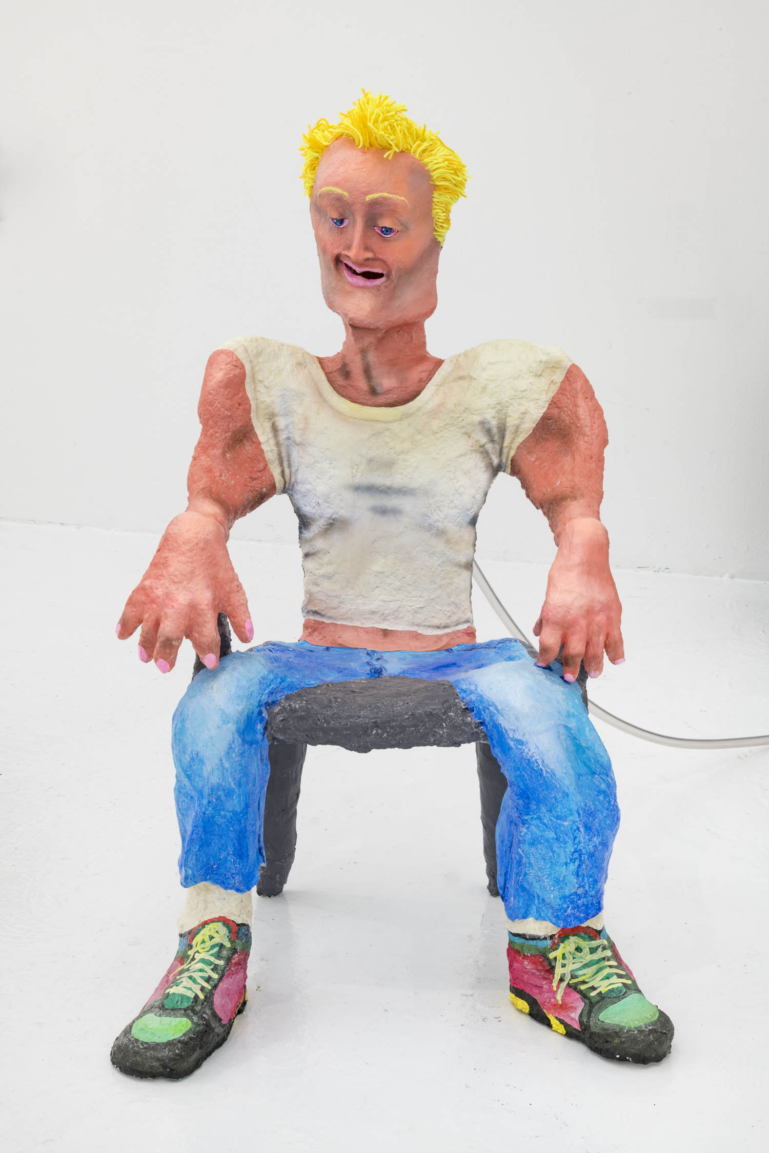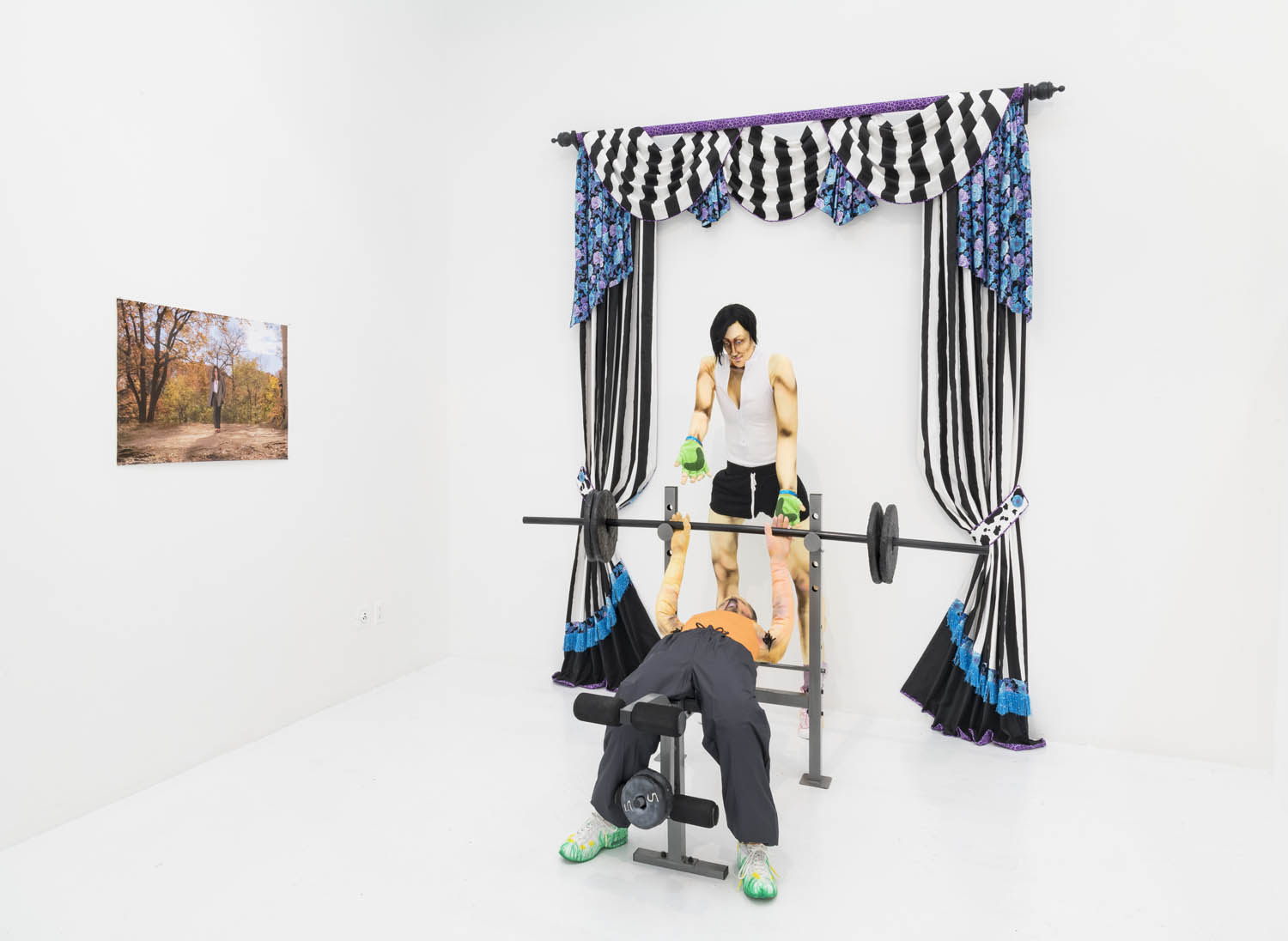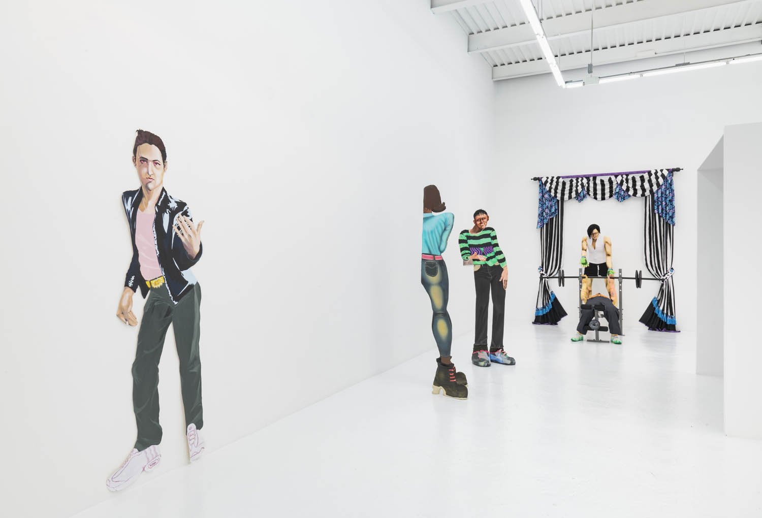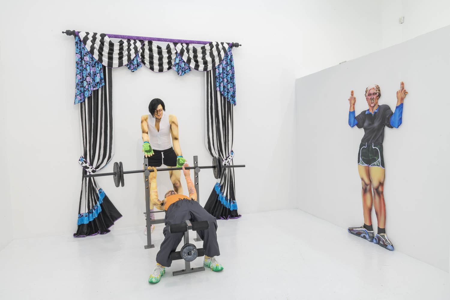 Gulps, bong rips, drips, spits, and sweats echo through the exhibition, combining autobiographical details with social and political matters. The first tableau, a scene in which one figure encounters another whilst bench pressing, Carr saturates with the emotional memory of his parents’ first meeting. Referencing his mother’s window dressing business, Carr frames the tableau with a window treatment co-authored by his mother. In the second room Carr draws, again, from his upbringing in mid-Michigan, to draw attention to Flint’s ongoing water crisis. Posed in fits of sarcasm and frustration, the figures of the second room recall and perform their inability to change the weather. The host of details underpinning the exhibition are not lost in the activity of the works; instead, these details cohere amidst the atmosphere generated by Carr’s time-warped score – a social soundtrack spinning and shuffling signs from the past into patterns of the present.