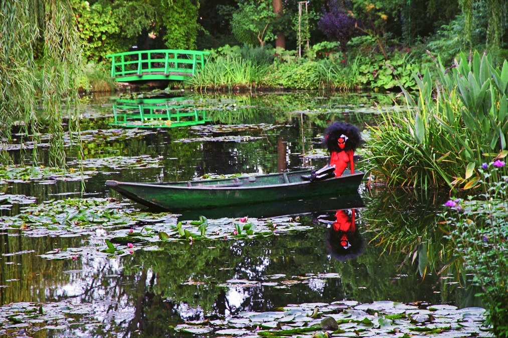 Kembra’s attire, or rather the body-painted and bewigged look that is more sculpture than costuming, presents an interesting alien injection into the almost Disneyland-esque, iconic landscape of Giverny. Her anti-naturalist image is in many ways at odds with the natural growths and overflows. But oddly, as we see in their artworks, this is not so aberrant as one might think: the gardens themselves are in many ways a controlled and sculpted landscape, an illusion of chaos, as Monet coordinated the colors of the plants, and had the gardeners clean soot from passing trains off the lily pads every day. The gardens are a national treasure, a historic landmark frozen in time since Monet lived in a small cottage there and meticulously created a huge, living still life to paint from. Paradoxically, every splash of shrubbery is “just so”, each tulip in place, and it is not too far fetched to imagine a gardener spotting a bug cross the path and putting the bug back into its proper place.