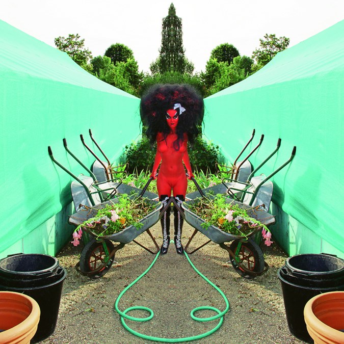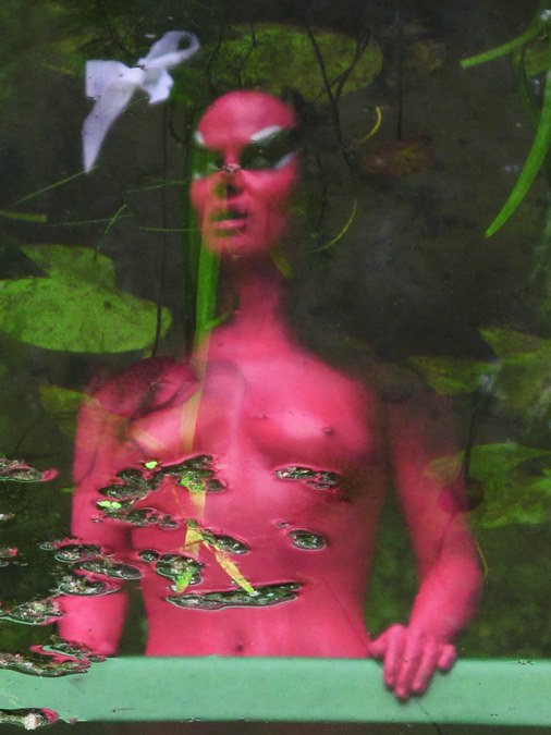 Science and sex are present in this exhibition, as E.V. digitally fictionalizes and manipulates her space. Mimicking the inverted world of the pond’s surface reflections, she bifurcates, splays and refracts her images. Shooting in both the Clos Normand and the Japanese water garden, these artworks complexify the position of objectifier and objectified and explore voyeurism and power. In the same way that Kembra mixes sex and power, beauty and horror, the works hint at the possibility of a bizarre and titillating new sexuality. Perhaps like a water lily itself: solitary, bisexual and radial.