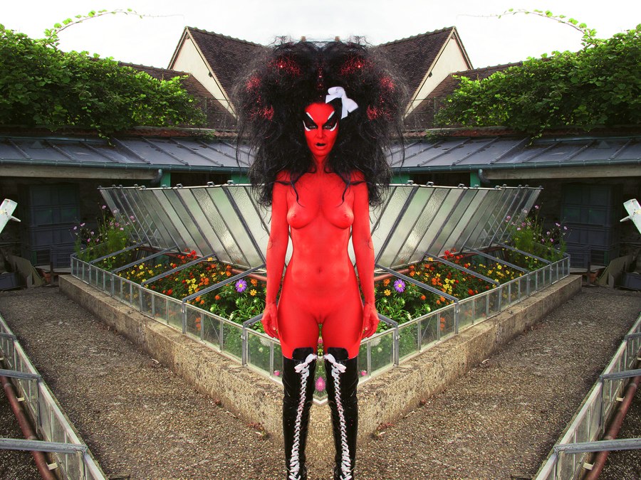 In 2010, E.V. Day was awarded the Munn Artists Residency by the Versailles Foundation, to live on Monet’s famous estate in Giverny, and to be inspired by the gardens. She invited artist Kembra Pfahler to come to Giverny in August—the most fecund, riotous month—to achieve a collaborative project that blends Kembra’s signature performance attire with the lush verdure of the natural setting and E.V.’s signature refracted photography.