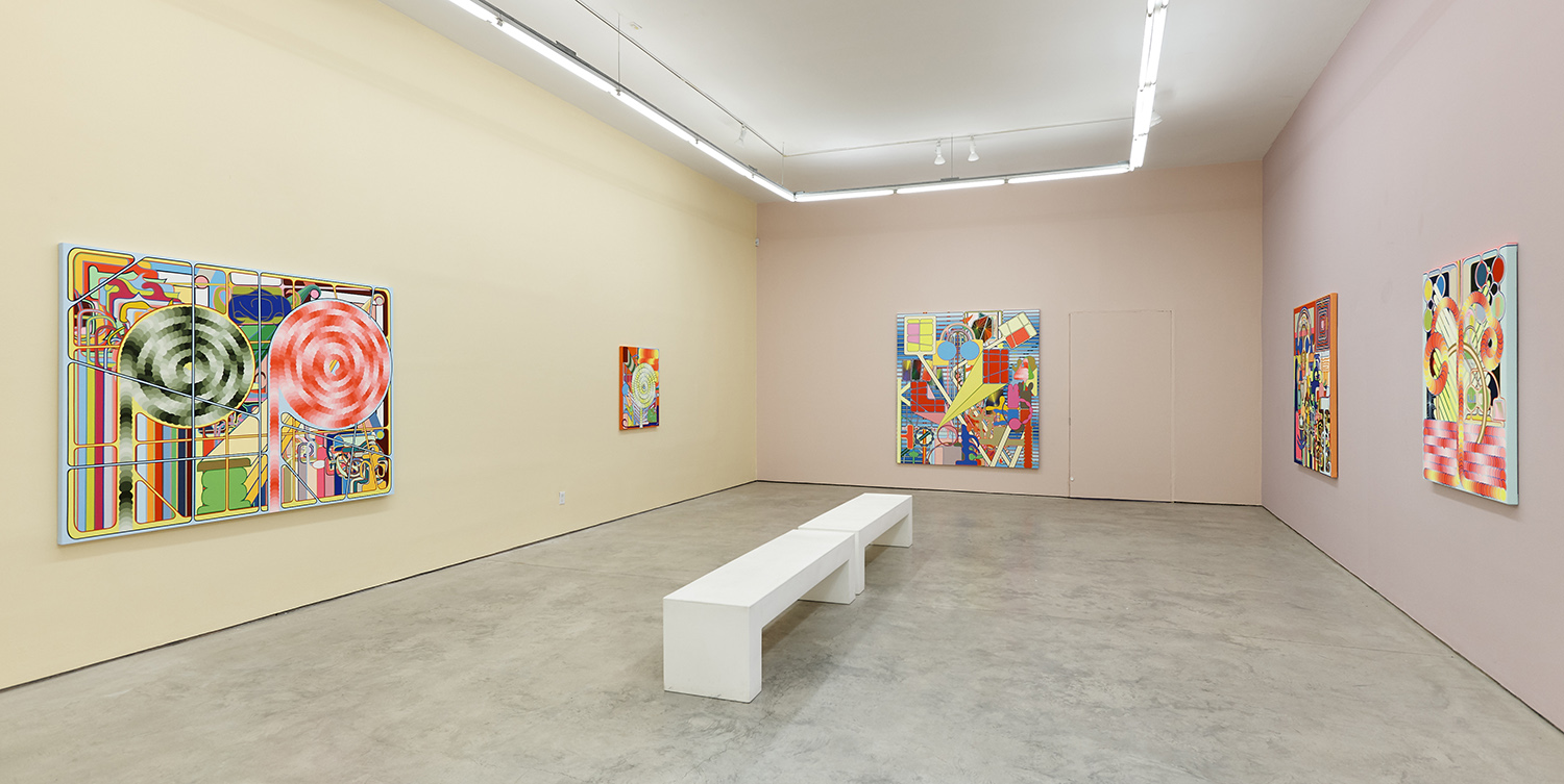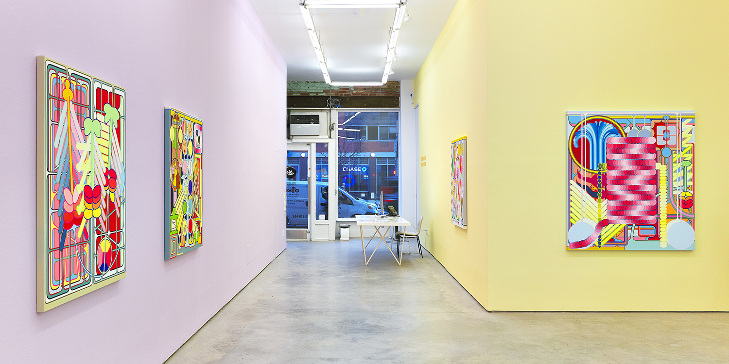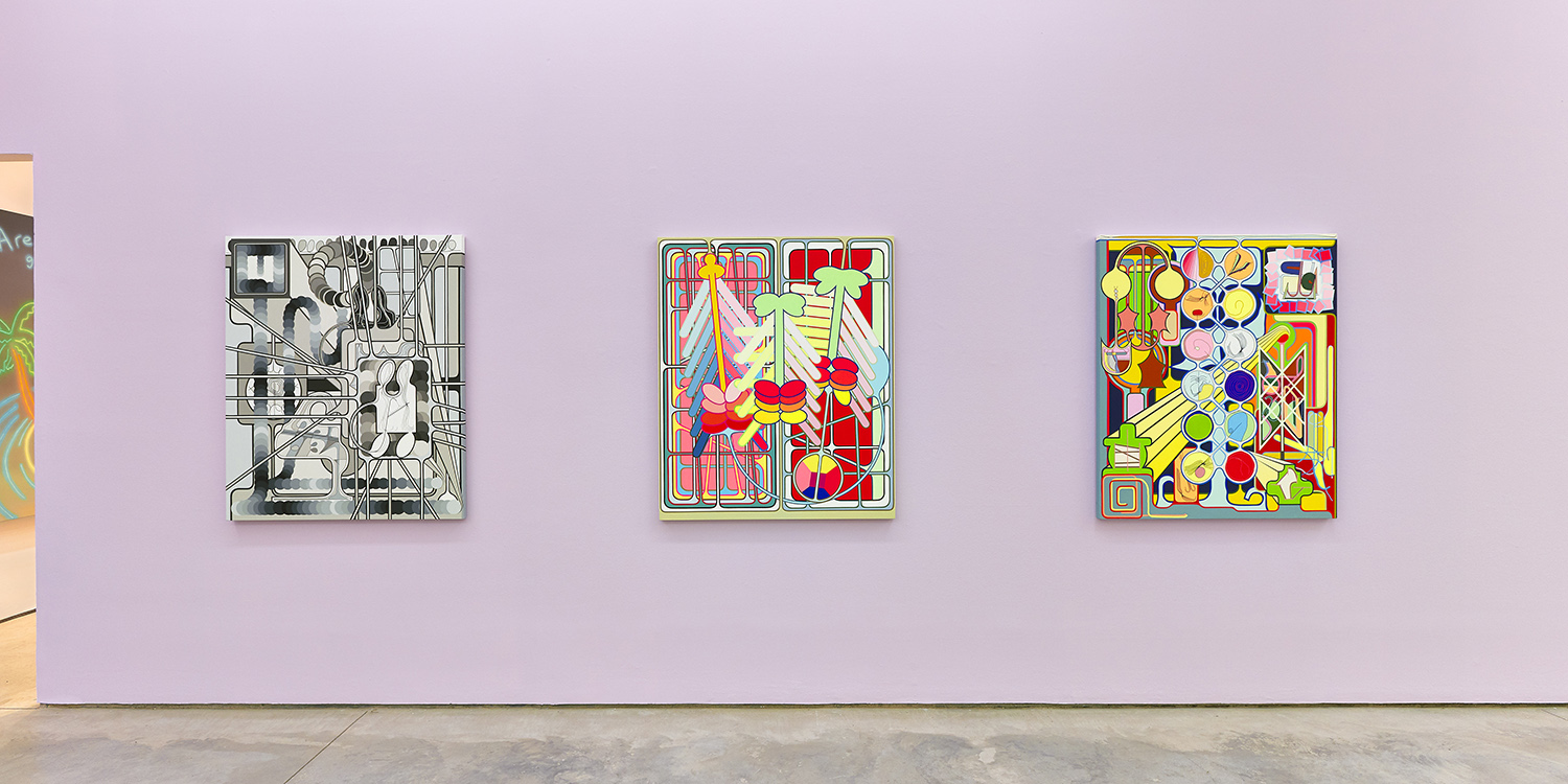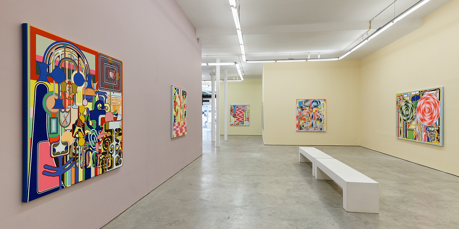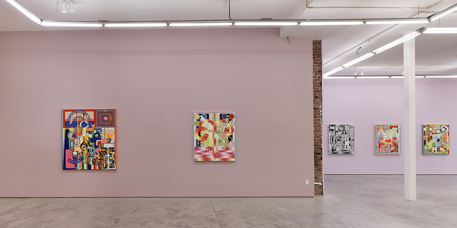 Using semi-familiar forms culled from logos and signage on the streets of New York, Shaw riffs on and remixes a repertoire of shapes and color gradients. Sketching on his phone in a rudimentary drawing program and bonking back and forth between screen and canvas, the artist invents and elaborates without a sketch or plan as his ideas proliferate.