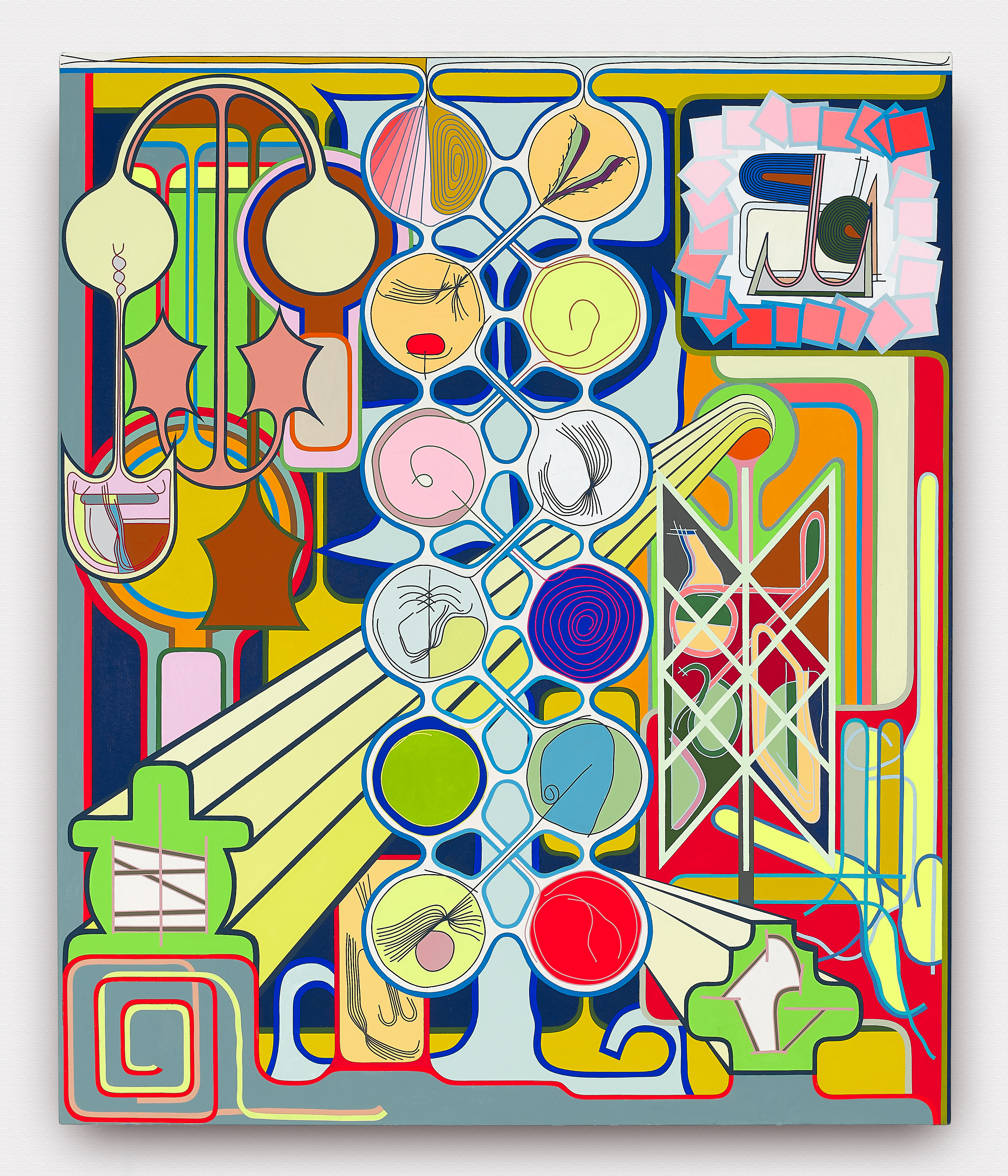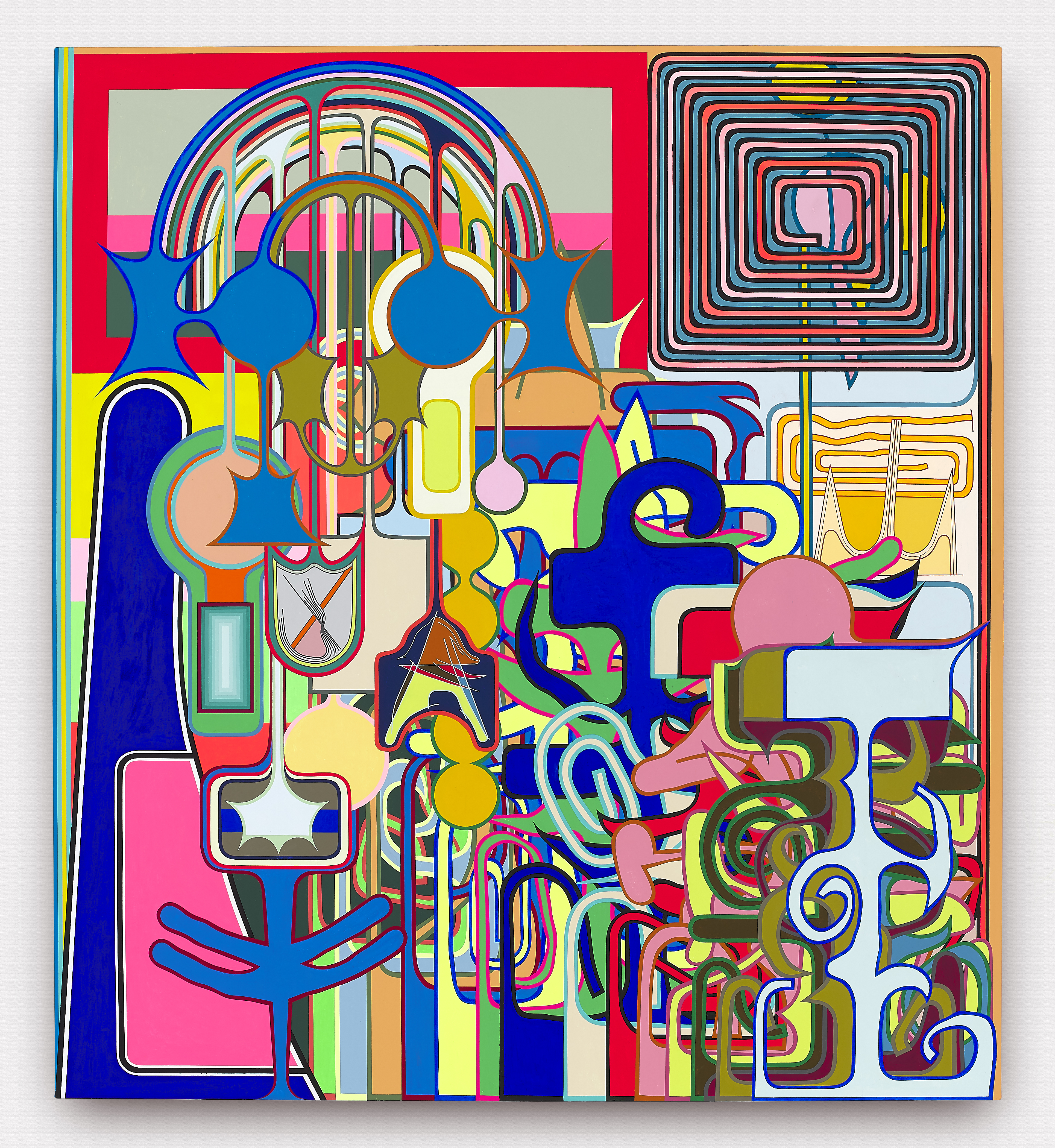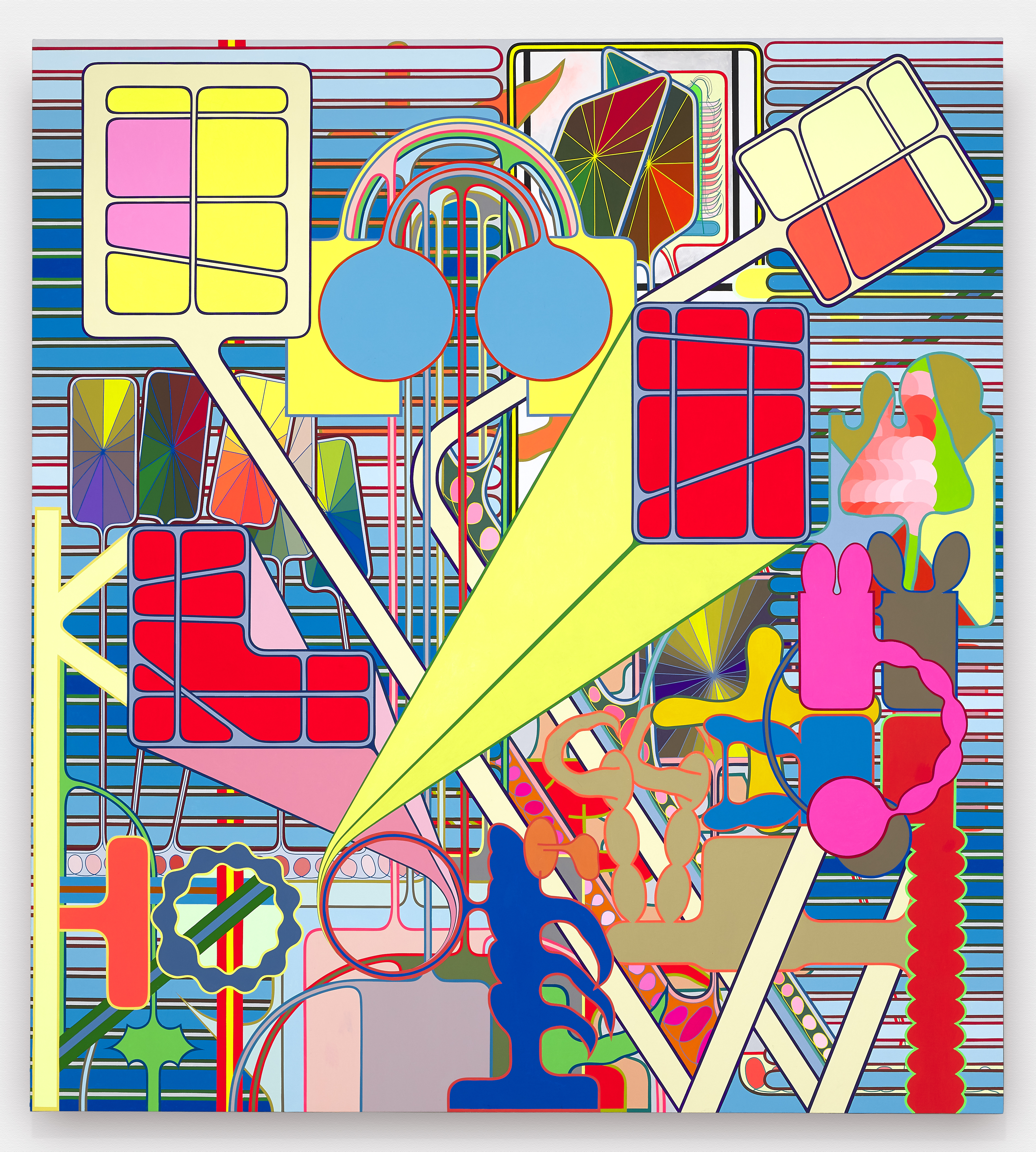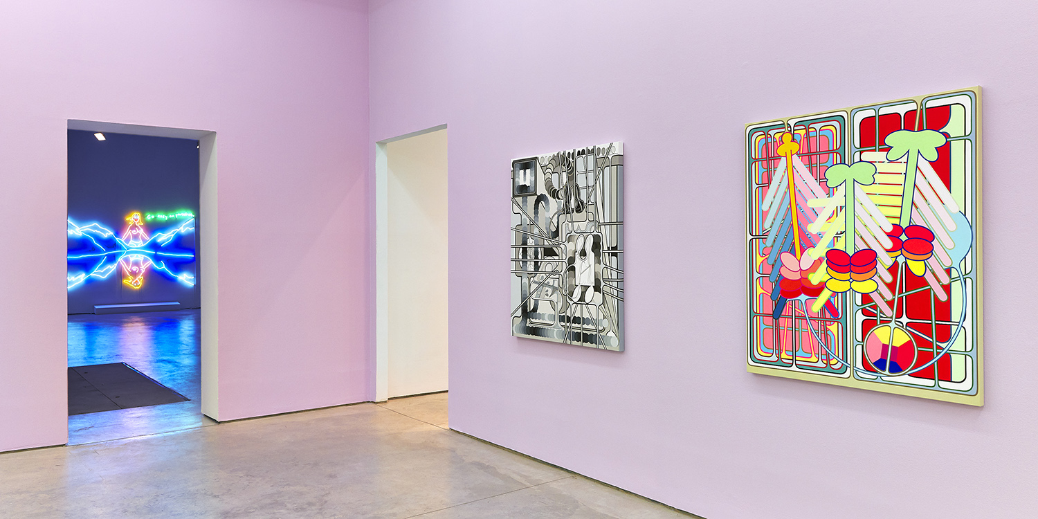 Using semi-familiar forms culled from logos and signage on the streets of New York, Shaw riffs on and remixes a repertoire of shapes and color gradients. Sketching on his phone in a rudimentary drawing program and bonking back and forth between screen and canvas, the artist invents and elaborates without a sketch or plan as his ideas proliferate.