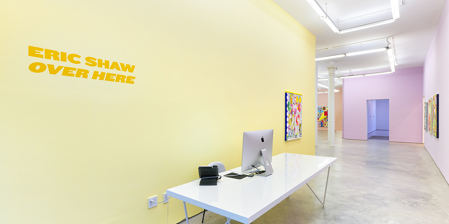 Over Here is the second solo show at the Hole of paintings by Eric Shaw. Eleven scintillating new canvases will dazzle your eyes and scramble your brains as this digital-era abstract painter levels up.