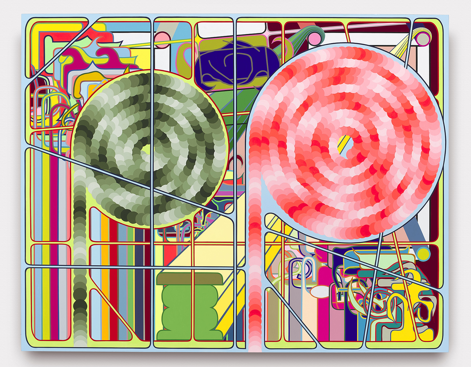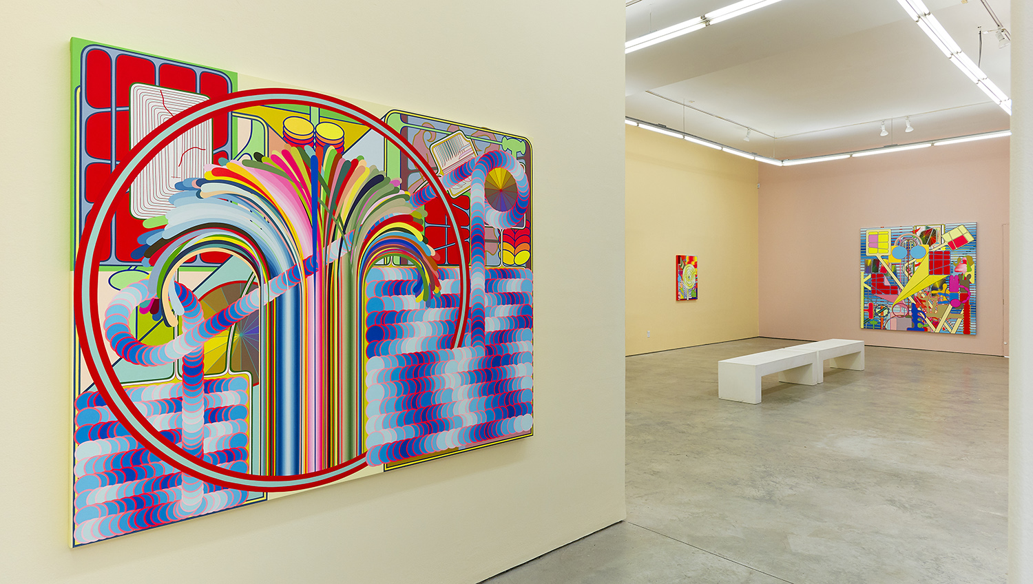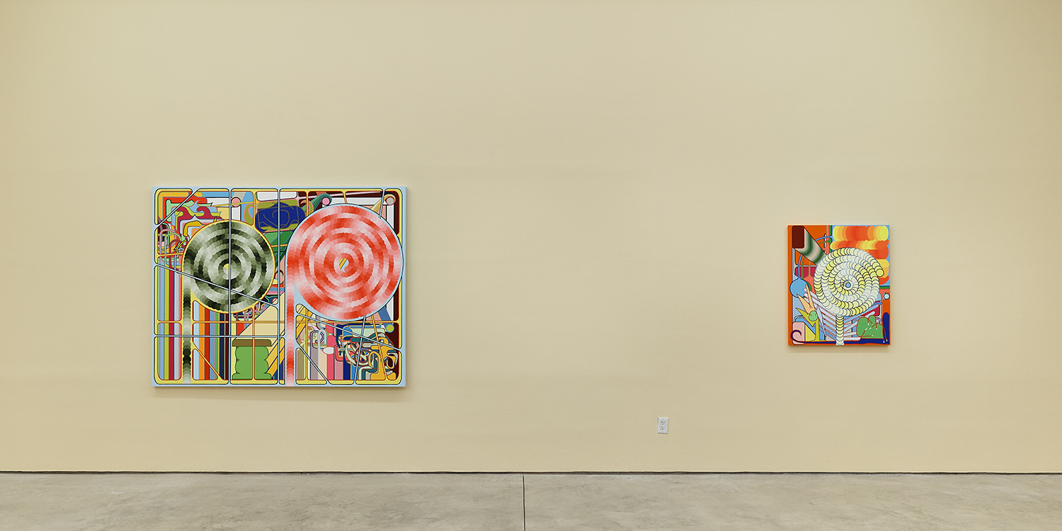 A mind-boggling cathedral of tape is used to paint all these perfect bits of color and the order of operations so that no bits overlap is bonkers. A string of discs weaves through a 49-color fountain in one work, and I defy you to figure out how the artist puzzled through it. The mathematical and geometric precision of the works presents in stark contrast to the playfulness, improvisation and joy in the compositions.
