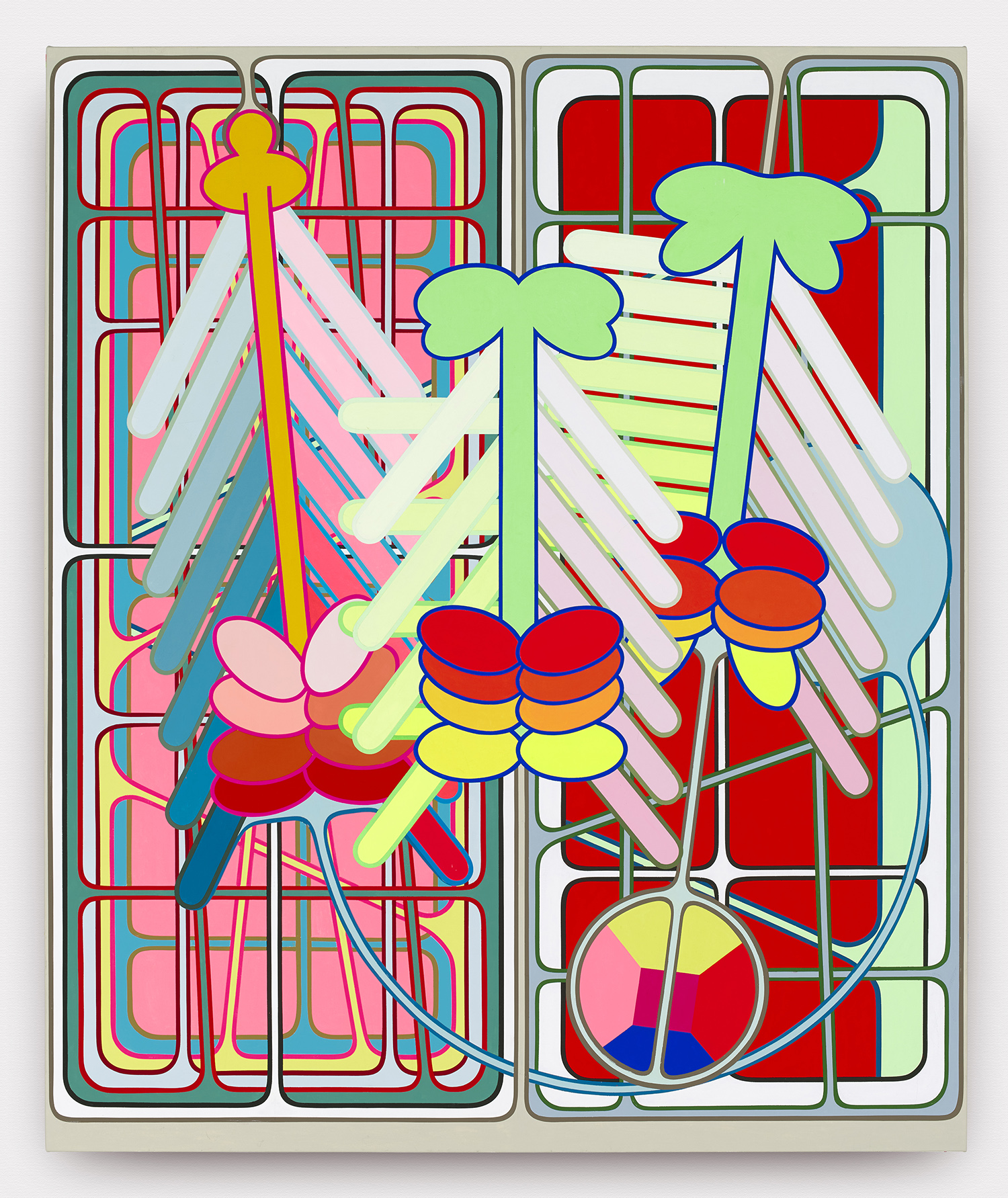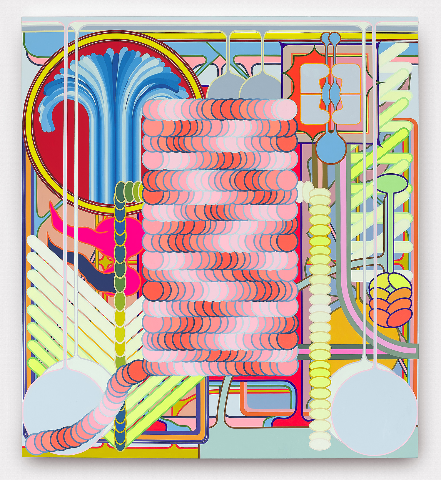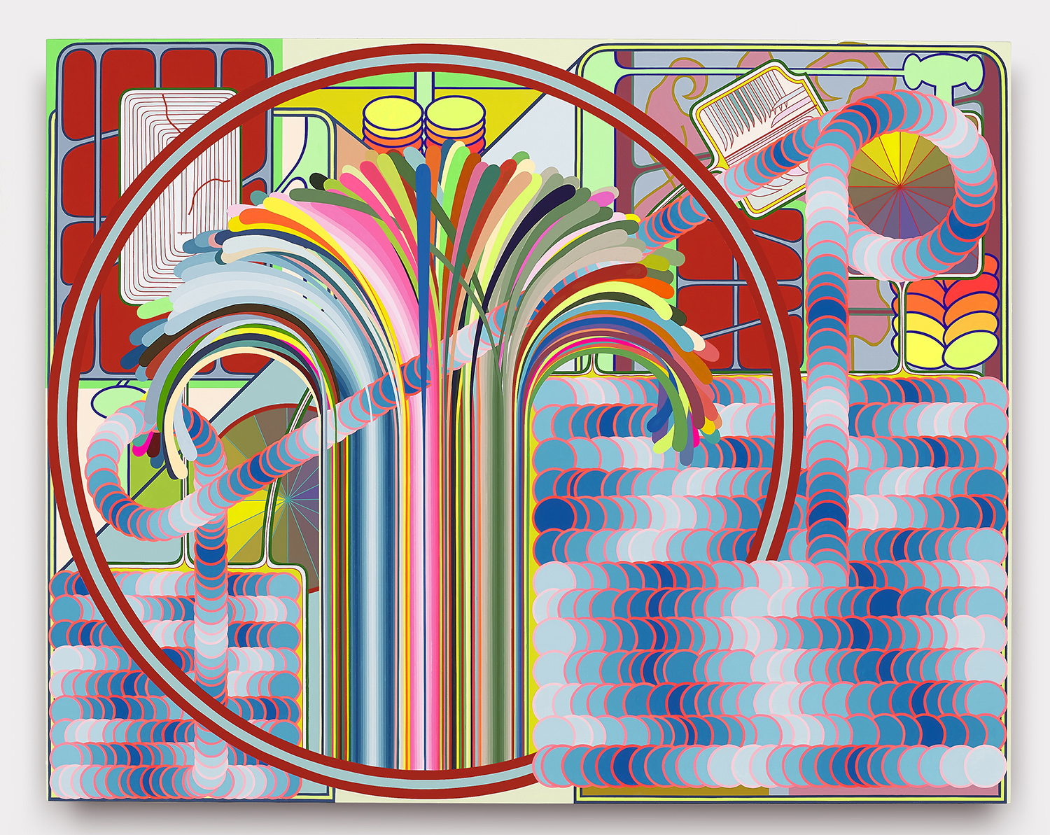 A mind-boggling cathedral of tape is used to paint all these perfect bits of color and the order of operations so that no bits overlap is bonkers. A string of discs weaves through a 49-color fountain in one work, and I defy you to figure out how the artist puzzled through it. The mathematical and geometric precision of the works presents in stark contrast to the playfulness, improvisation and joy in the compositions.