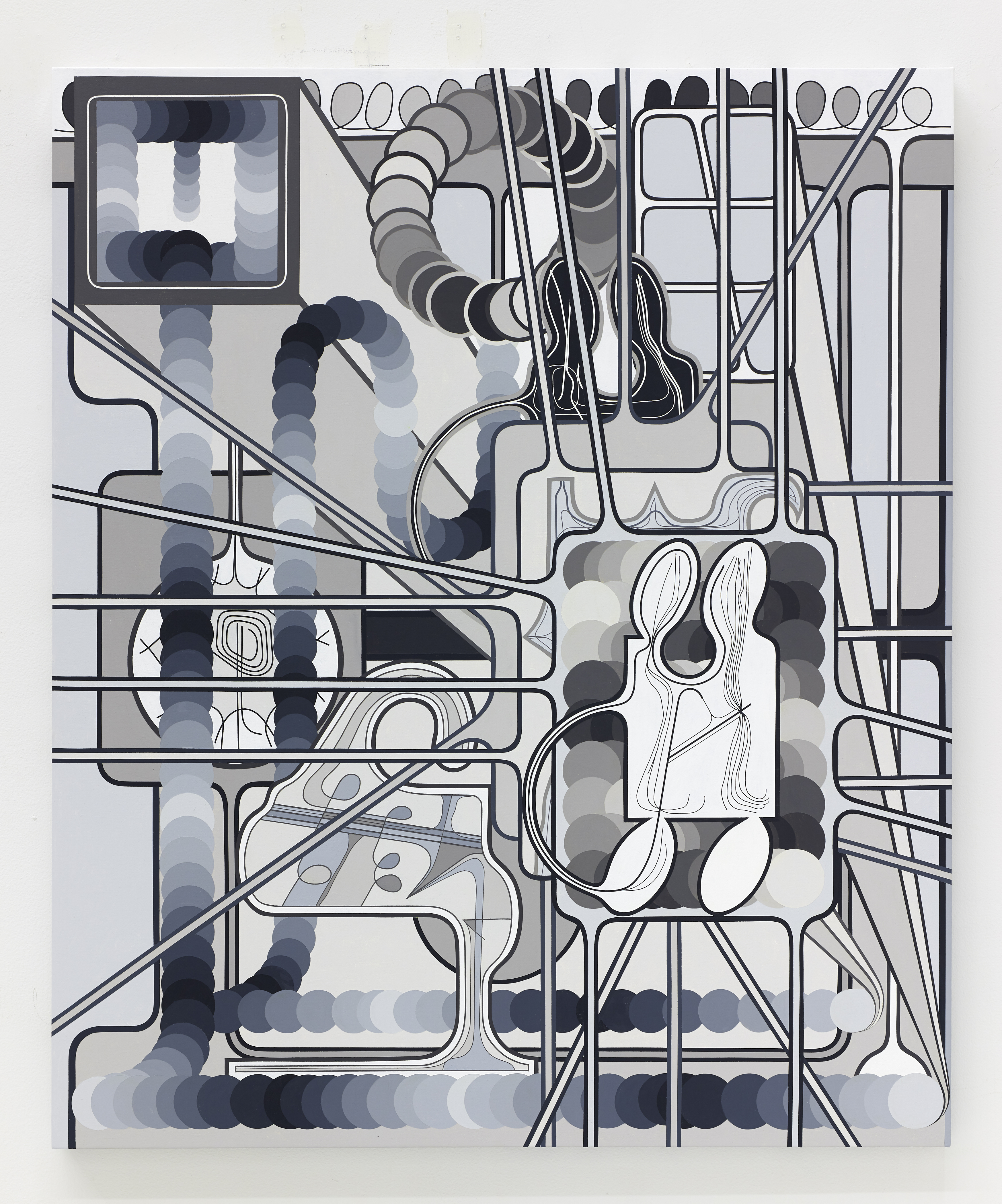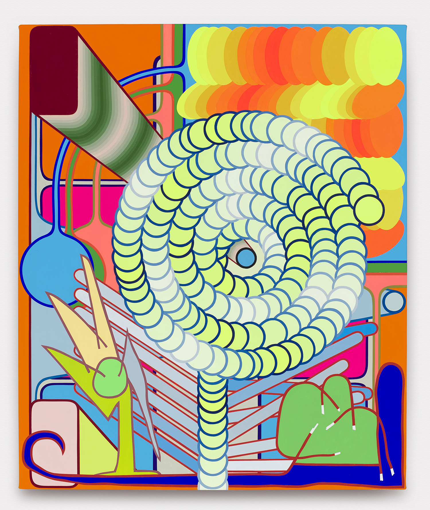 Like Peter Halley or Jonathan Lasker, Shaw is not after abstraction purity tests and instead presents a semi-pictorial abstract arrangement in space. This suite of paintings feature exotic elaborations of discs that suggest poker chips or Pachinko machines in their suggested motion. Fountain motifs continue in this new body of work as do petri-dish structures and inner ear bone Yves Tanguy times. Eggs, pendulums and lolly-pops; feathers, fans and organelles: your brain and eyes continue over the compositions with nowhere to rest but everywhere to get activated.