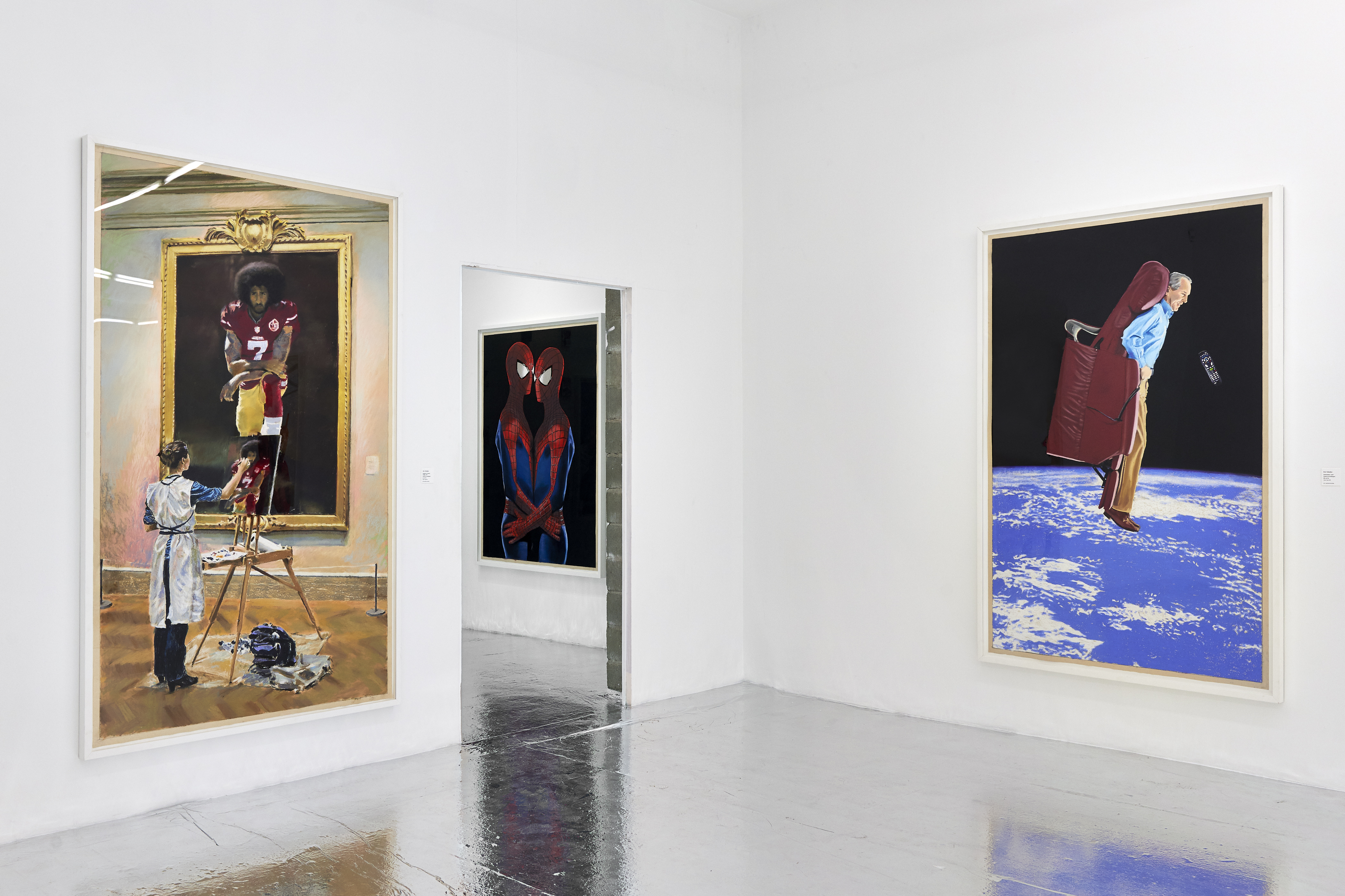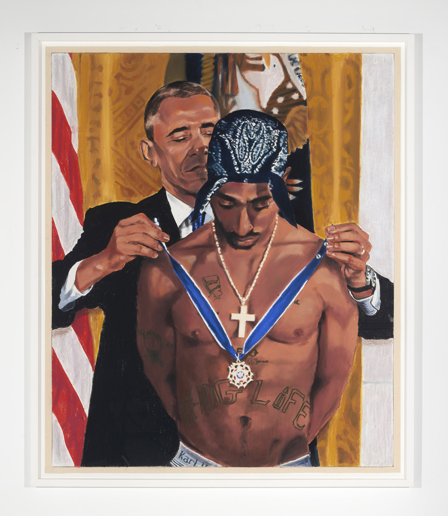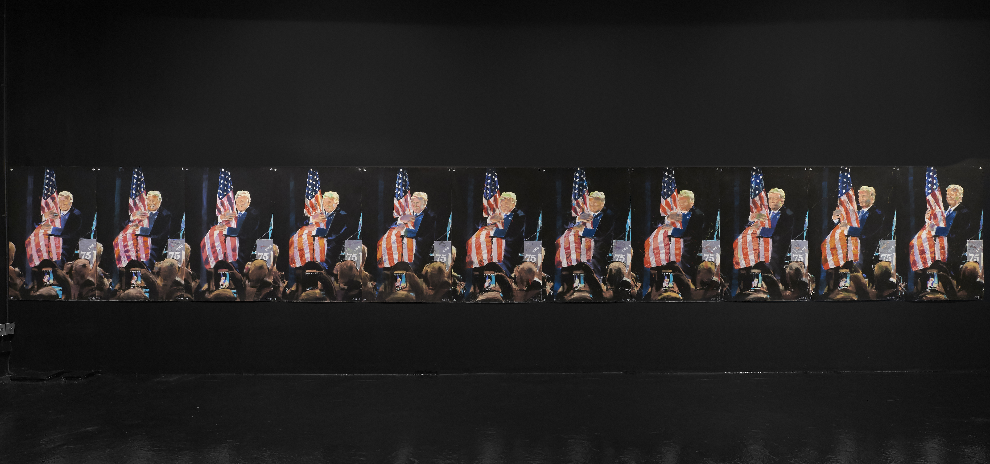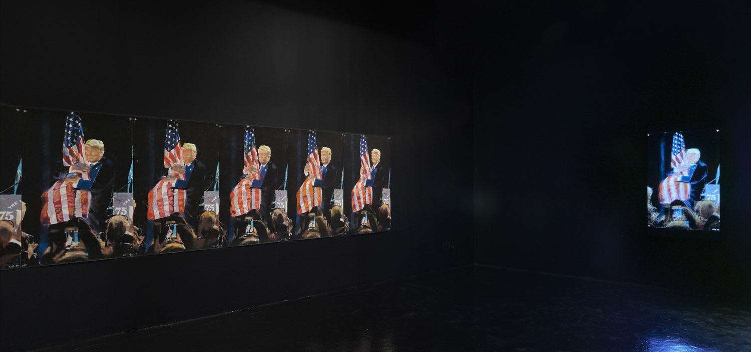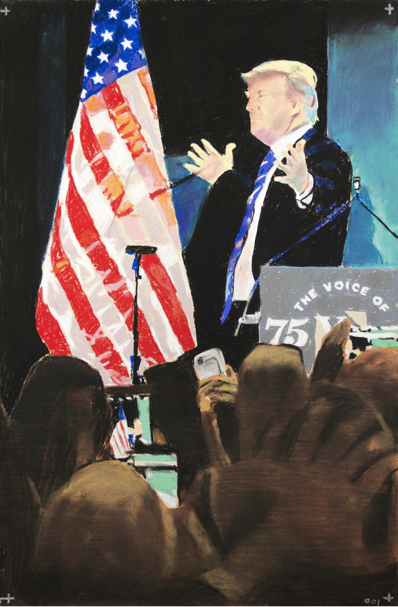 Gallery 3 is dedicated to one single piece, a series of 29 works that in order comprise sequential frames of an animation. “Orange Privilege” is a hybrid drawing and video piece where each frame of a clip was executed in pastel, from the blurry odd frames to the sharper focus I-frames, retaining some digital video artifacts and crunchy bits of erratic color. The scene it captures is only 3 seconds long but deeply disturbing; Donald Trump bear-hugs the American flag with an insipid grin on his face above a throng of reporters with iPhones looking on.