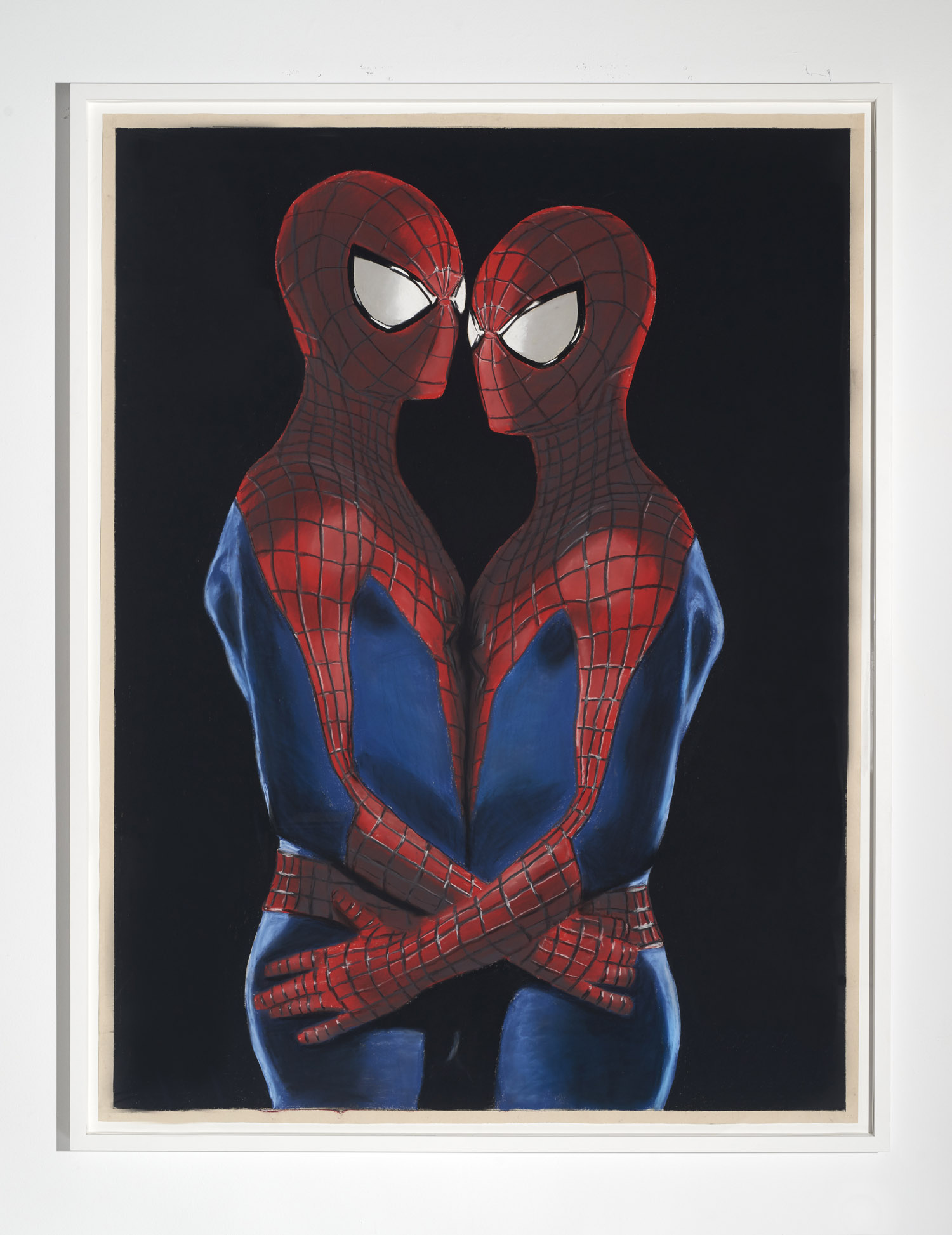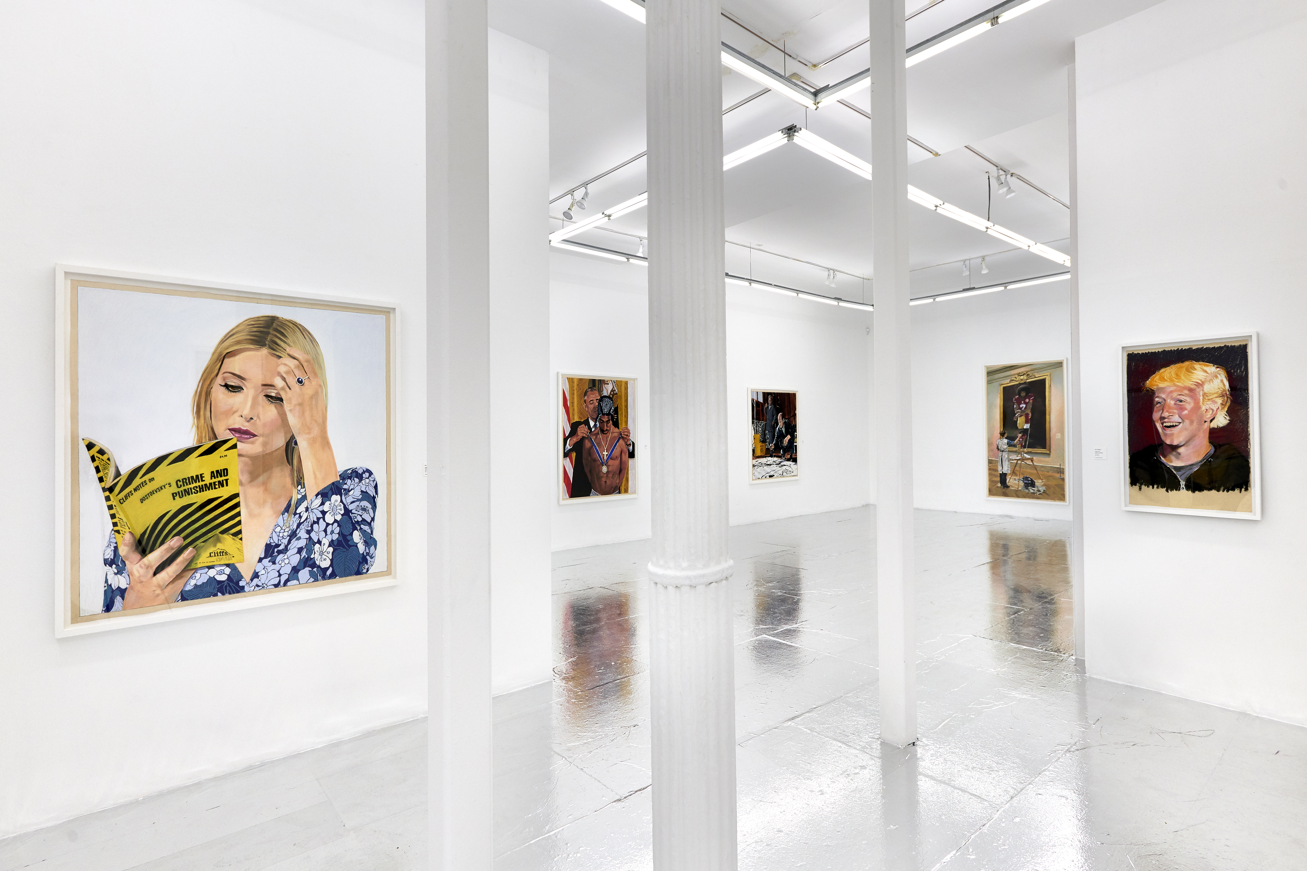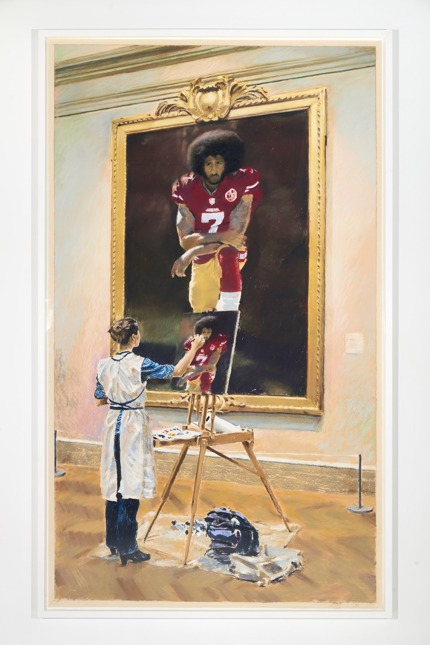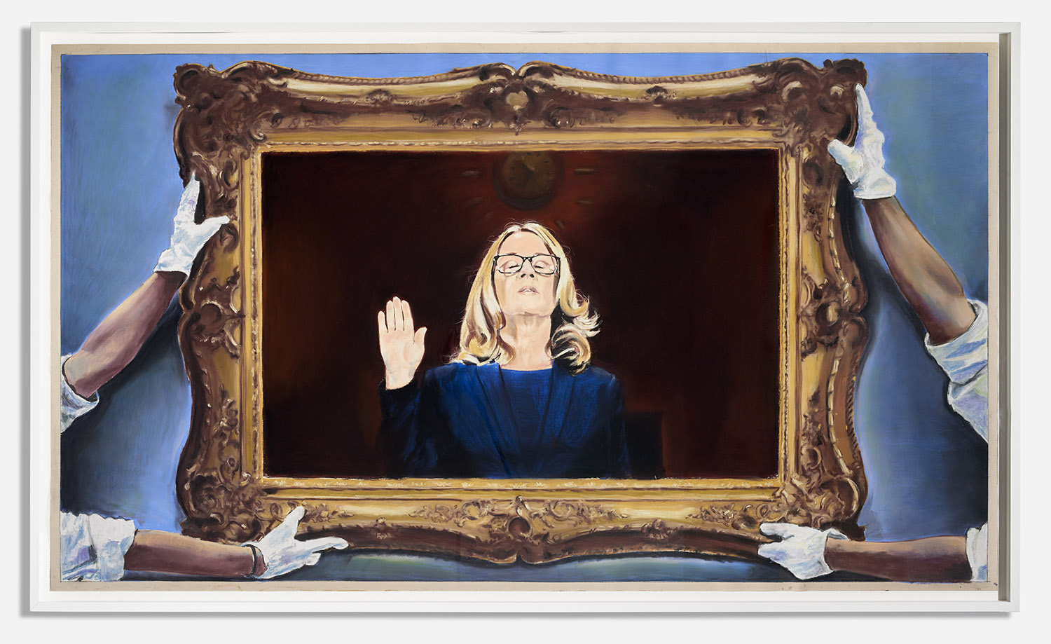Gallery 3 is dedicated to one single piece, a series of 29 works that in order comprise sequential frames of an animation. “Orange Privilege” is a hybrid drawing and video piece where each frame of a clip was executed in pastel, from the blurry odd frames to the sharper focus I-frames, retaining some digital video artifacts and crunchy bits of erratic color. The scene it captures is only 3 seconds long but deeply disturbing; Donald Trump bear-hugs the American flag with an insipid grin on his face above a throng of reporters with iPhones looking on.