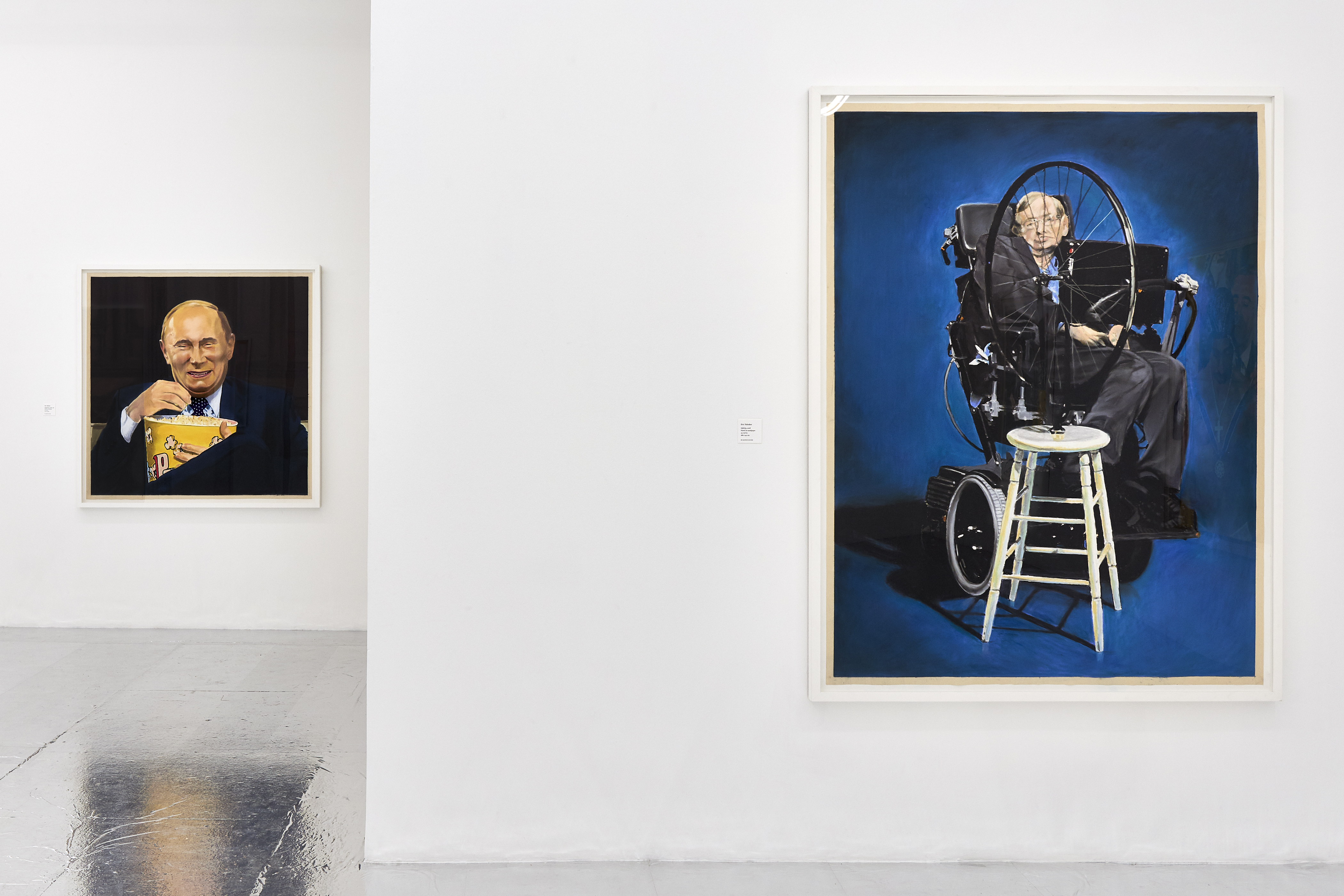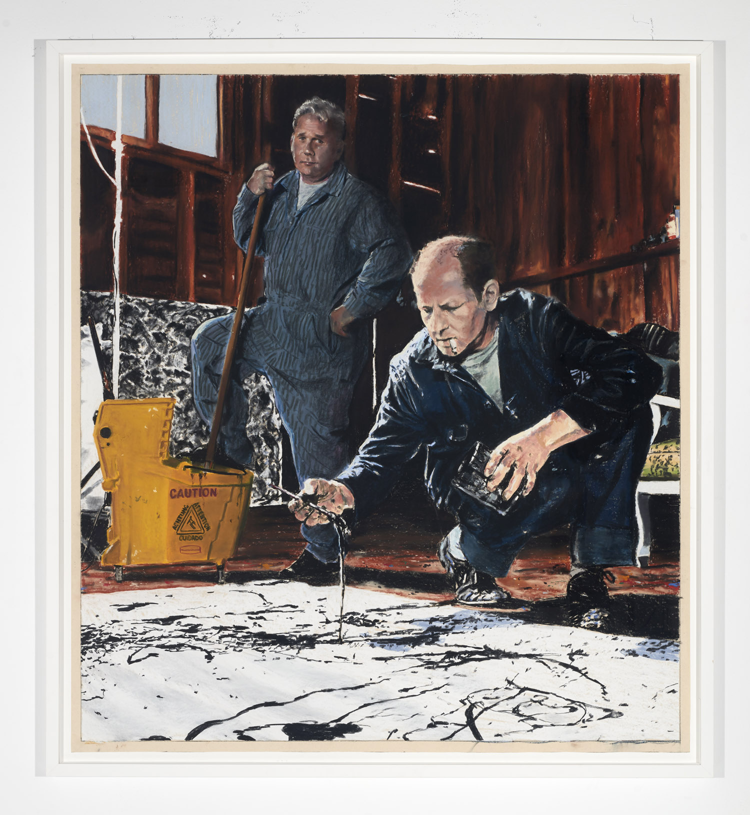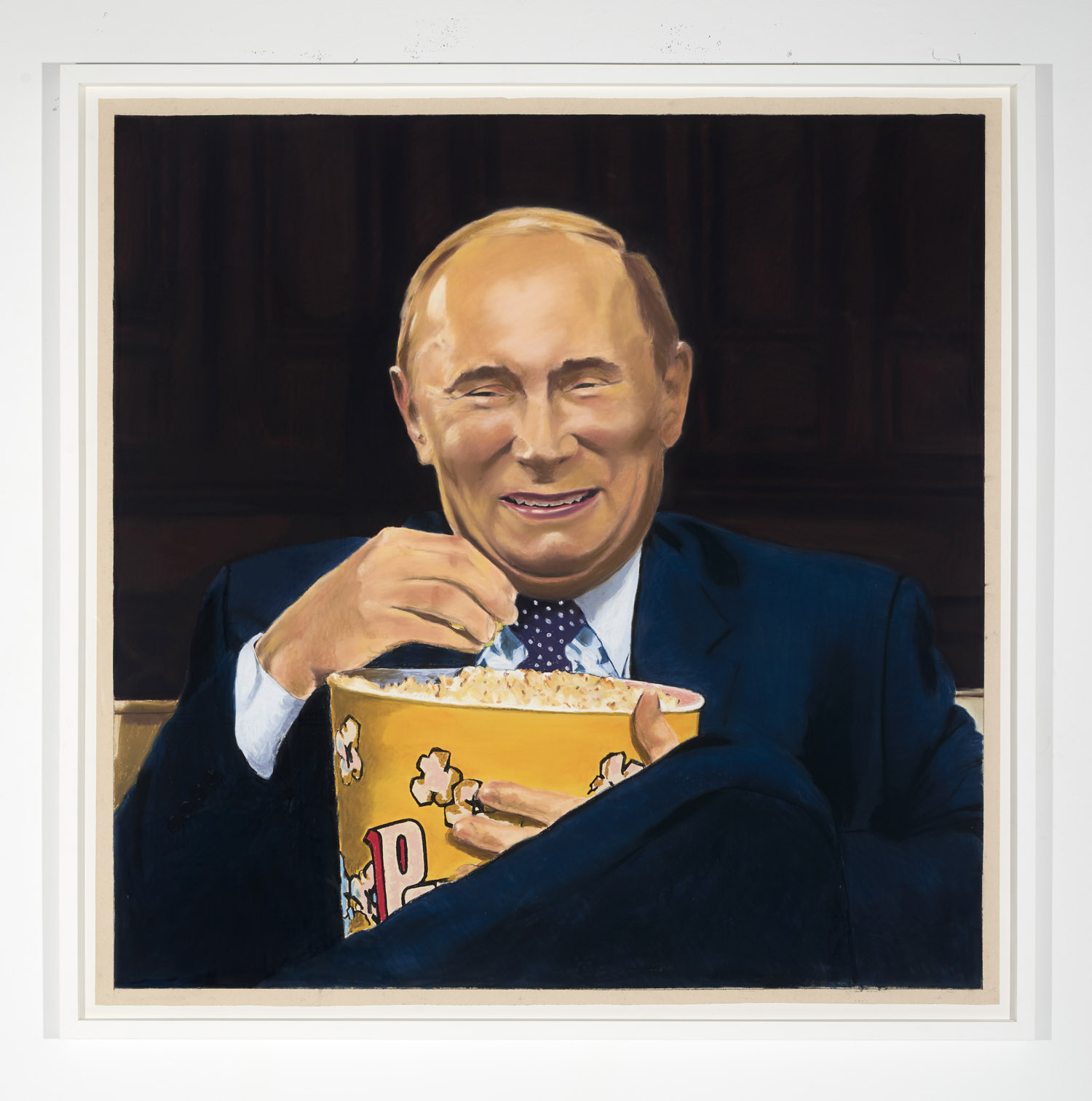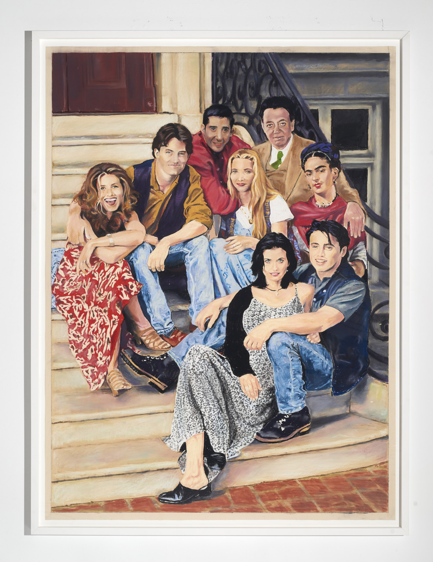 Gallery 3 is dedicated to one single piece, a series of 29 works that in order comprise sequential frames of an animation. “Orange Privilege” is a hybrid drawing and video piece where each frame of a clip was executed in pastel, from the blurry odd frames to the sharper focus I-frames, retaining some digital video artifacts and crunchy bits of erratic color. The scene it captures is only 3 seconds long but deeply disturbing; Donald Trump bear-hugs the American flag with an insipid grin on his face above a throng of reporters with iPhones looking on.