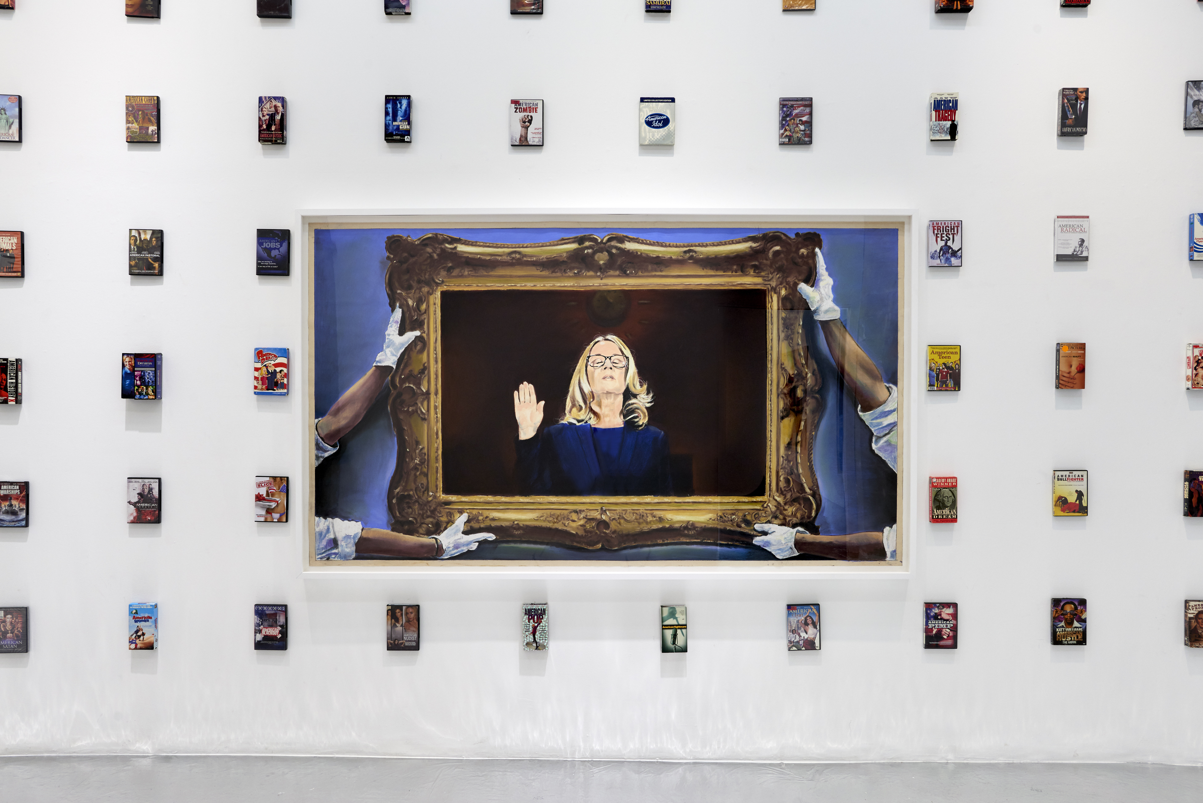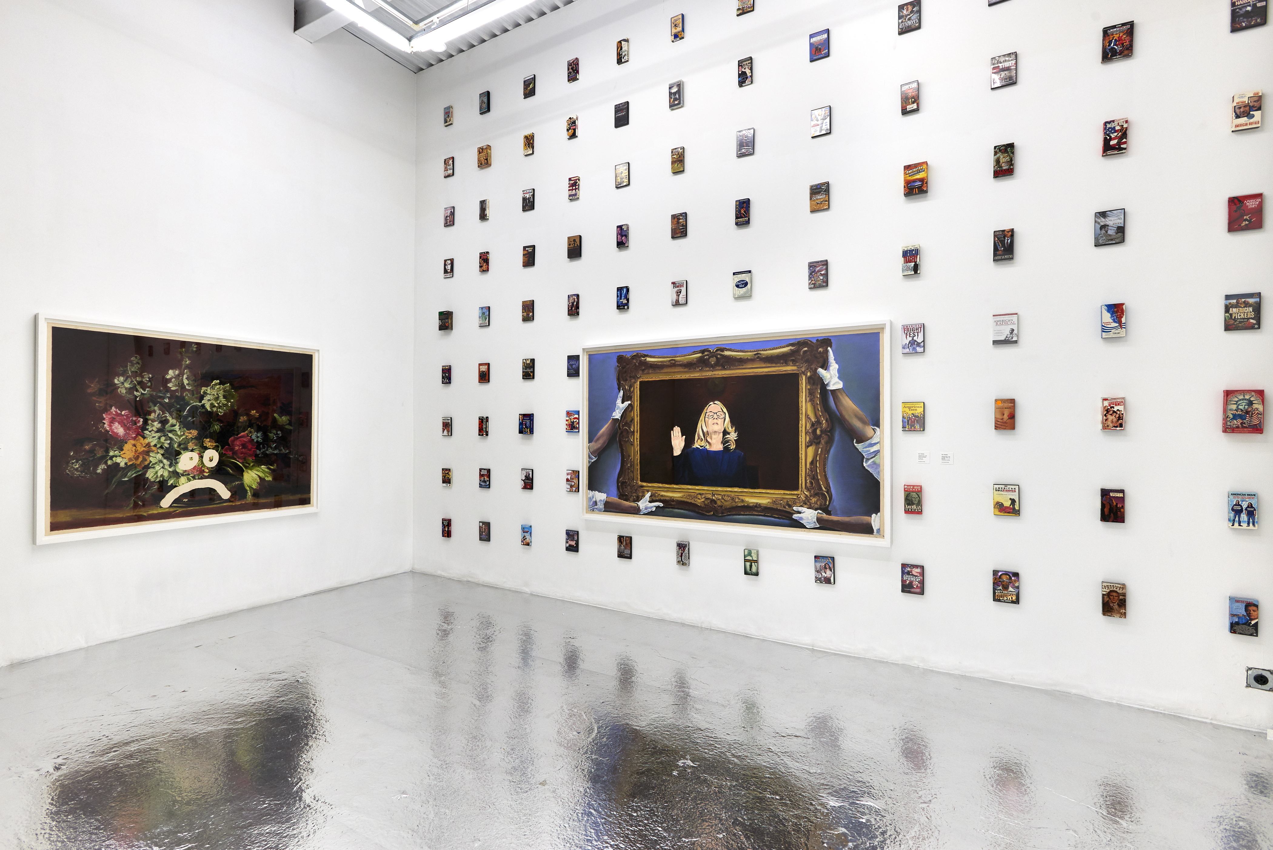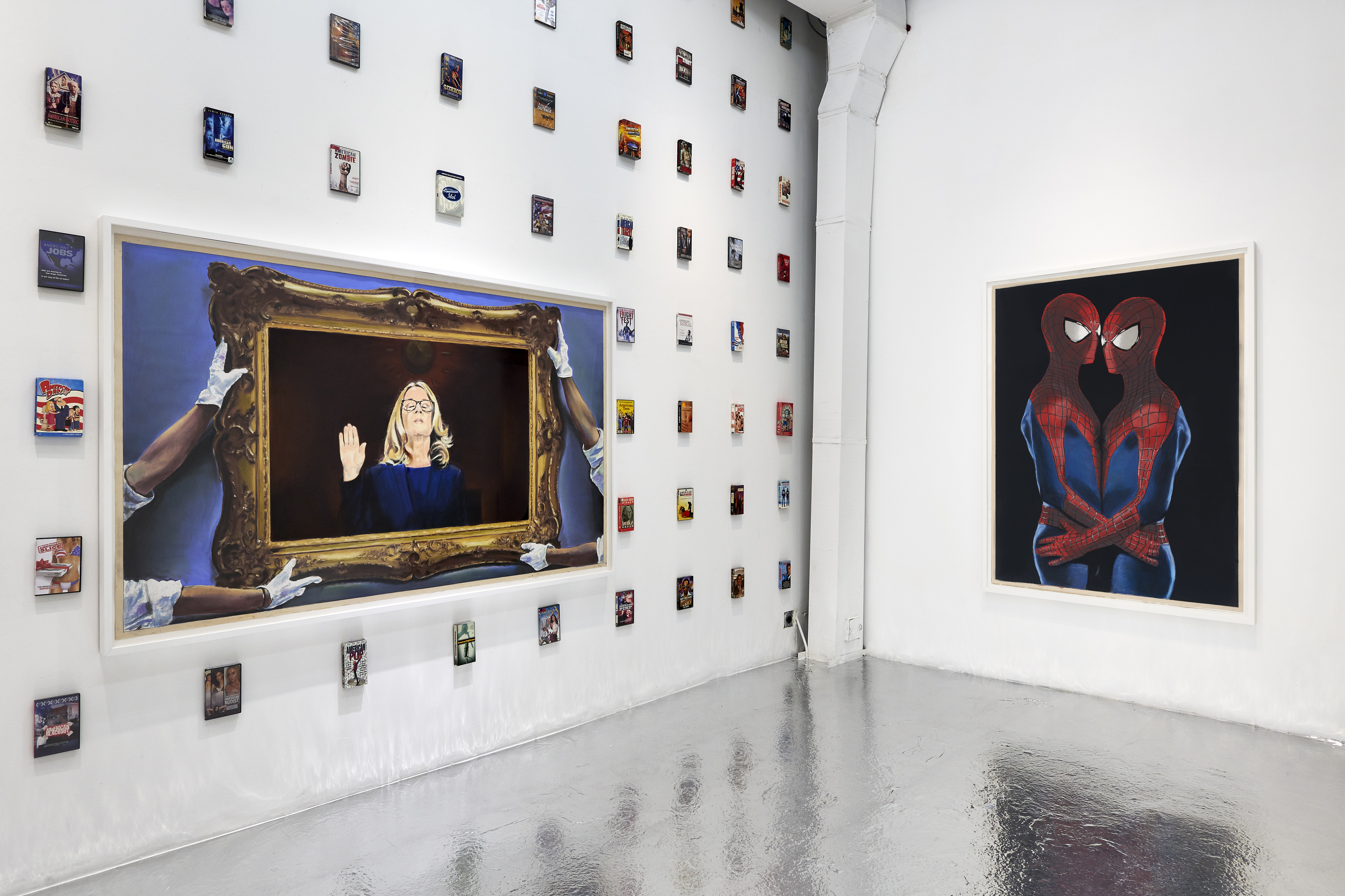 The title piece in the show (above) kicks things off by making us hold up a (cell phone) mirror to our participation in what has gone wrong. The celebrity, vanity and vacuousness of Warhol’s aluminum foiled-“Factory” is seamlessly updated to integrate with celebrity-influencer social media selfie culture. Were Warhol Superstars an analog version of the digitally-assisted disaster of now? The pieces in the show look at both how we got here and urgently ask how do we get the hell out of here.