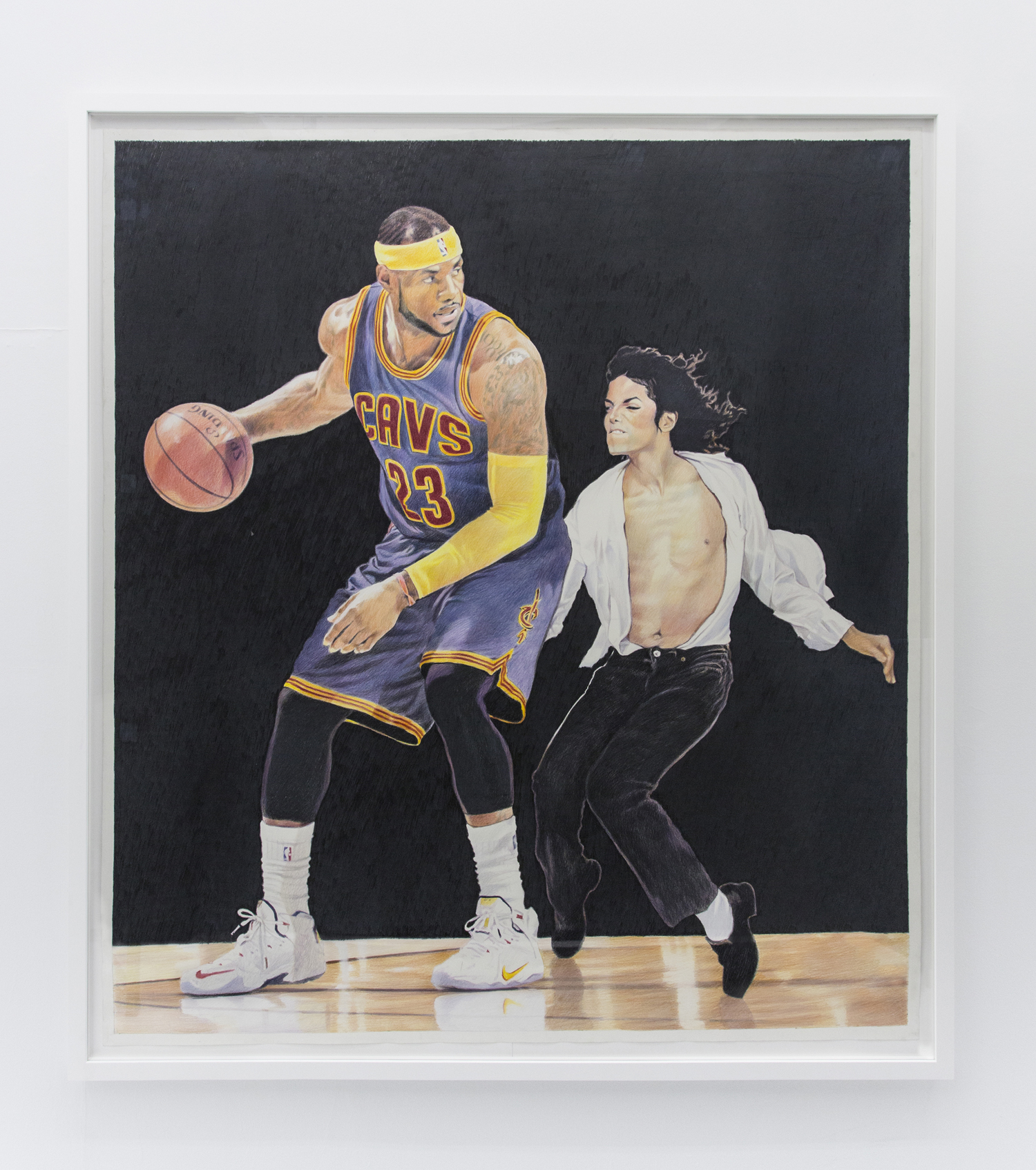 For example how would one “explain” the work above, “King’s Court” featuring to-scale renderings of LeBron James and Michael Jackson playing defense in his loafers? It depicts two top performers in their performance attire, each somehow making the other’s outfit look ridiculous, but the scale is perhaps the most visually powerful aspect; how huge LeBron is, his massive Nikes and giant deltoid muscle larger than Michael’s head. Michael’s virtuoso dance moves are juxtaposed to James’ goliath-like power and equal but different finesse. In the presentation of two examples of male masculinity and prowess, James has home court advantage being on a basketball court, however Jackson seems in charge, unperturbed, and having a better time; after all it is titled “King’s Court.”
