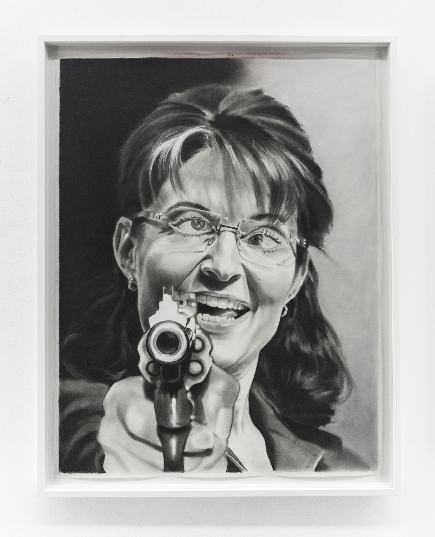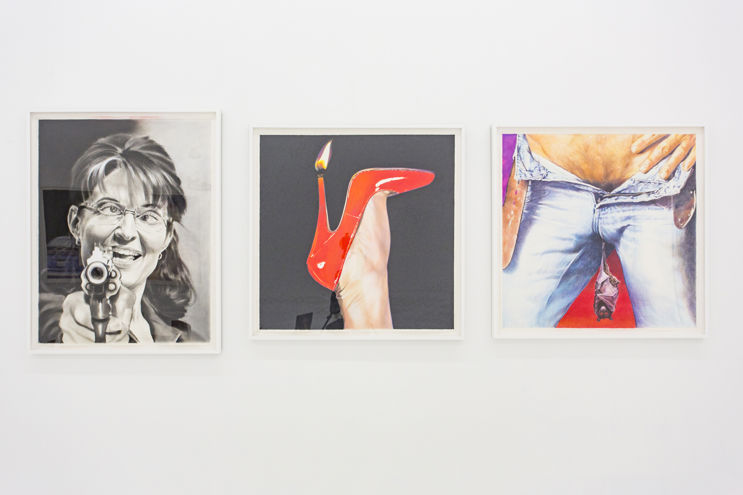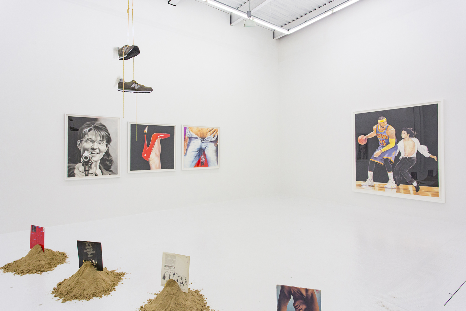 Using imagery from pop culture and recognizable people or products as a surface level entry point to each work, Yahnker draws the viewer in to the deeper semiotic and sociopolitical concepts beneath. The artist seeks out points in his own psyche that are dark or embarrassing or unresolved and exposes his own problematic personal perspectives to the public. A bit of head-scratching is OK: confusion for the artist is a productive state of mind, a grey area where he thinks most of life and especially politics resides.