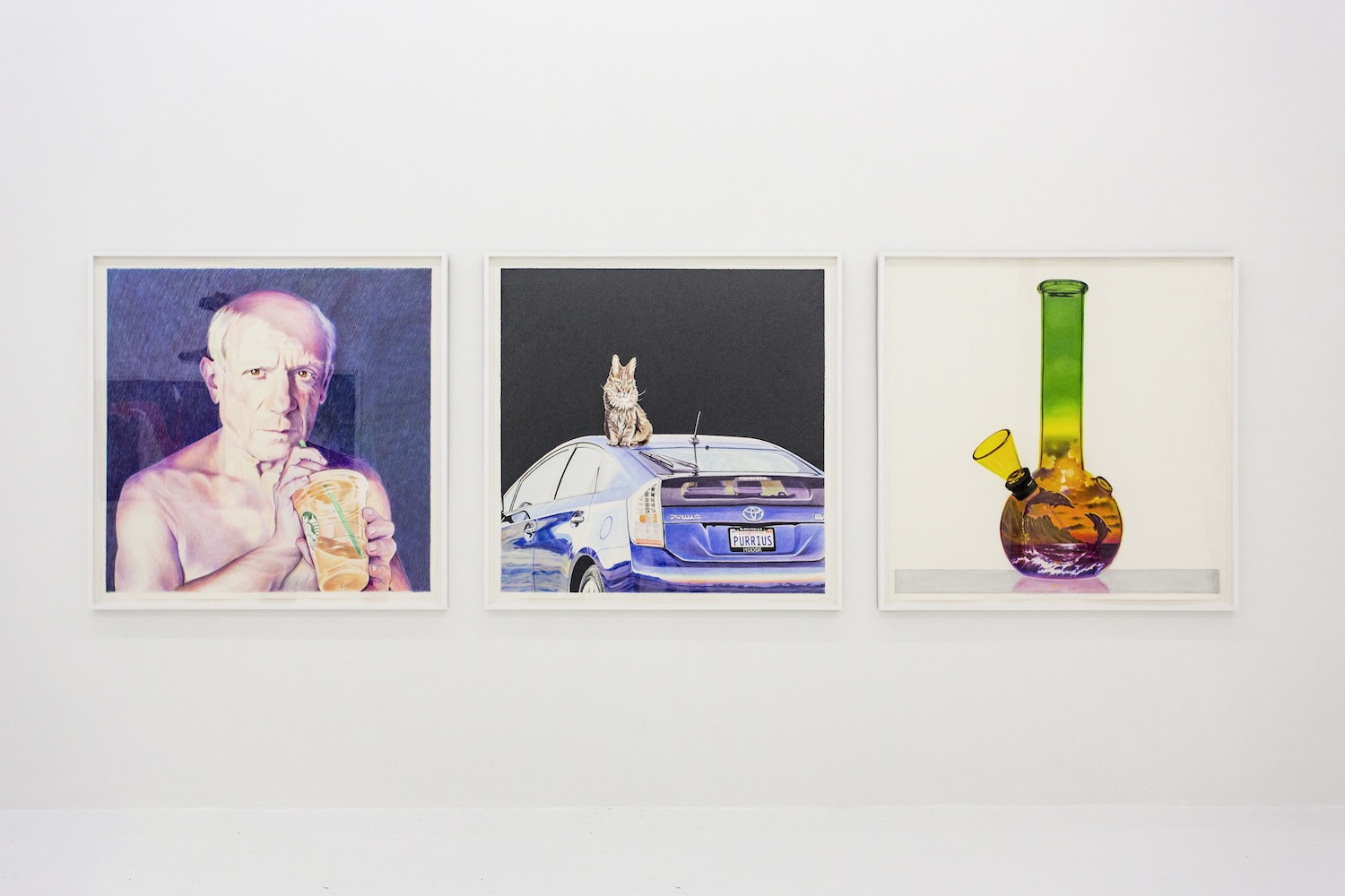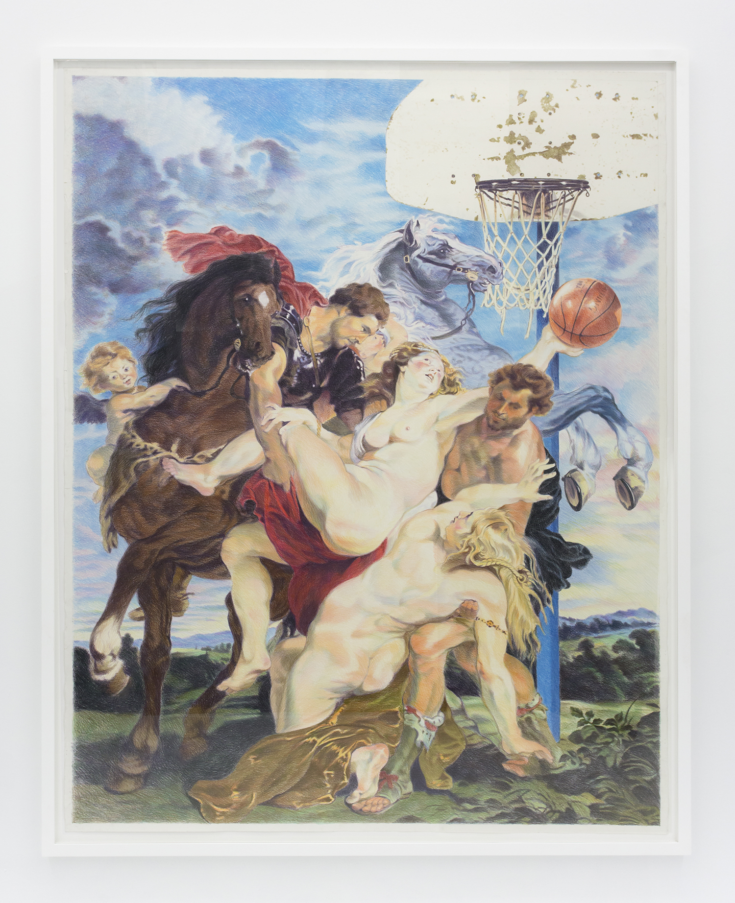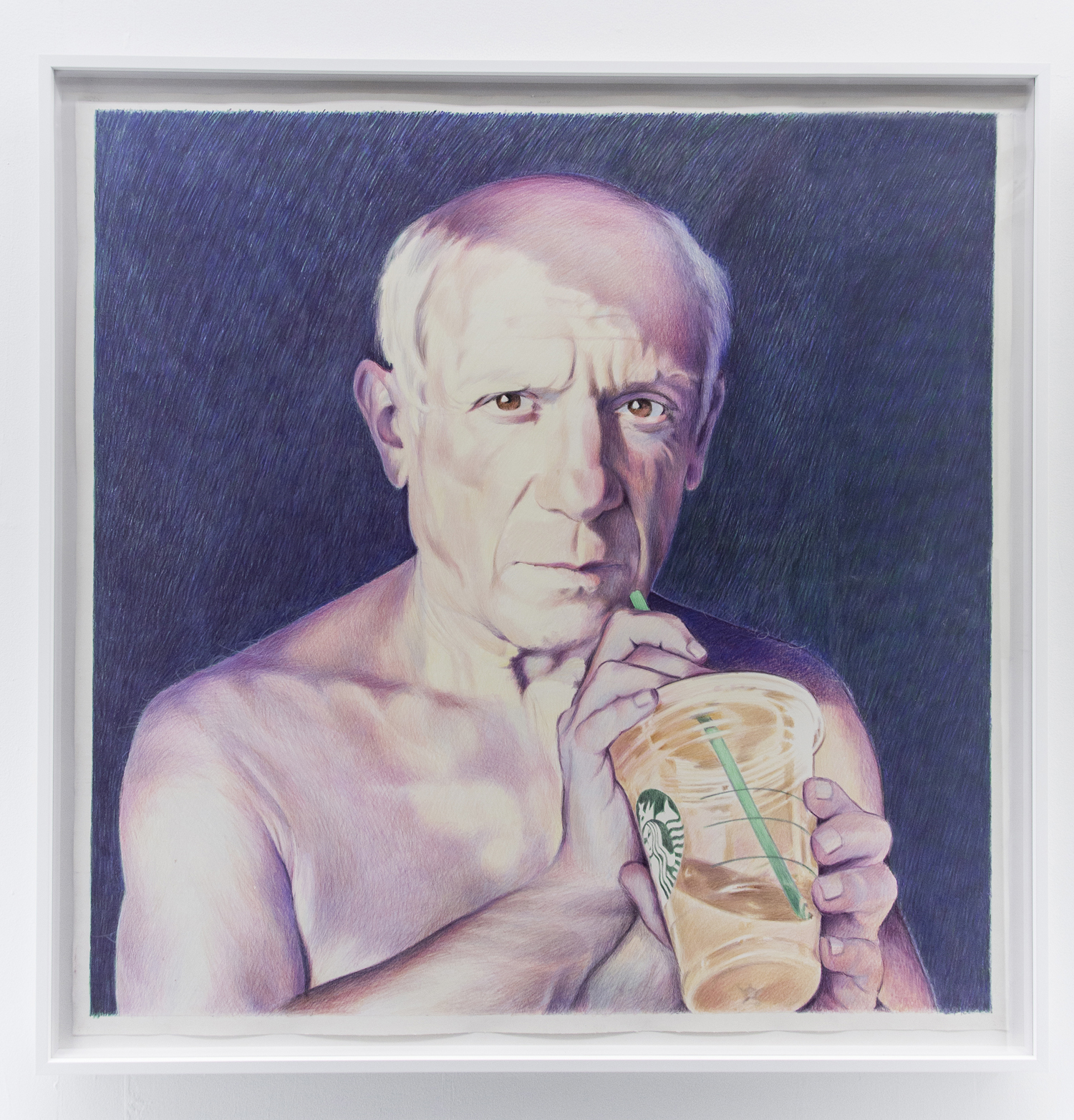 Other drawings in the show include a giant decontextualization of the Reuben’s painting “Rape of the Daughters of Leucippus” where the overly-casual central female is landing a layup over her captor’s heads; “Hang In There” features a slumbering vampire bad hung pendulously under the tight-jeans covered crotch of an anonymous dude; “Bong Gone” is a meditation on utopia with a phallic bong full of very chill dolphins; while other works include high heels, hybrid cars, what looks like Sarah Palin and a beautiful shirtless Picasso drinking a Frappuccino.