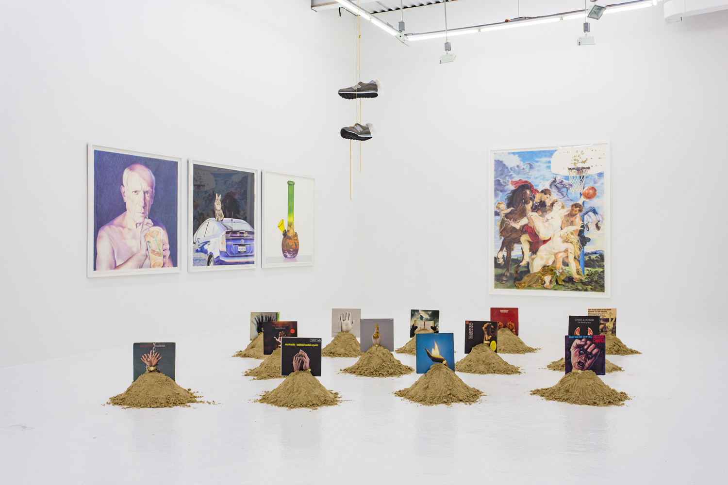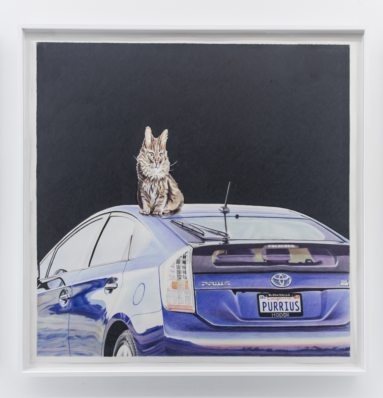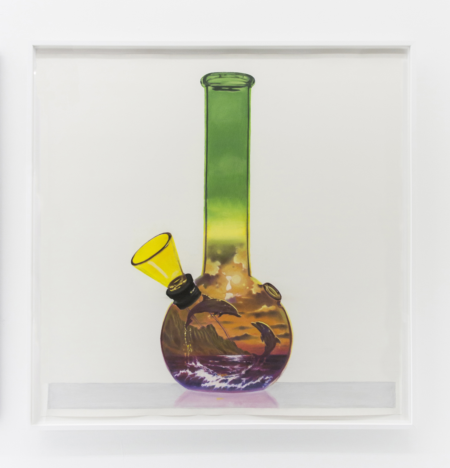 Other drawings in the show include a giant decontextualization of the Reuben’s painting “Rape of the Daughters of Leucippus” where the overly-casual central female is landing a layup over her captor’s heads; “Hang In There” features a slumbering vampire bad hung pendulously under the tight-jeans covered crotch of an anonymous dude; “Bong Gone” is a meditation on utopia with a phallic bong full of very chill dolphins; while other works include high heels, hybrid cars, what looks like Sarah Palin and a beautiful shirtless Picasso drinking a Frappuccino.