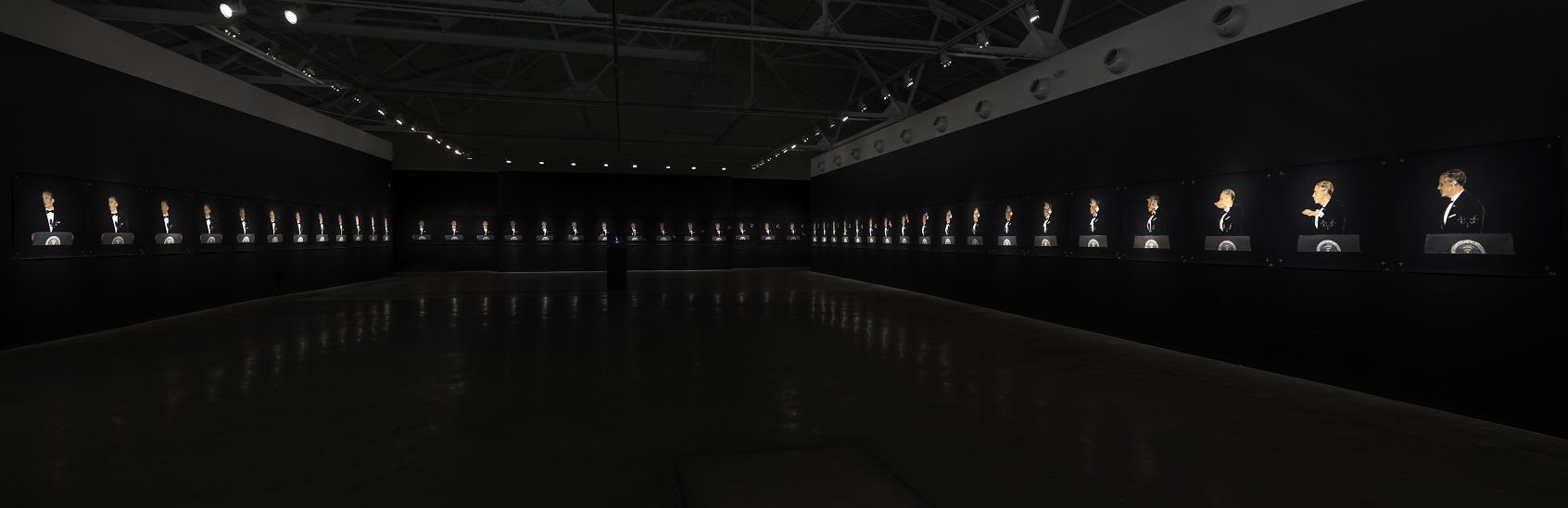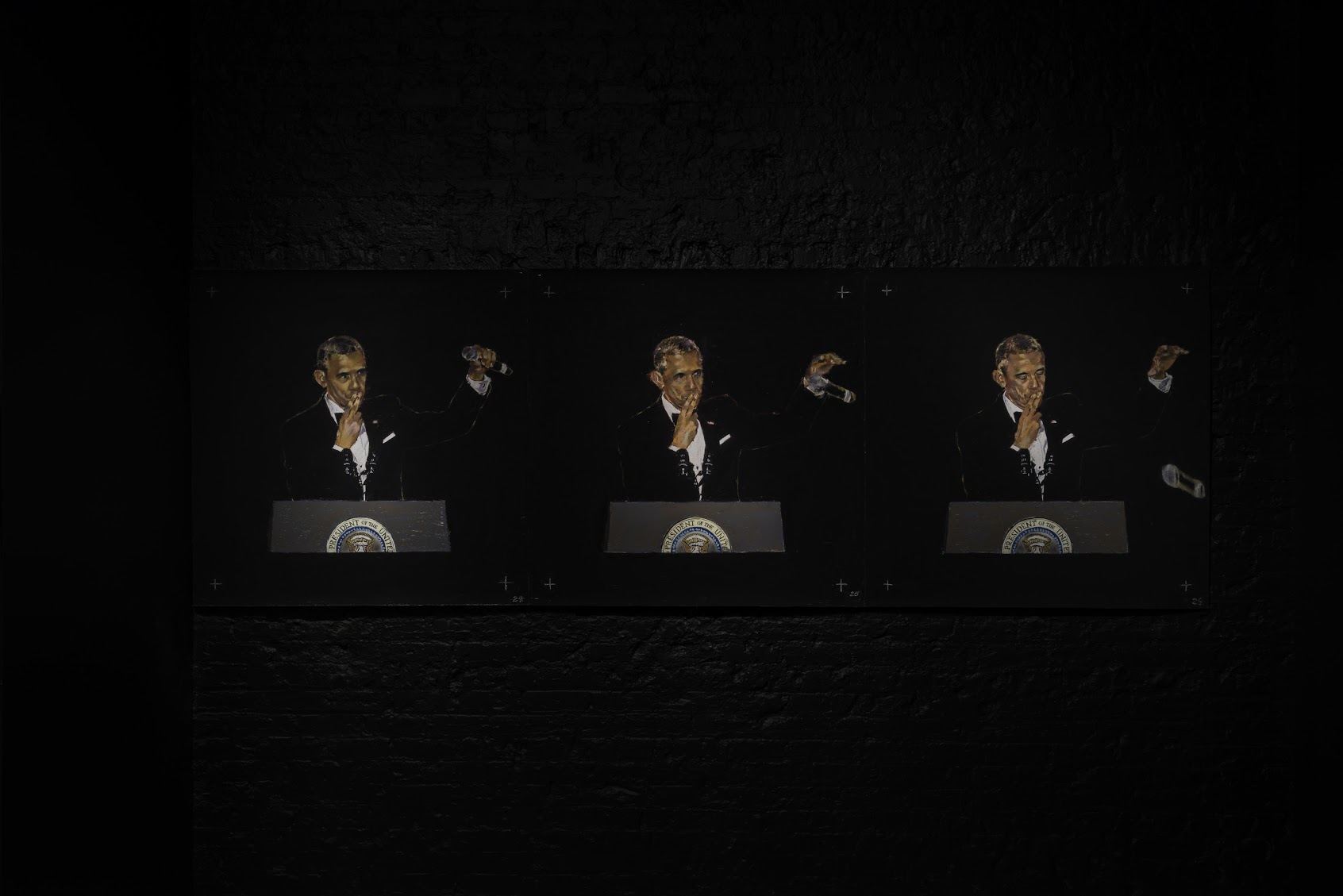 Viewers entering the dimly lit Main Gallery will encounter 44 velvety-surfaced drawings on pastel-blackened sandpaper, installed edge-to-edge around the 3-wall expanse of the space—as if to suggest an oversized film strip or life-size zoetrope. At the center of each individual sheet is a hand-drawn pastel rendering depicting a single frame of Obama’s ‘mic drop’ moment, appropriated directly from the live White House feed of the 2016 Correspondent’s Dinner. Together, the 44 drawings (each measuring 3.5 ft. square), are in fact frames, forming an expansive rotoscope-animated sequence. At the very center of the space, a square-shaped monitor plays an endless loop of the 44 hand-drawn frames, its blueish glow subtly reflecting on the polished concrete floor below.