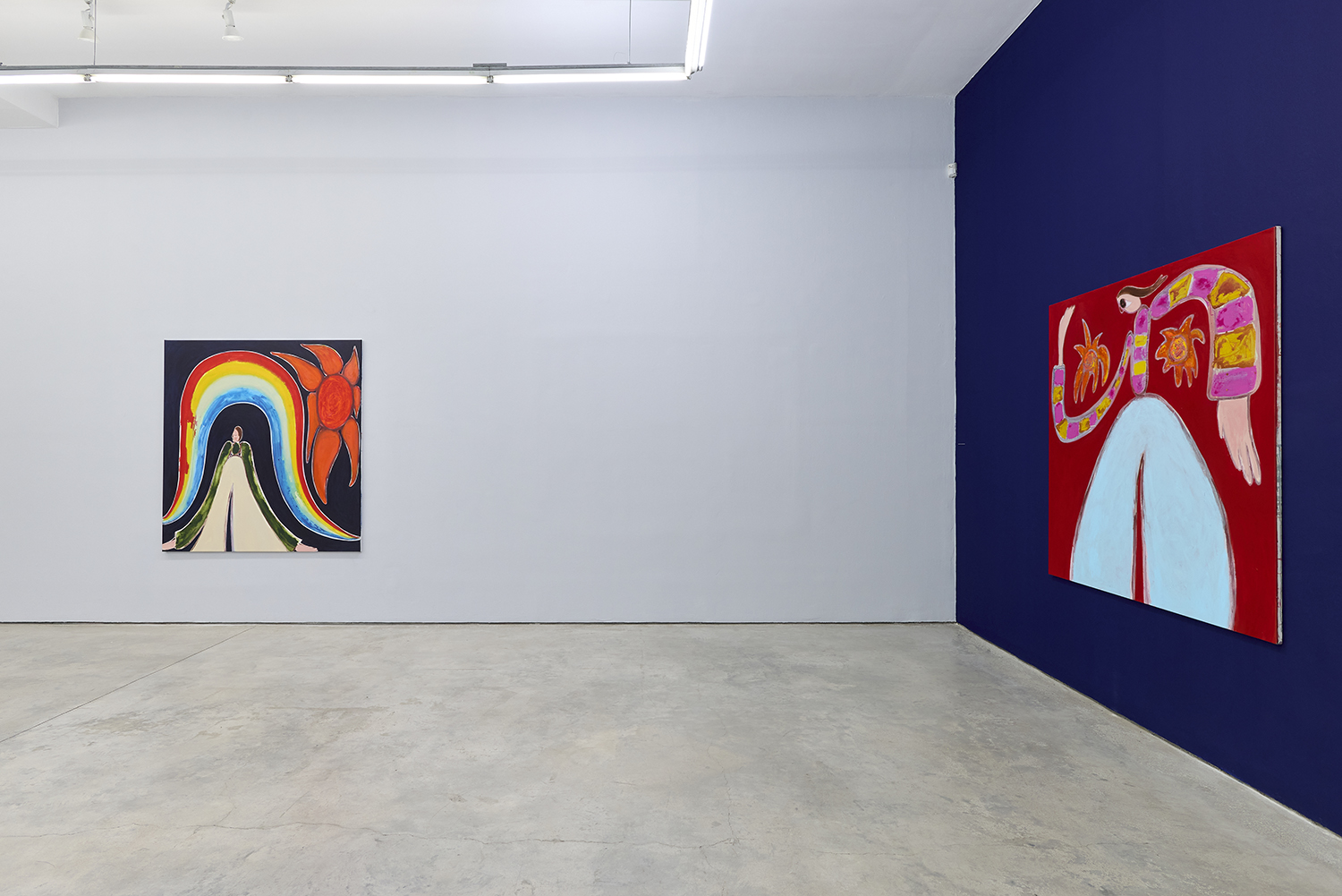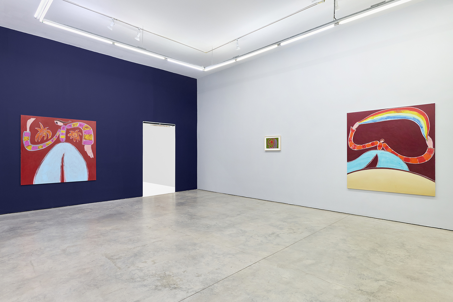 Where Treadwell’s previous exhibition had the subdued tone of soothing quietness, the new imagery is underlined with enthusiasm and rejoicing, radiating with affirmative energy and positivity. Still holding onto the melancholic undertone, the bubbly presence of the figures conveys a hopeful, uplifting, sometimes loud atmosphere. Zooming out of his most recognized body of work through a prism of an adolescent with more profound life experiences and expectations, the much more accessible visuals are painted using slightly restricted yet bold language. The smartening-up is backed by love and trust in this particular body of work and a new way of looking at and considering them both emotionally and technically.