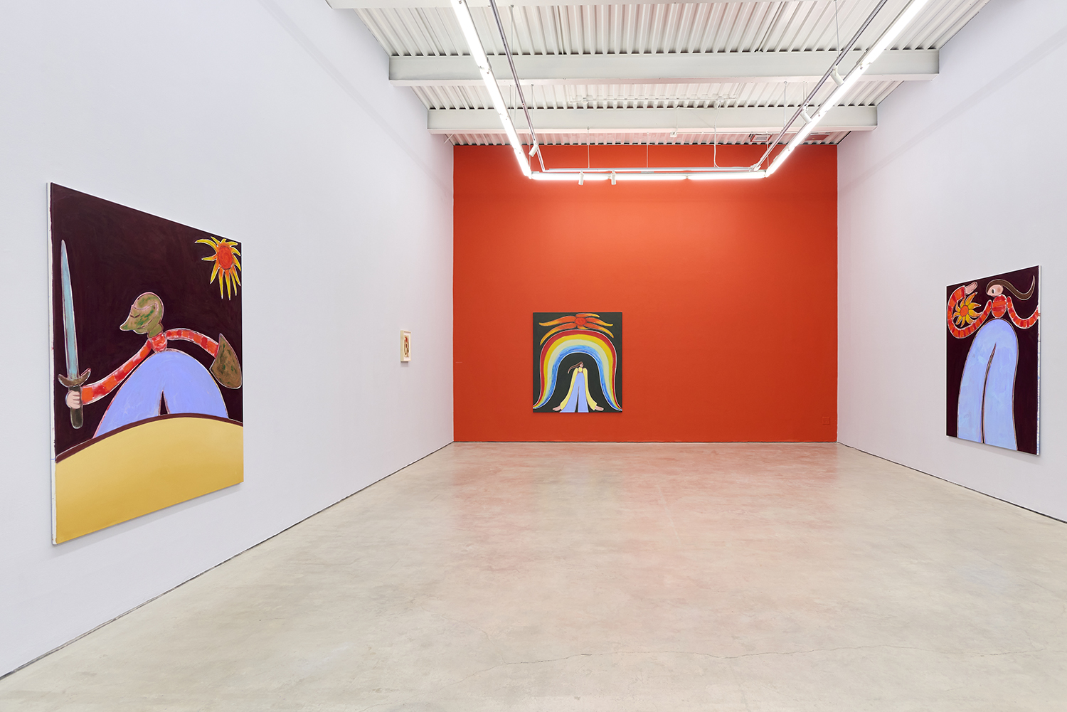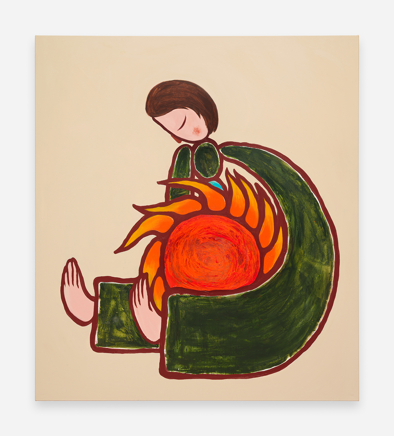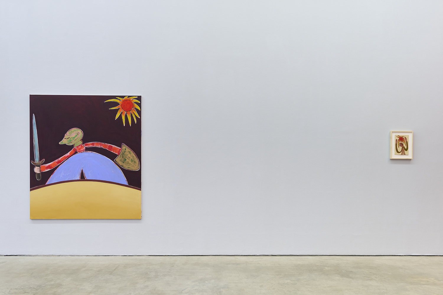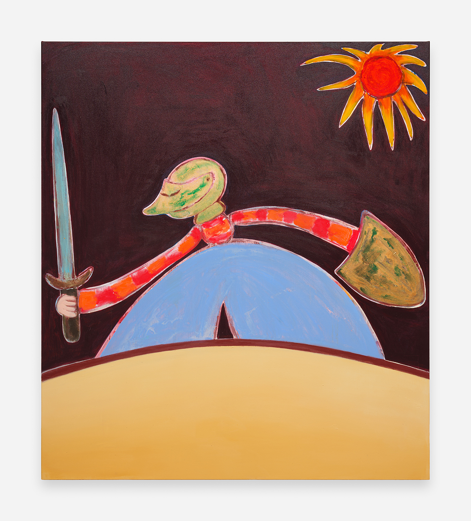 The intensity of new thoughts, sentiments, and concerns prompted using a Milton Avery-like palette that energizes the scenes and underlines the recharging, revitalizing capacity of the sun. Invested in creating cogent, spirited metaphors for identity search and empowerment, the main characters represent the same person (the artist), who takes different shapes throughout the presentation. From several versions of the recognizable, slightly aged, androgynous Feelo character, over the insecure and armored medieval knight, to their incarnation as dinosaurs millions of years ago. Due to their shapeshifting nature, their emotion, mental state, and relationship with the environment become the main protagonist, while the figures get reduced to vessels that convey timelessness and ubiquity. Through such widened perspective, the work continues developing and growing while dealing with certain concerns at the same pace as the artist himself. The fluid feminine and masculine adolescent protagonists reveal the interest in how a person identifies themselves internally or presents themselves to the world. Somewhat naive and curious, they are on a never-ending quest to find a balance between adventurously experiencing the world and their own vulnerability and fragility.