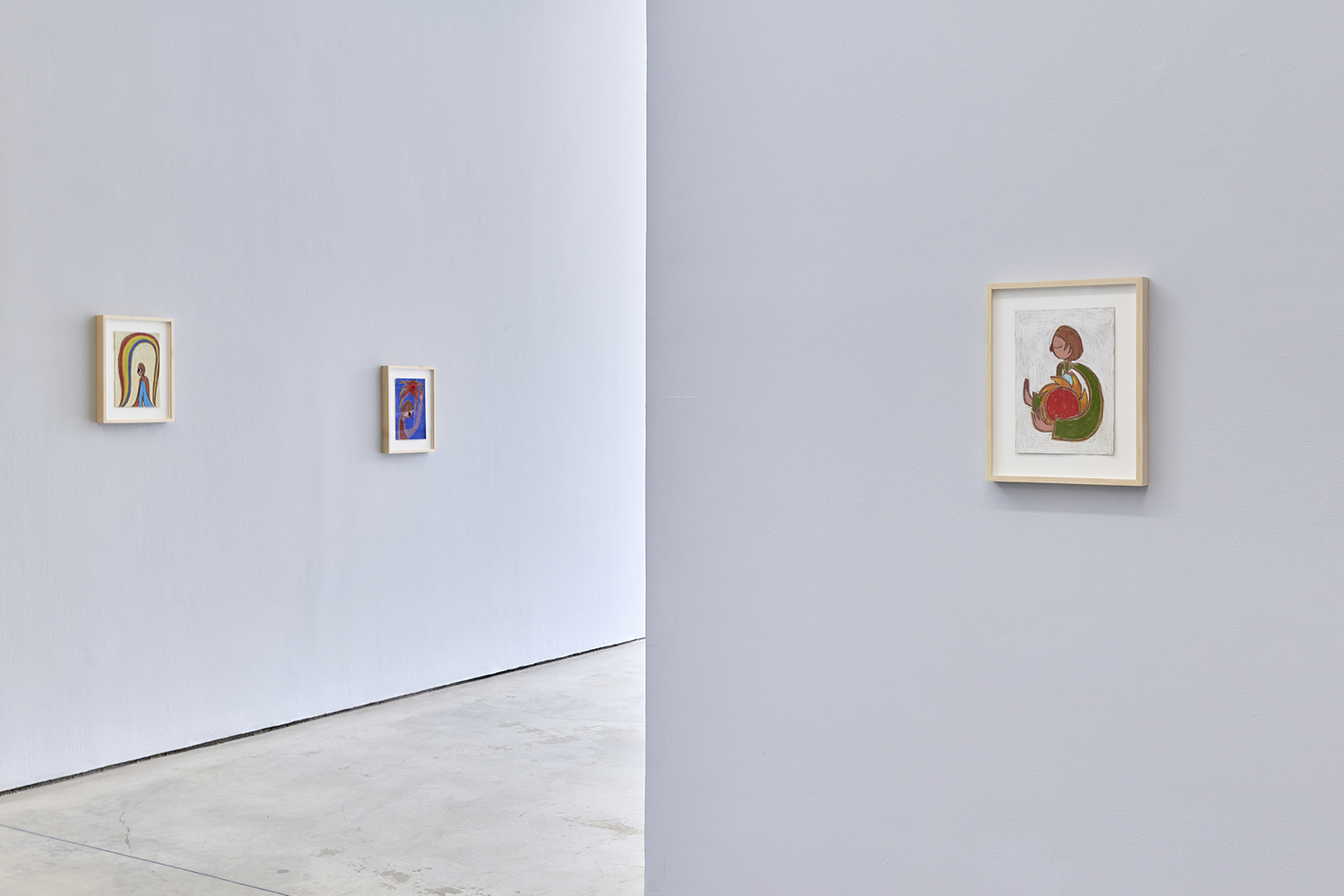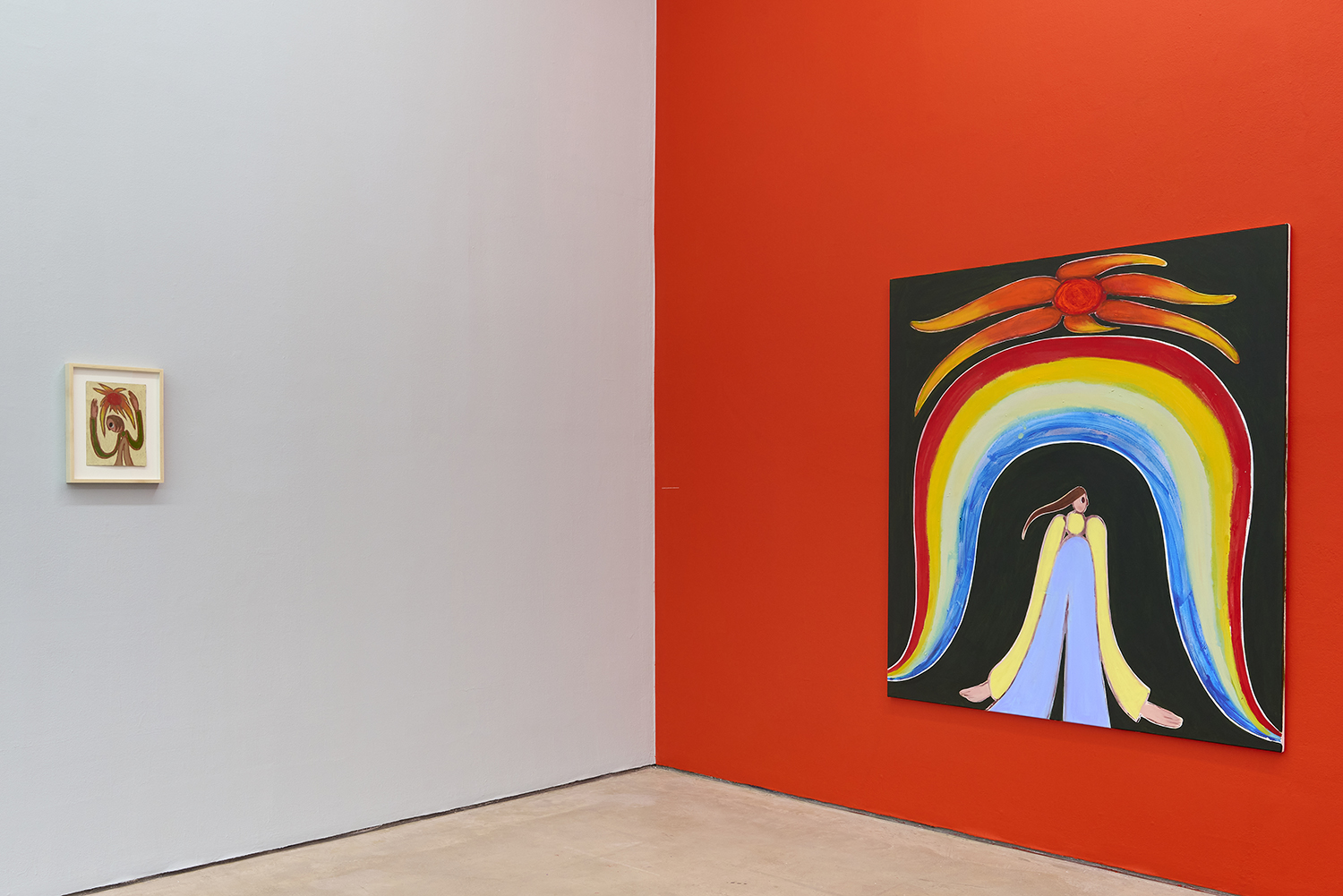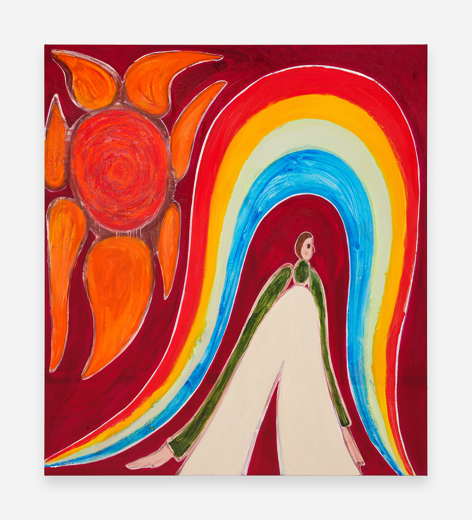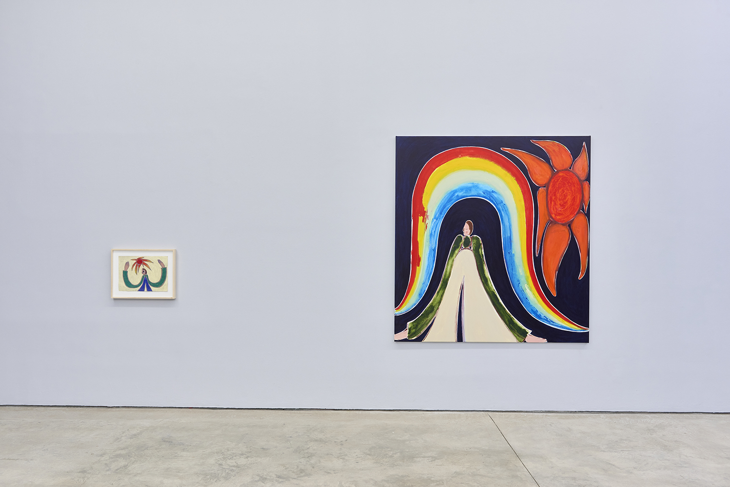 The intensity of new thoughts, sentiments, and concerns prompted using a Milton Avery-like palette that energizes the scenes and underlines the recharging, revitalizing capacity of the sun. Invested in creating cogent, spirited metaphors for identity search and empowerment, the main characters represent the same person (the artist), who takes different shapes throughout the presentation. From several versions of the recognizable, slightly aged, androgynous Feelo character, over the insecure and armored medieval knight, to their incarnation as dinosaurs millions of years ago. Due to their shapeshifting nature, their emotion, mental state, and relationship with the environment become the main protagonist, while the figures get reduced to vessels that convey timelessness and ubiquity. Through such widened perspective, the work continues developing and growing while dealing with certain concerns at the same pace as the artist himself. The fluid feminine and masculine adolescent protagonists reveal the interest in how a person identifies themselves internally or presents themselves to the world. Somewhat naive and curious, they are on a never-ending quest to find a balance between adventurously experiencing the world and their own vulnerability and fragility.