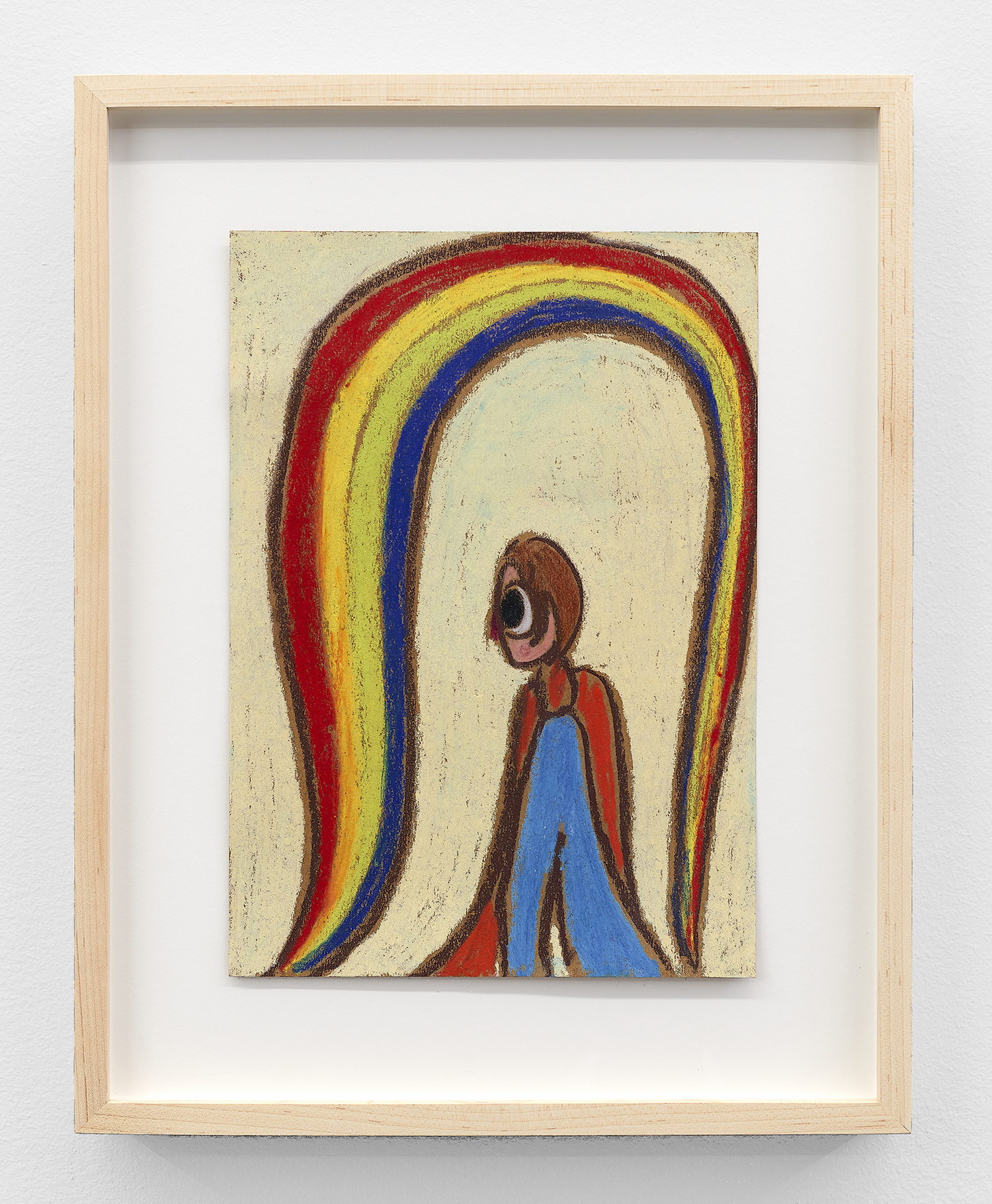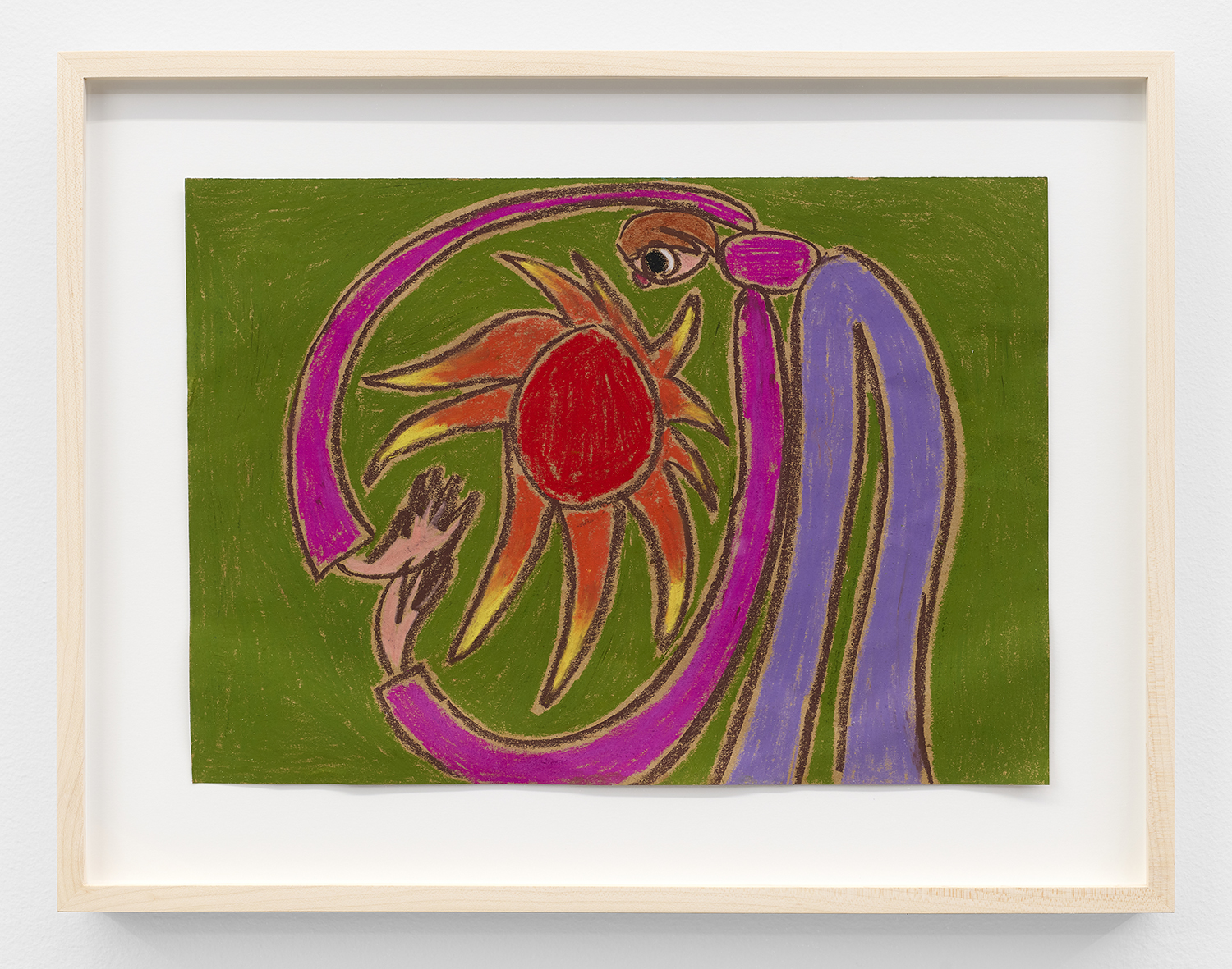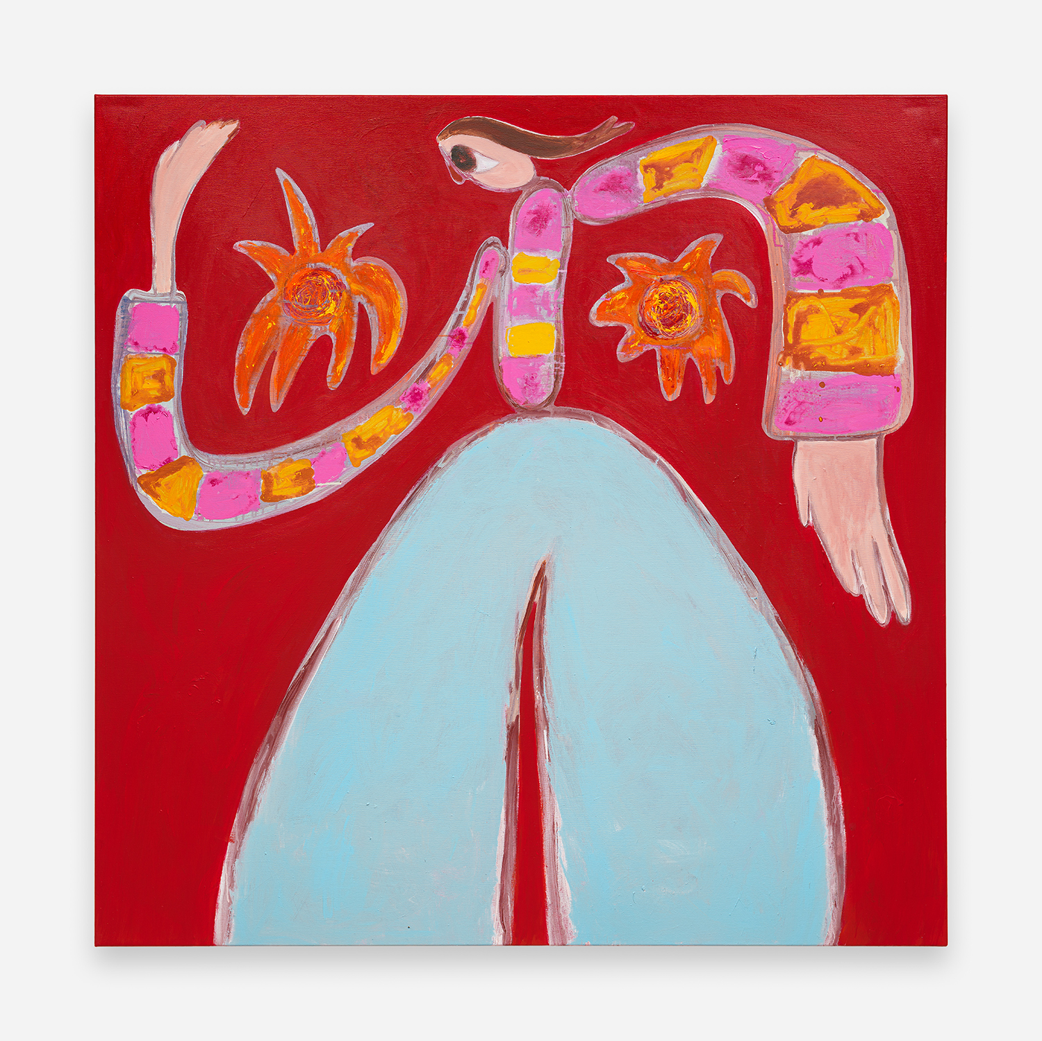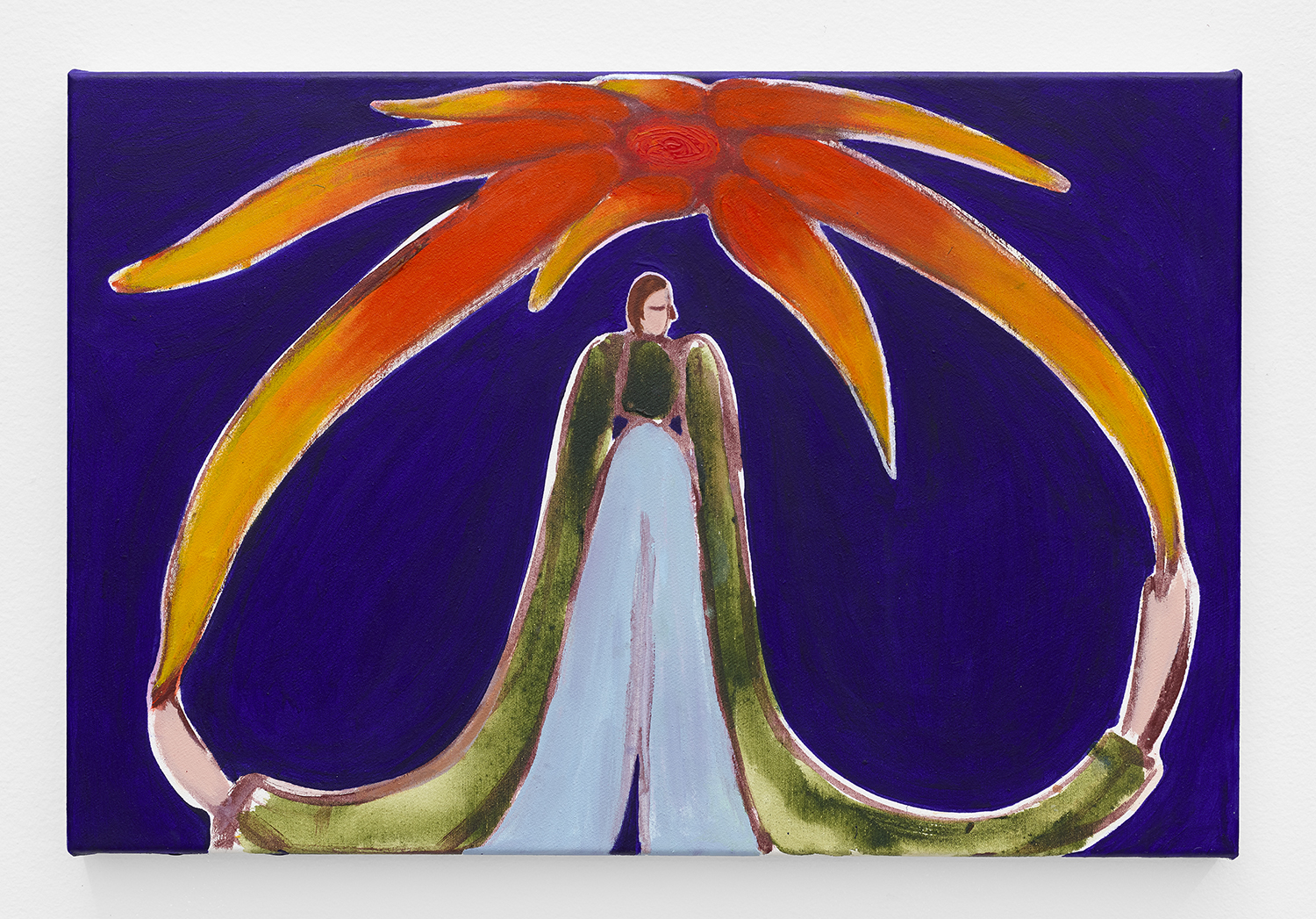 On a technical level, the canvases are painted in a way that catches and sustains the briskness and the innocence of the intuitive drawing method; a method through which a hotchpotch of strokes, gestures, and “errors” forms a figure and its surroundings. Trying to replicate a specific moment captured in a rough sketch or line drawing, they hold onto the immediacy, spontaneity and joy of making them. This results in the cleanness and sharpness existing together with rough edges that define forms and elements in the image. The tension between essentially graphic-like language and the expressive, intuitive paint application helps mirror the spectrum of the protagonists’ personalities while nodding at Henri Matisse’s draughtsmanship. At the same time, it conveys the hectic dynamics of Treadwell’s reasoning mechanism that distills a range of intense and weighty thoughts into seemingly frivolous visuals.