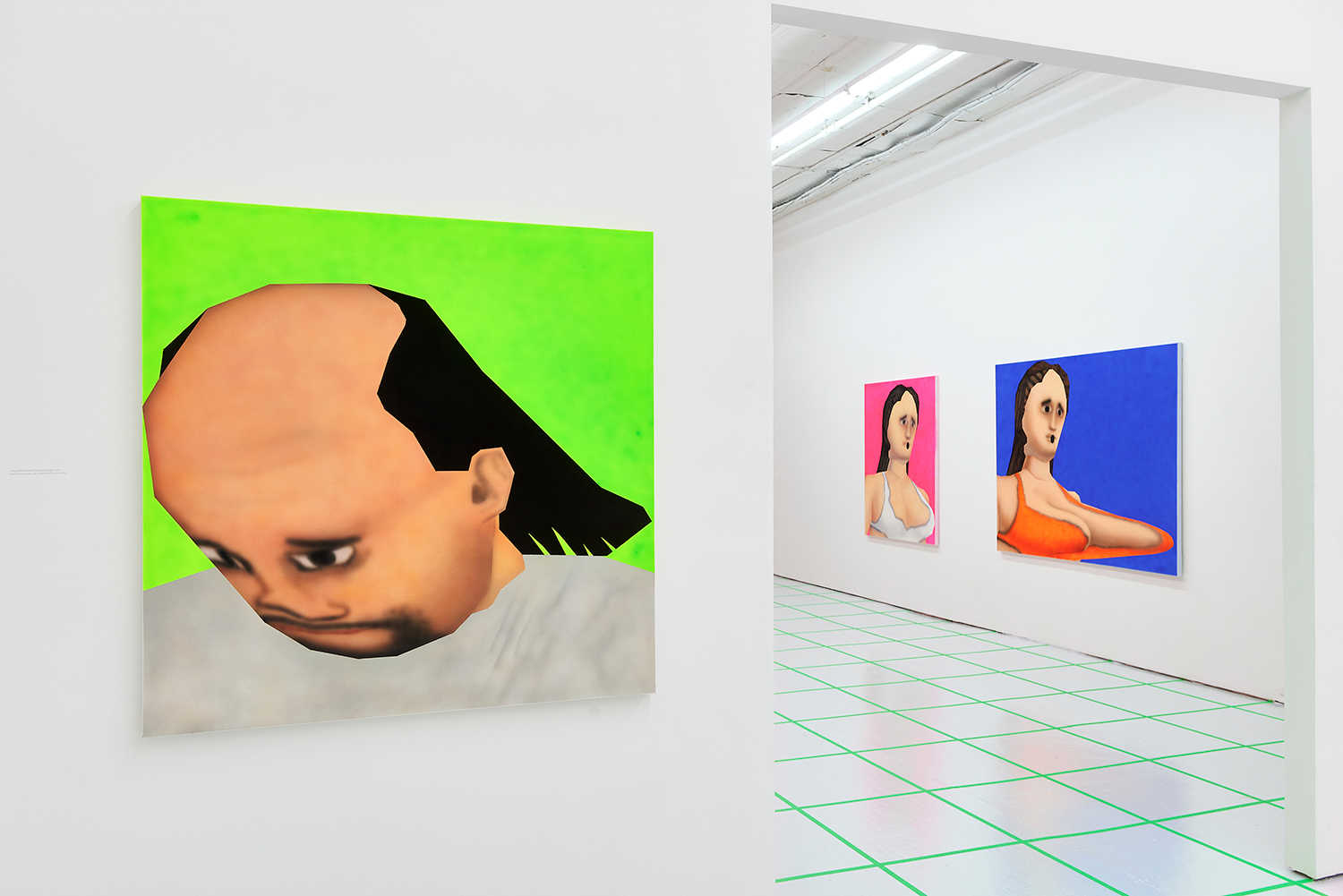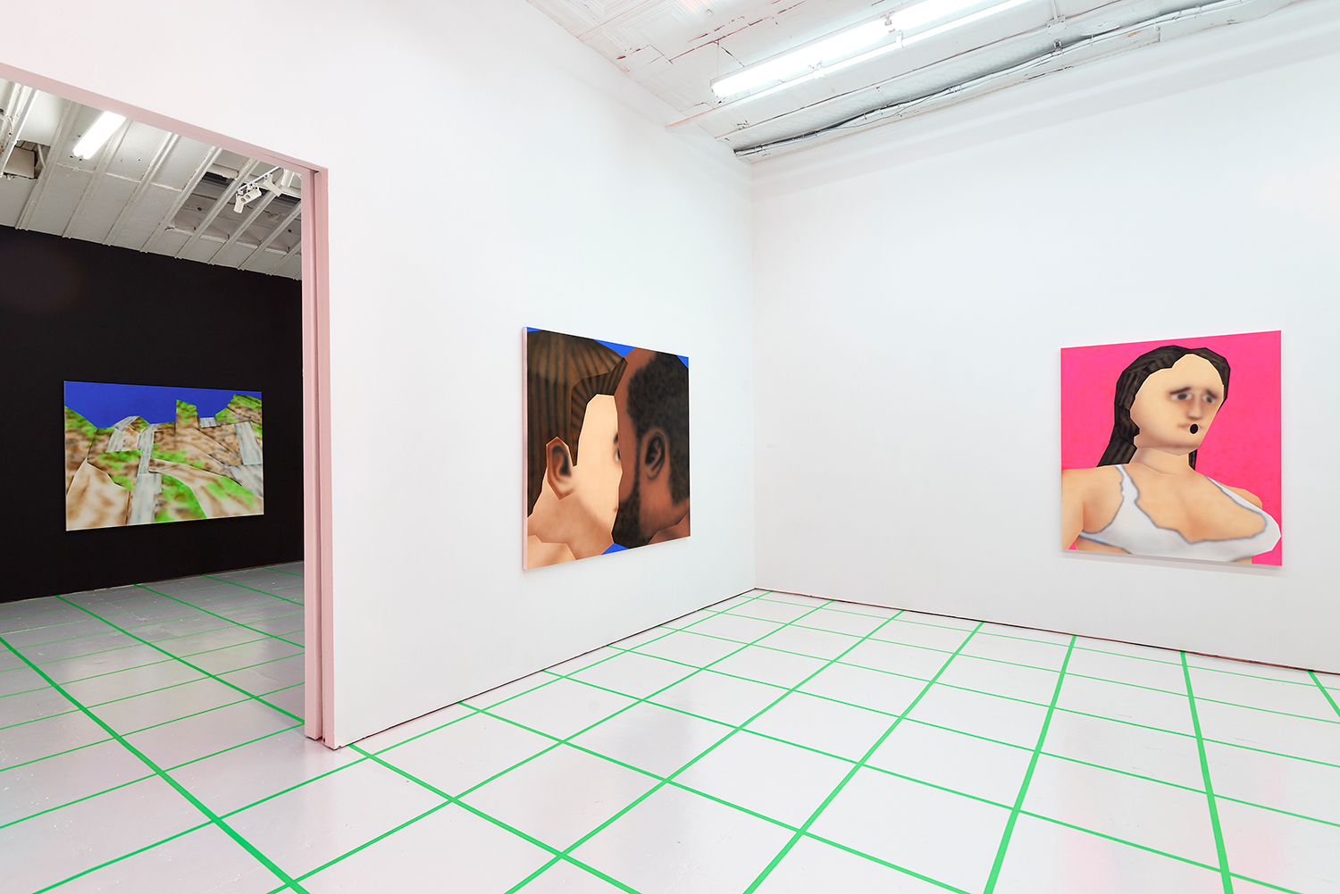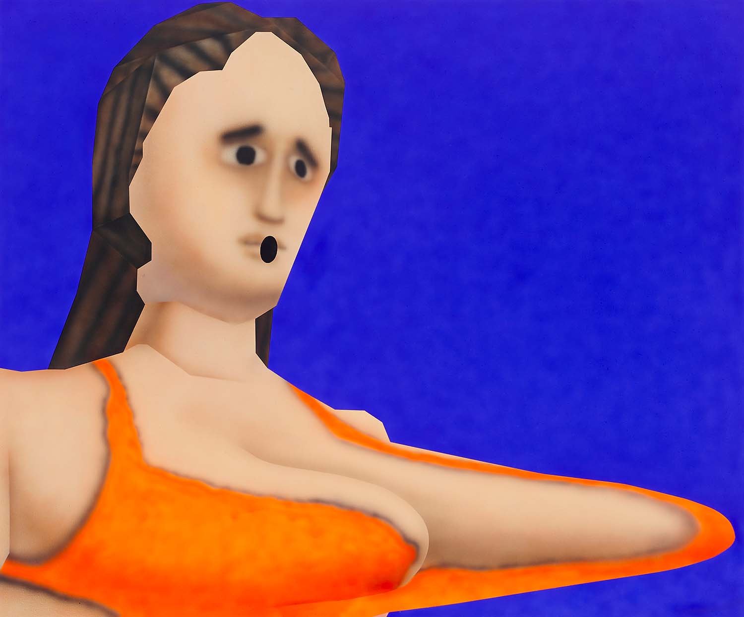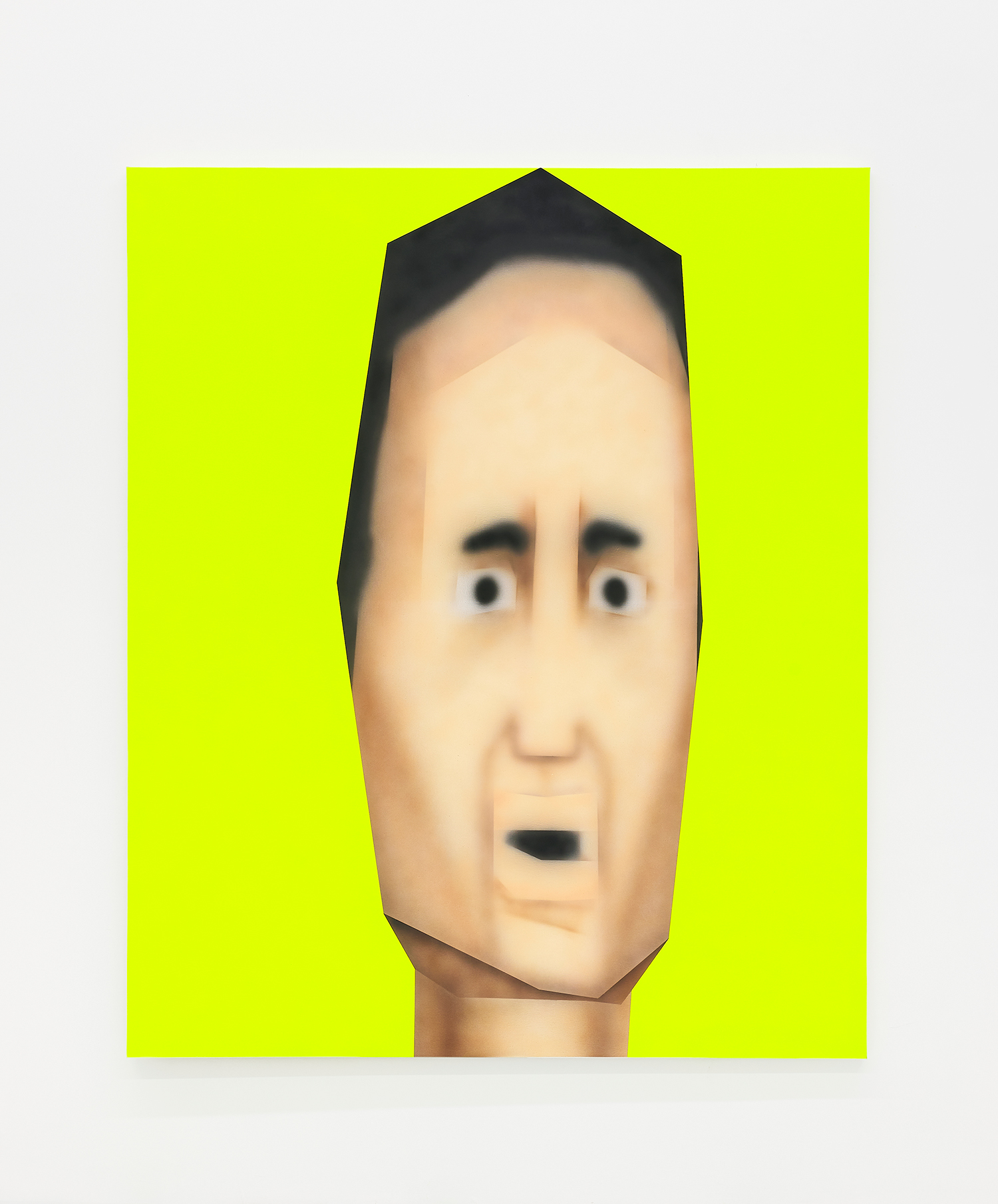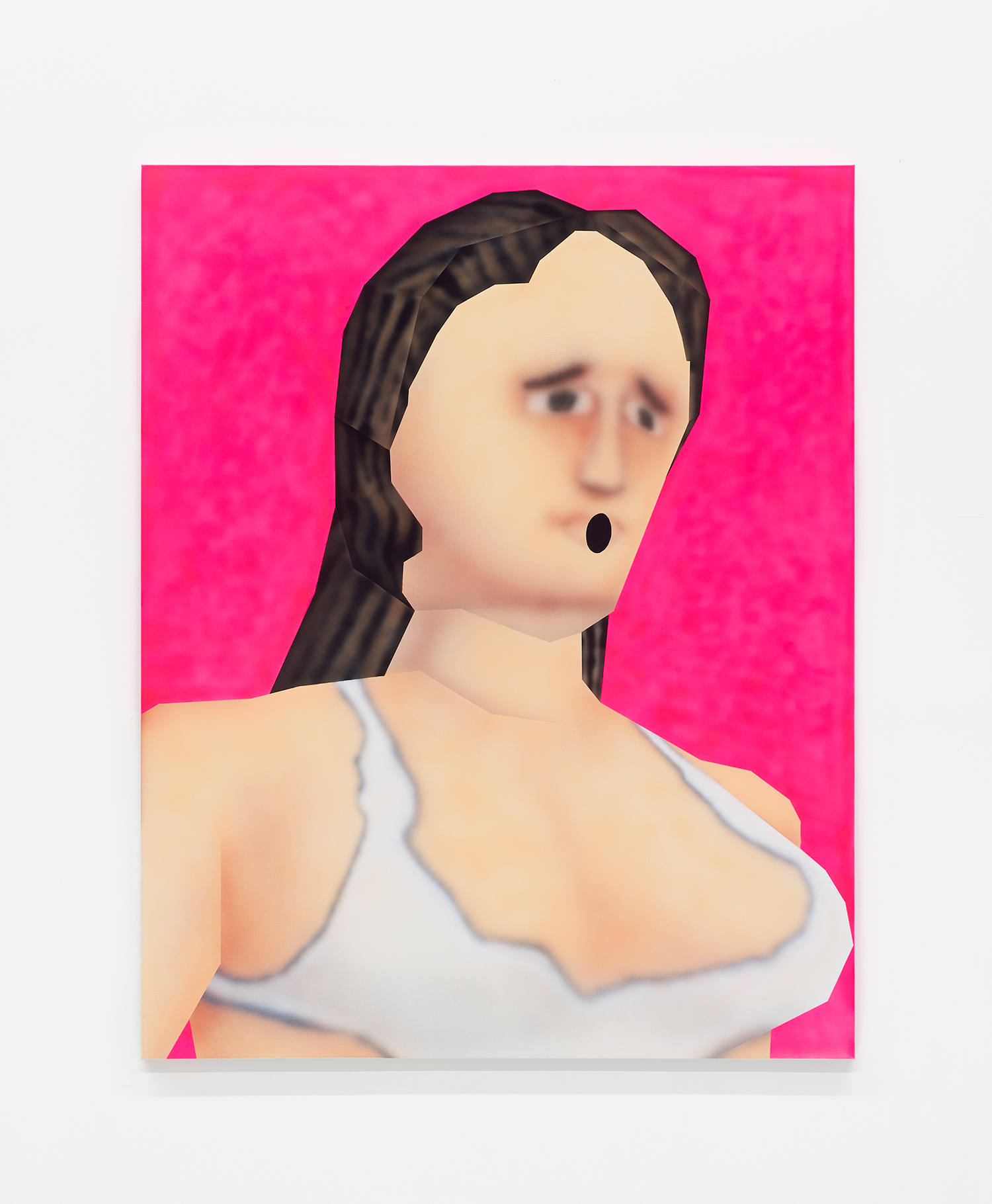 While the style is very specific to mid-90s gamer culture, the existential themes in the work are timeless, or at least date from the Pop era where depth was found in shallowness. The artist aligns himself with the Neo-Pop movement, pushing a palette of primary neons and surfaces from blurred airbrush to hard-edge. If oil painting was invented to paint the illusion of living flesh, acrylic is a great way to make it look dead: neon paint has enjoyed a resurgence as well for kids who grew up staring at screens, as it is the easiest way to make a painting look lit-up. The human eye is drawn to backlit or glowing things, and these paintings both entice and repel. I would call them dystopian but I personally find them so fun and upbeat; I guess it depends whether you like the thrill of the ground disappearing beneath you as you accelerate into the unknown future!