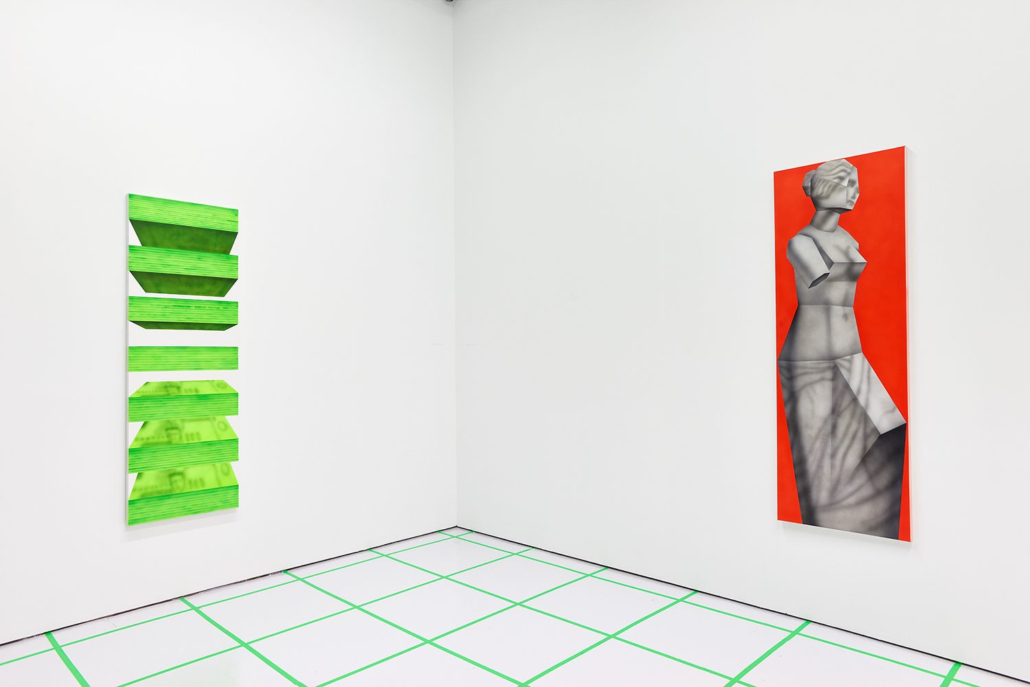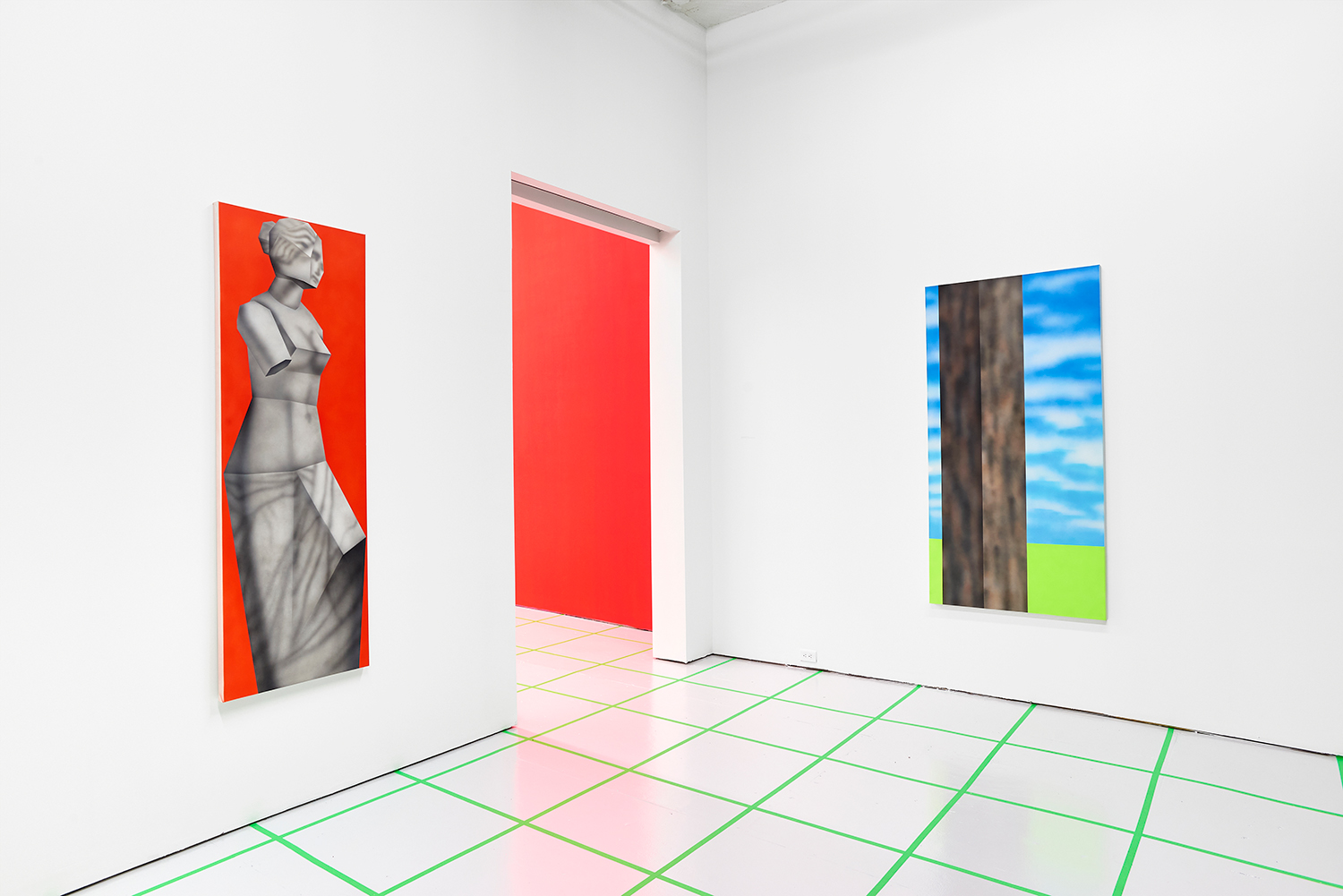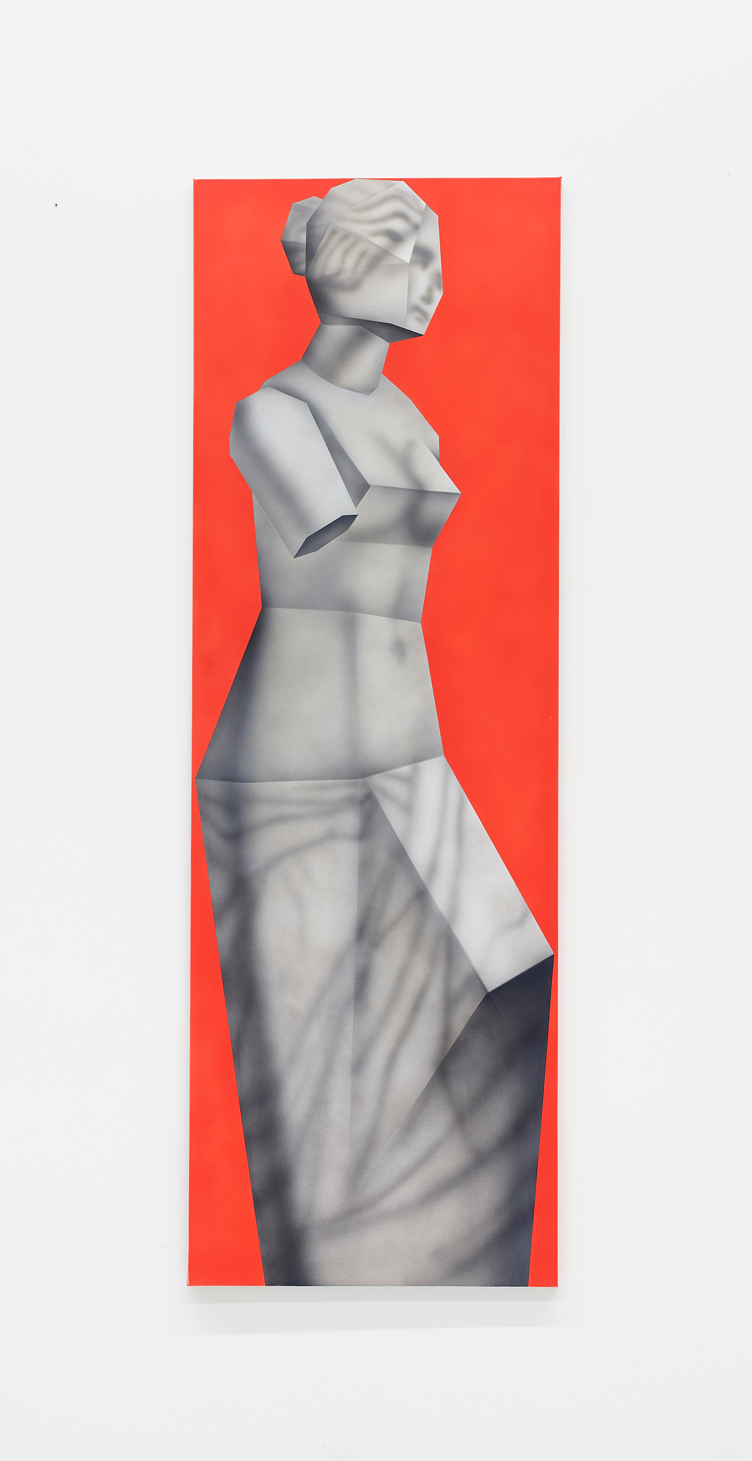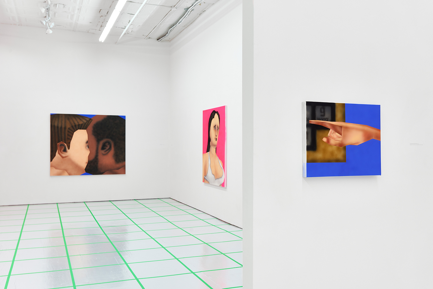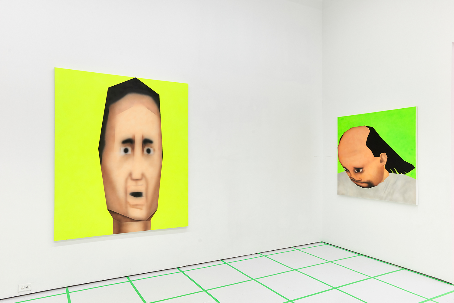 While the style is very specific to mid-90s gamer culture, the existential themes in the work are timeless, or at least date from the Pop era where depth was found in shallowness. The artist aligns himself with the Neo-Pop movement, pushing a palette of primary neons and surfaces from blurred airbrush to hard-edge. If oil painting was invented to paint the illusion of living flesh, acrylic is a great way to make it look dead: neon paint has enjoyed a resurgence as well for kids who grew up staring at screens, as it is the easiest way to make a painting look lit-up. The human eye is drawn to backlit or glowing things, and these paintings both entice and repel. I would call them dystopian but I personally find them so fun and upbeat; I guess it depends whether you like the thrill of the ground disappearing beneath you as you accelerate into the unknown future!