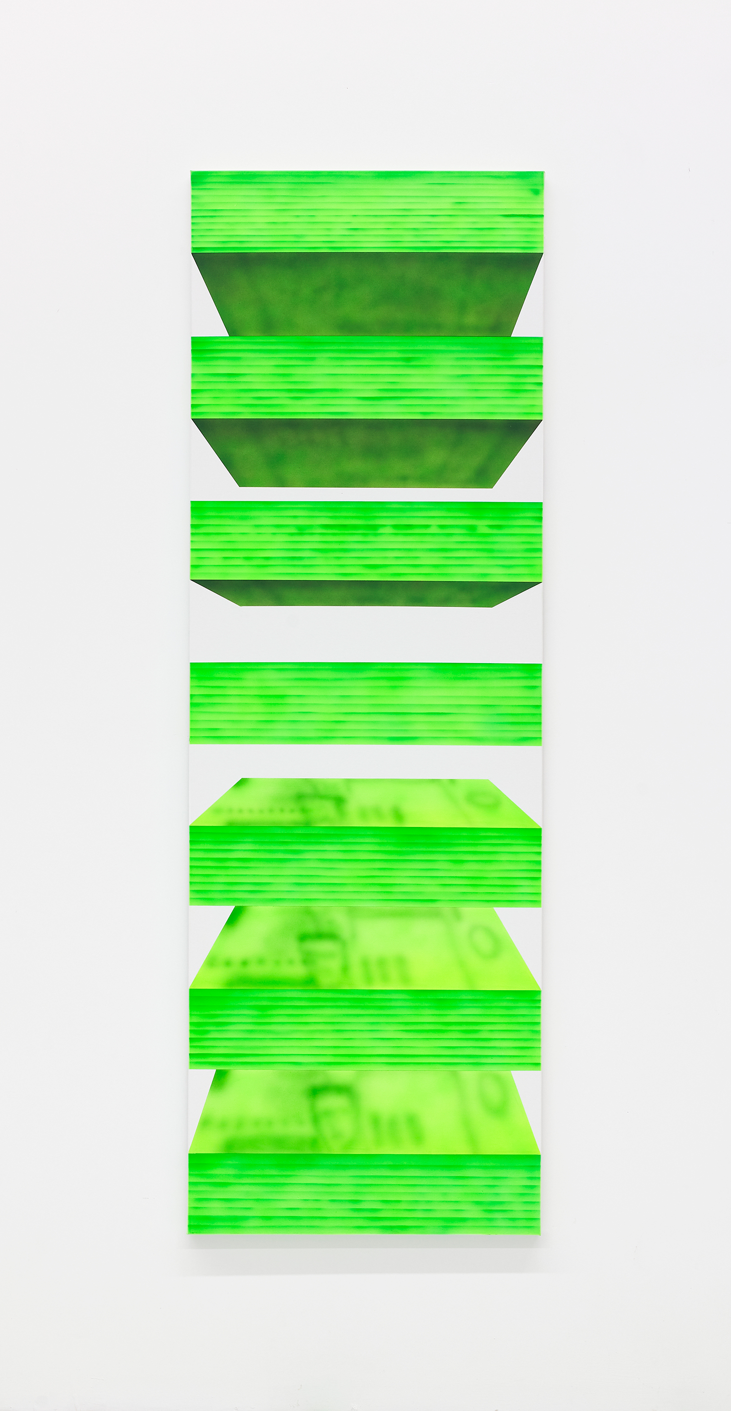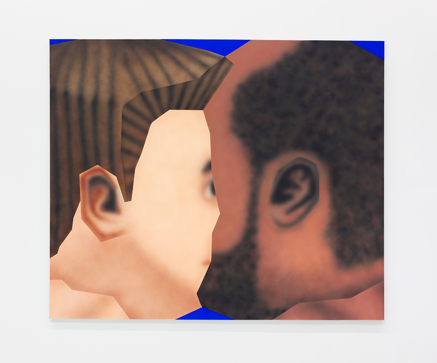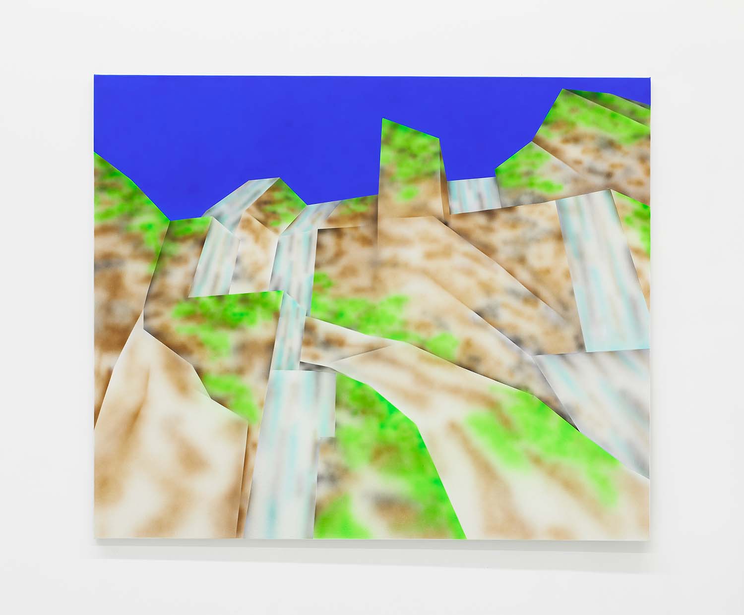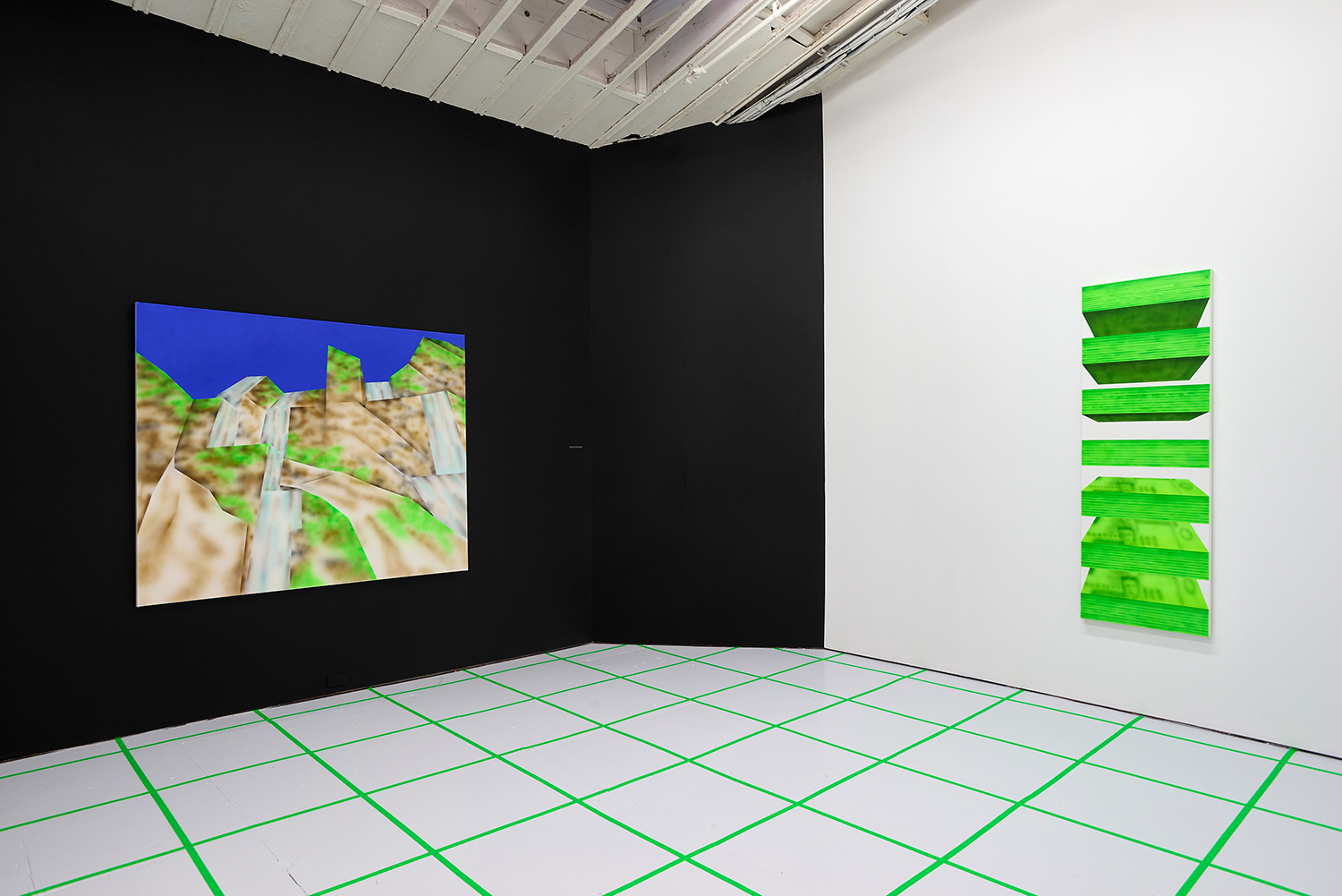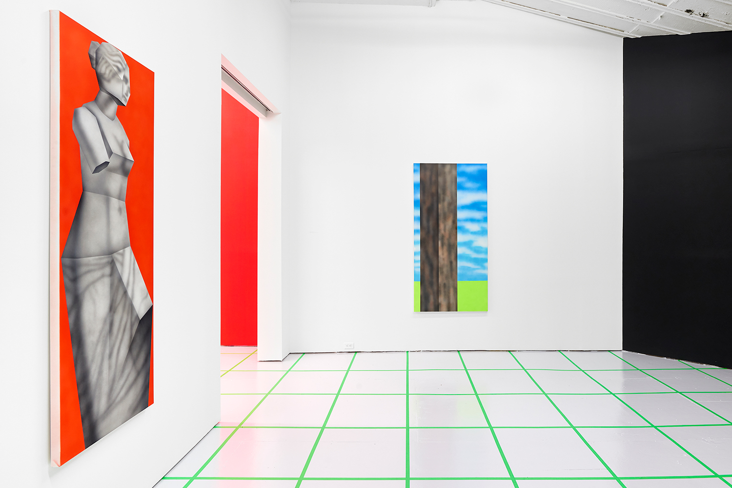 While the style is very specific to mid-90s gamer culture, the existential themes in the work are timeless, or at least date from the Pop era where depth was found in shallowness. The artist aligns himself with the Neo-Pop movement, pushing a palette of primary neons and surfaces from blurred airbrush to hard-edge. If oil painting was invented to paint the illusion of living flesh, acrylic is a great way to make it look dead: neon paint has enjoyed a resurgence as well for kids who grew up staring at screens, as it is the easiest way to make a painting look lit-up. The human eye is drawn to backlit or glowing things, and these paintings both entice and repel. I would call them dystopian but I personally find them so fun and upbeat; I guess it depends whether you like the thrill of the ground disappearing beneath you as you accelerate into the unknown future!