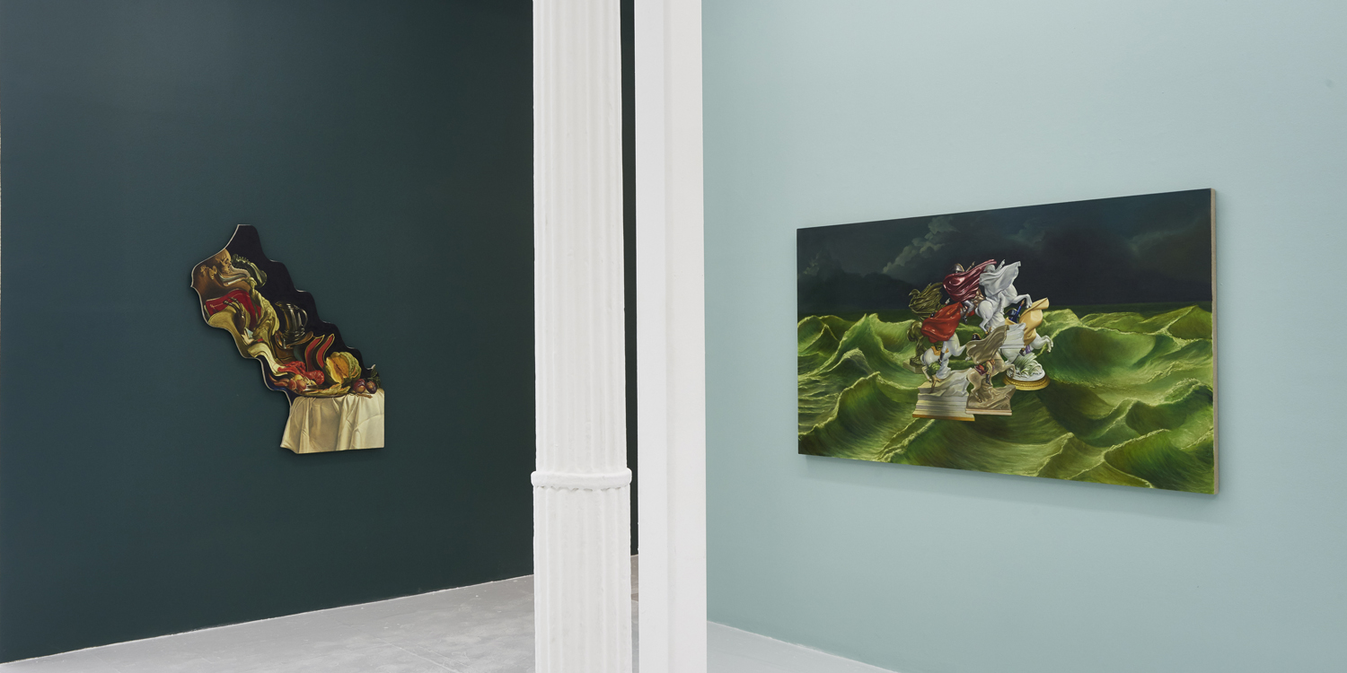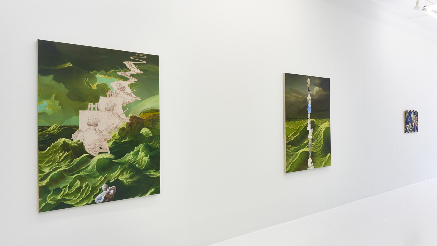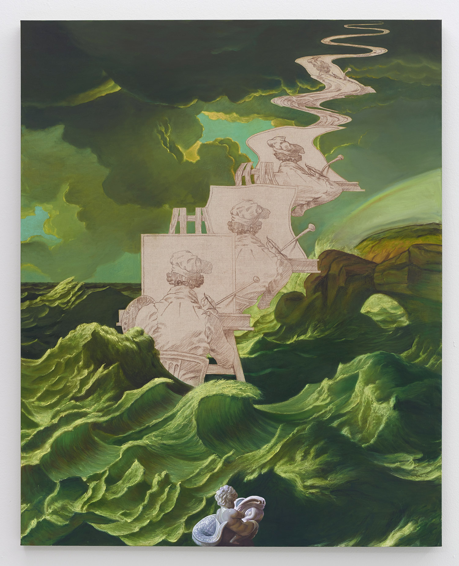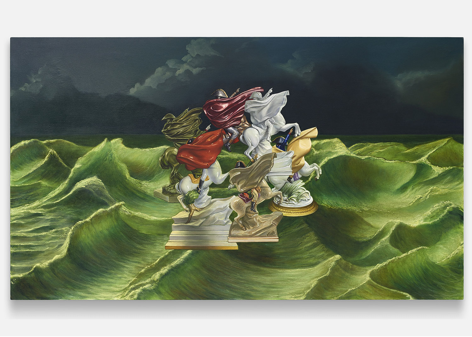 The second type of painting exhibited here is another form of art historical update featuring the stormy seas of late Romantic painting. Building on his last sea-focused exhibition at Yours Mine & Ours gallery last year, Hansel here raises choppy green waters under stormy skies. Porcelain figurines—often stand-ins for the viewer—watch from a safe distance, while in another work a depiction of the artist at their easel is quite out to sea. One intrepid group of Napoleonic figurines brave the waters; the ridiculously caped horsed figures prepare for battle, but the beautiful luminescence of the waves around them looks like the storm has already passed.