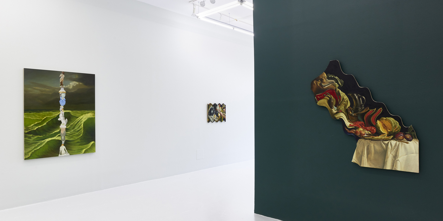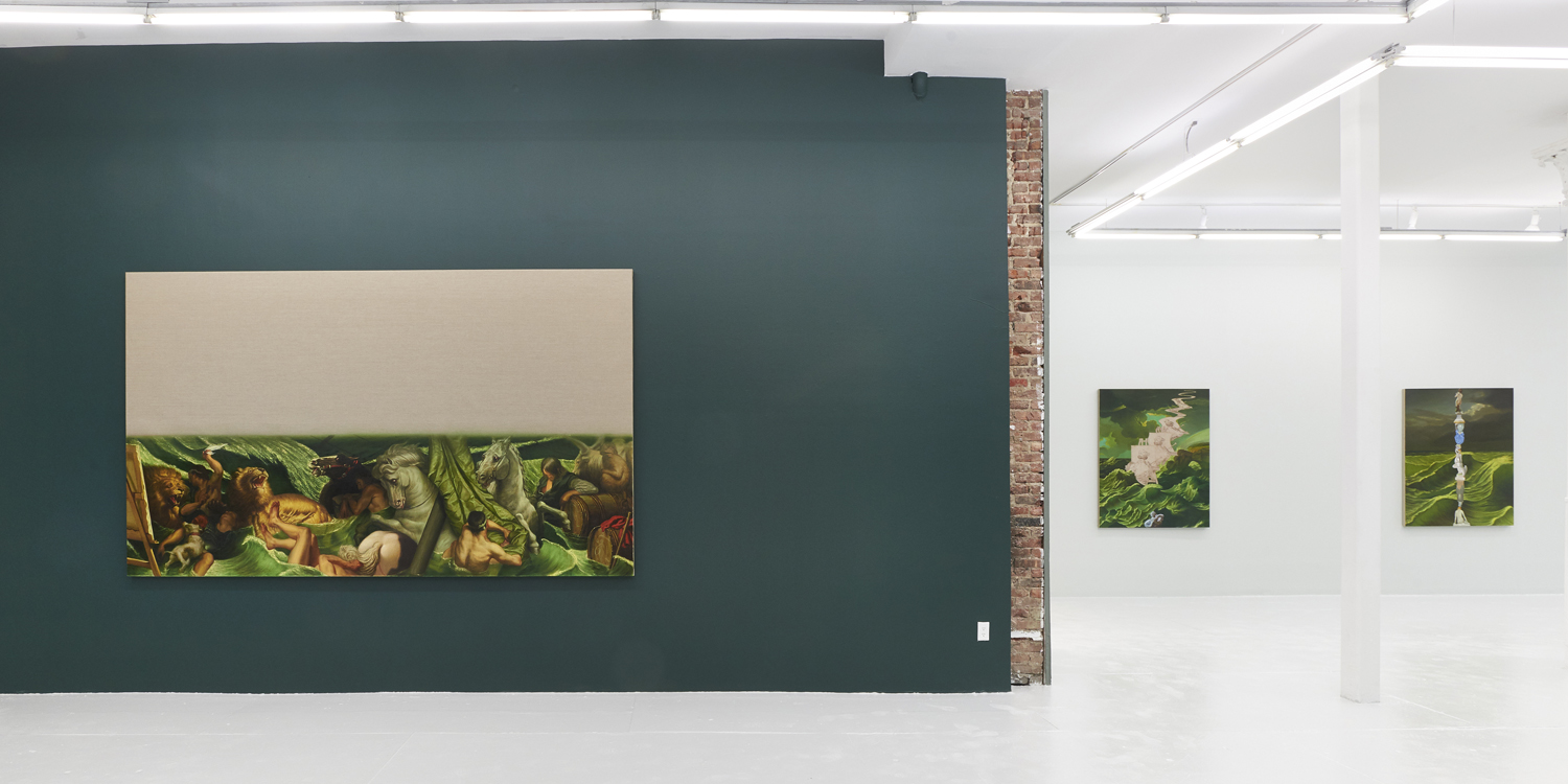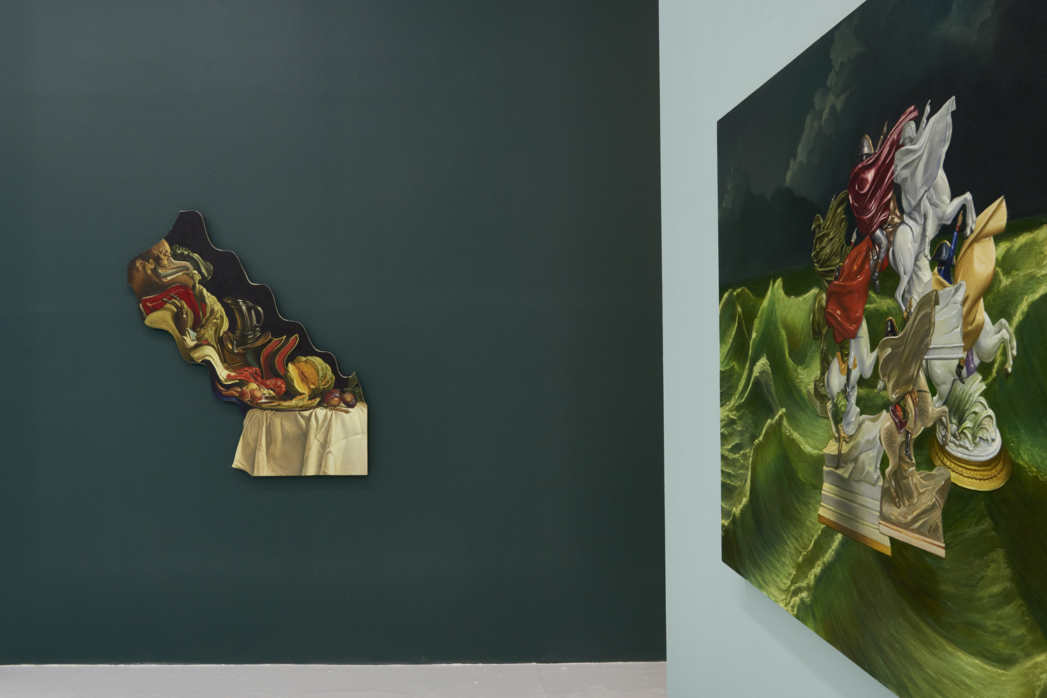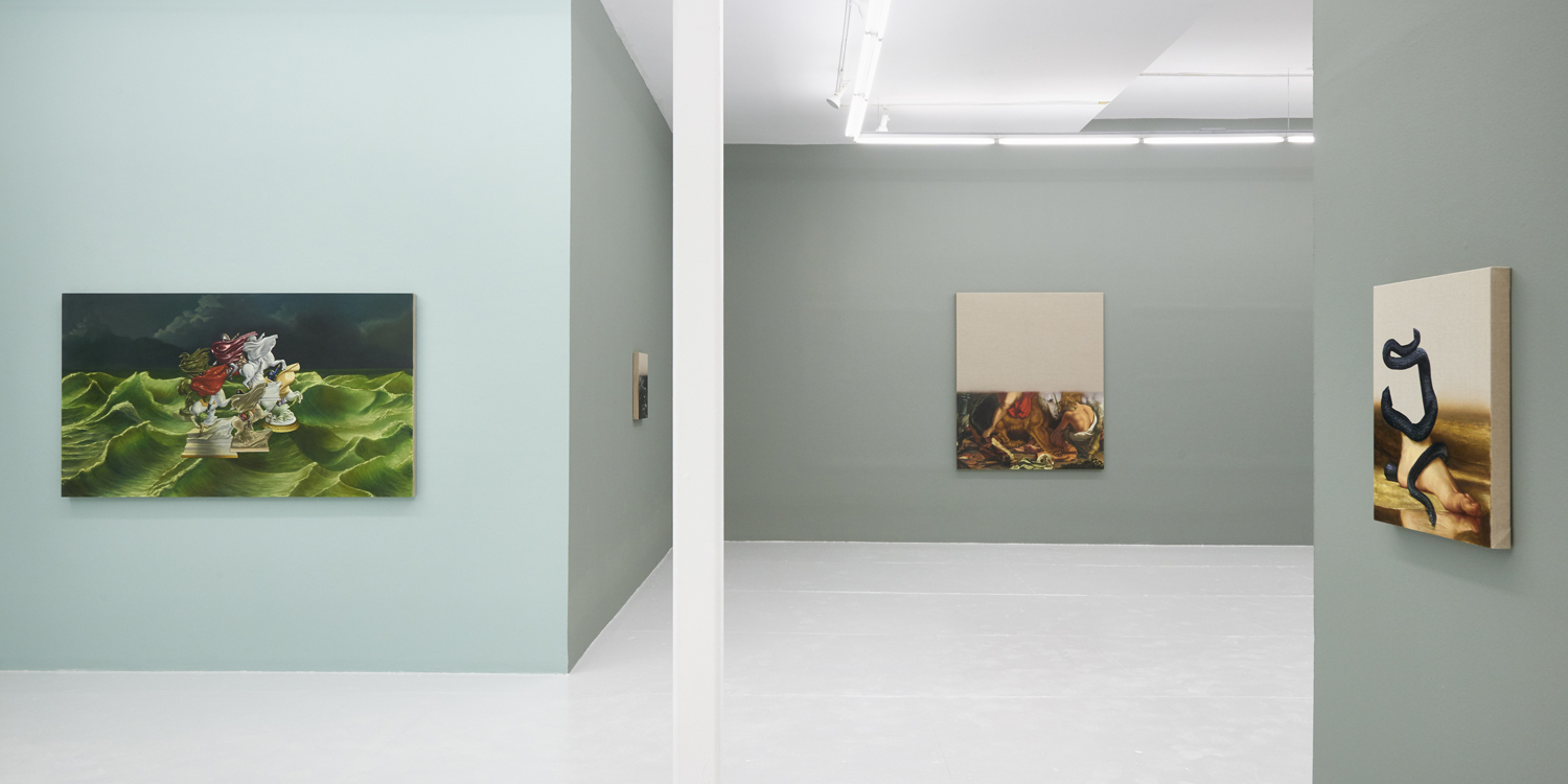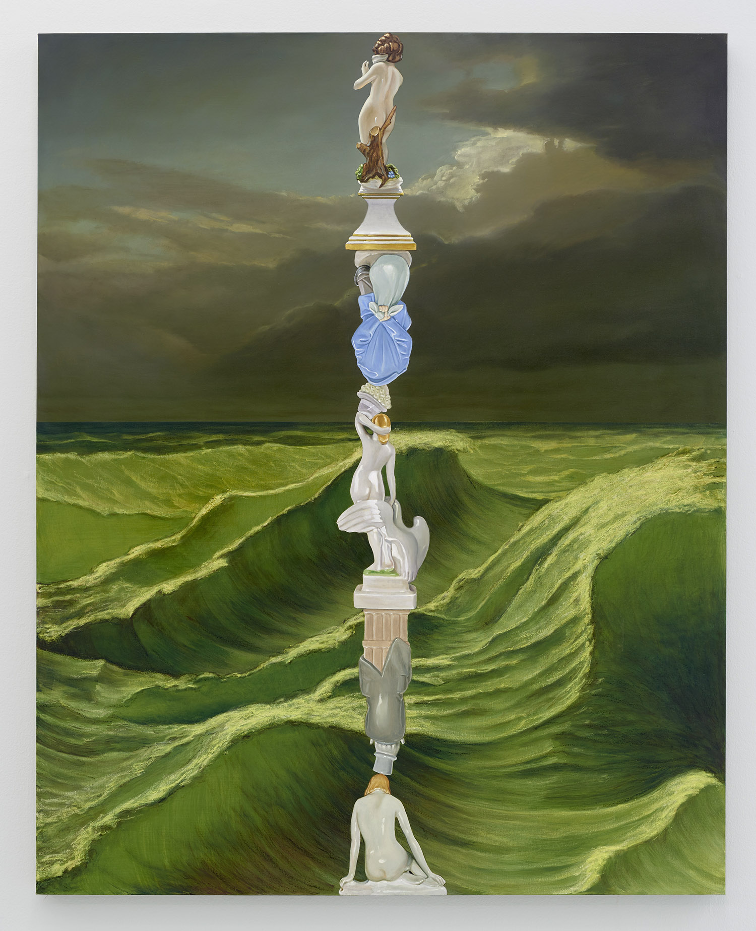 The second type of painting exhibited here is another form of art historical update featuring the stormy seas of late Romantic painting. Building on his last sea-focused exhibition at Yours Mine & Ours gallery last year, Hansel here raises choppy green waters under stormy skies. Porcelain figurines—often stand-ins for the viewer—watch from a safe distance, while in another work a depiction of the artist at their easel is quite out to sea. One intrepid group of Napoleonic figurines brave the waters; the ridiculously caped horsed figures prepare for battle, but the beautiful luminescence of the waves around them looks like the storm has already passed.