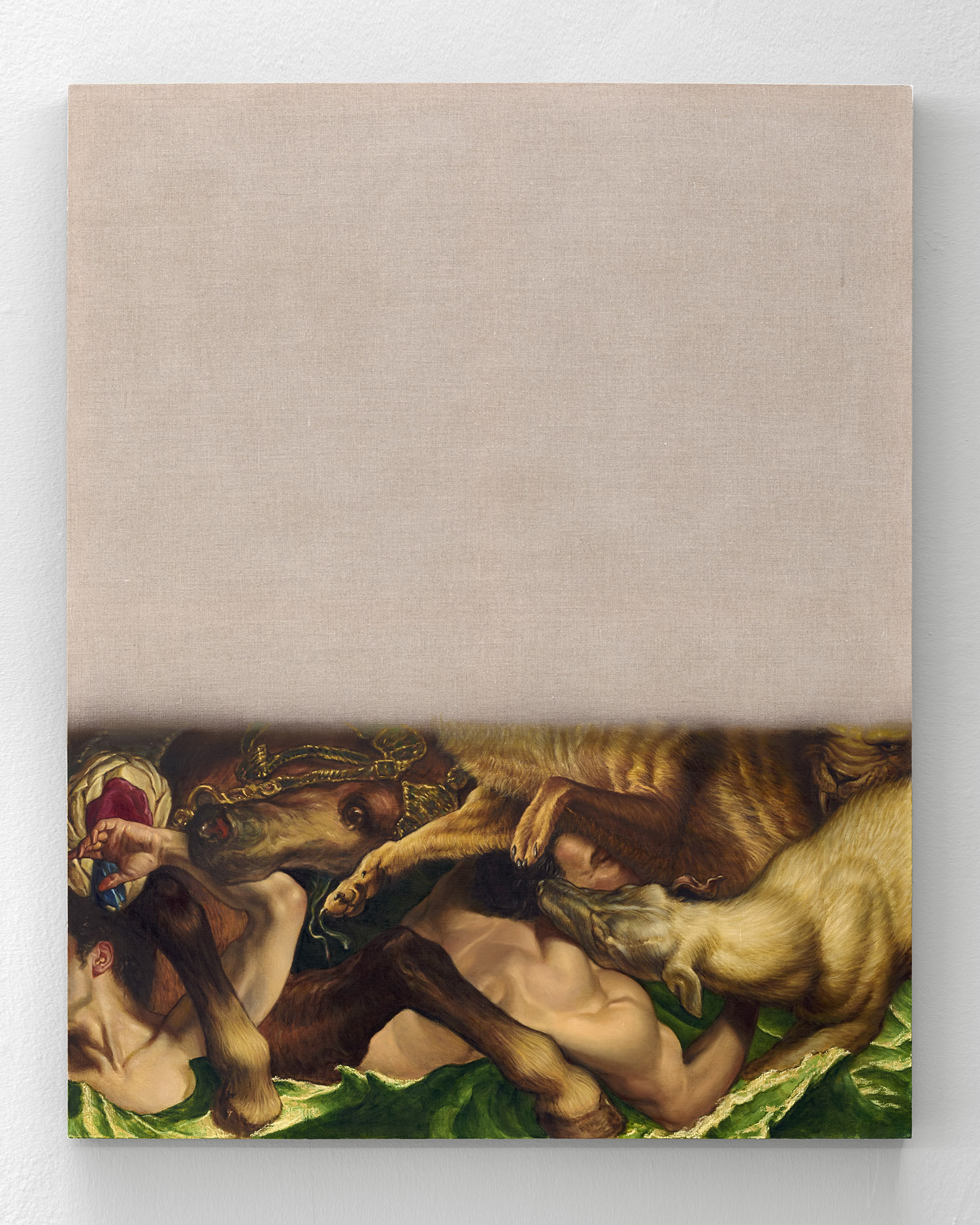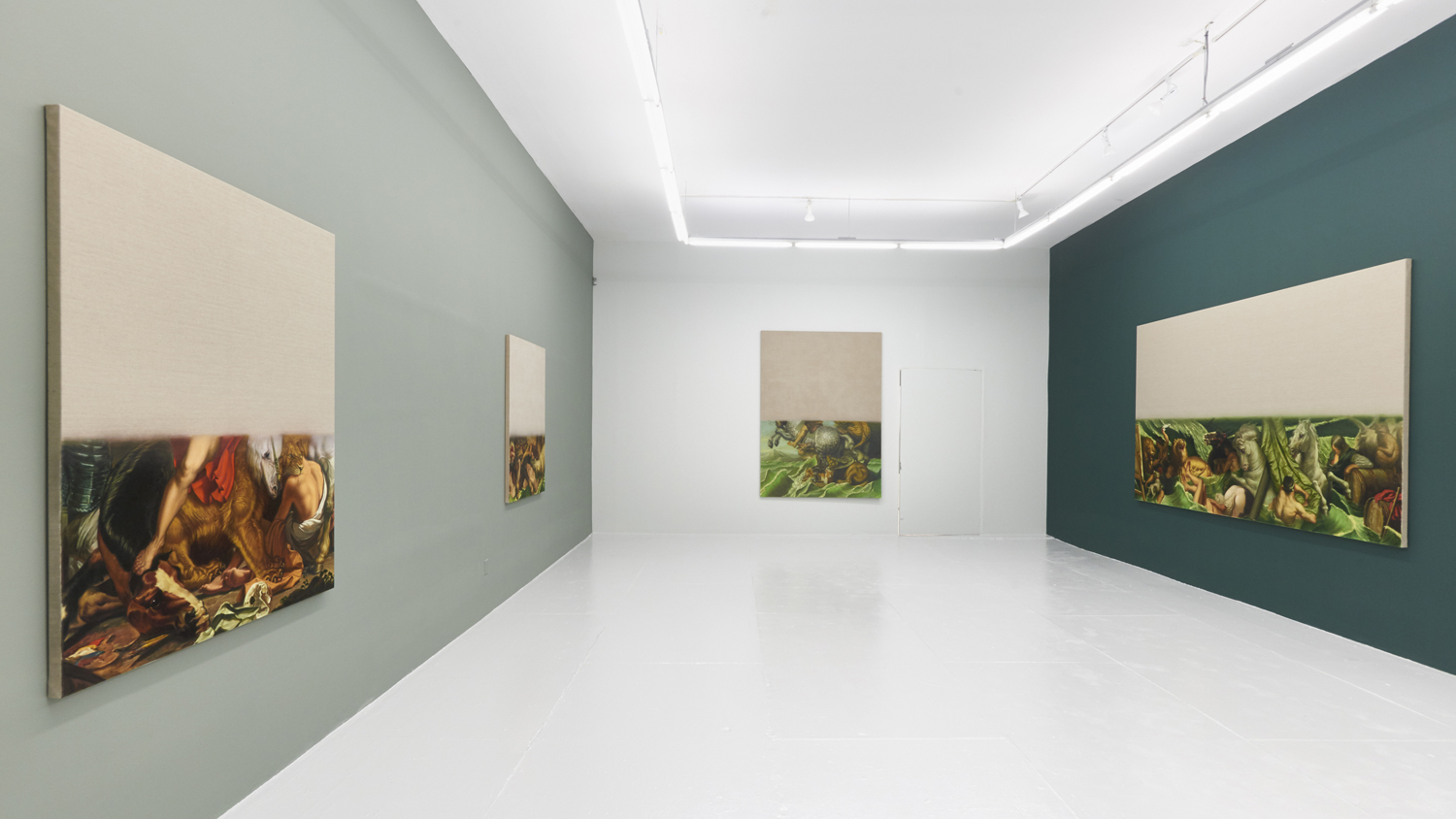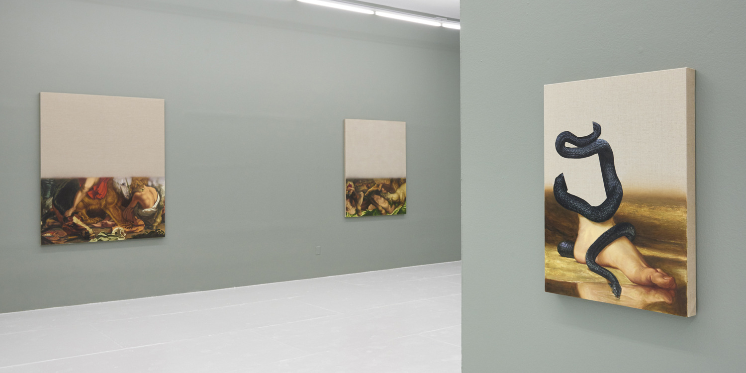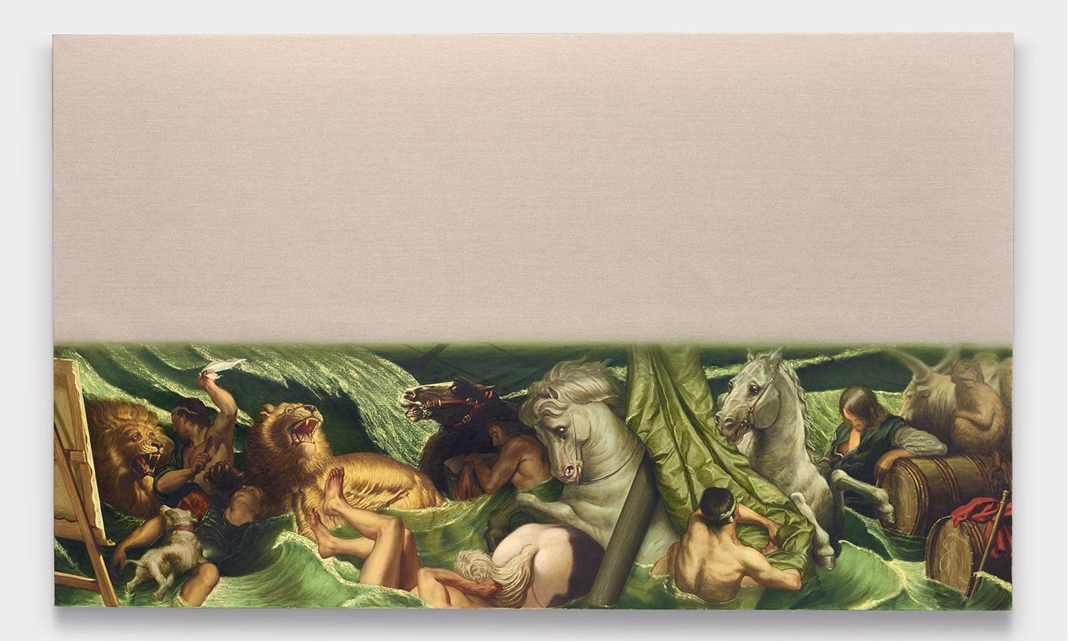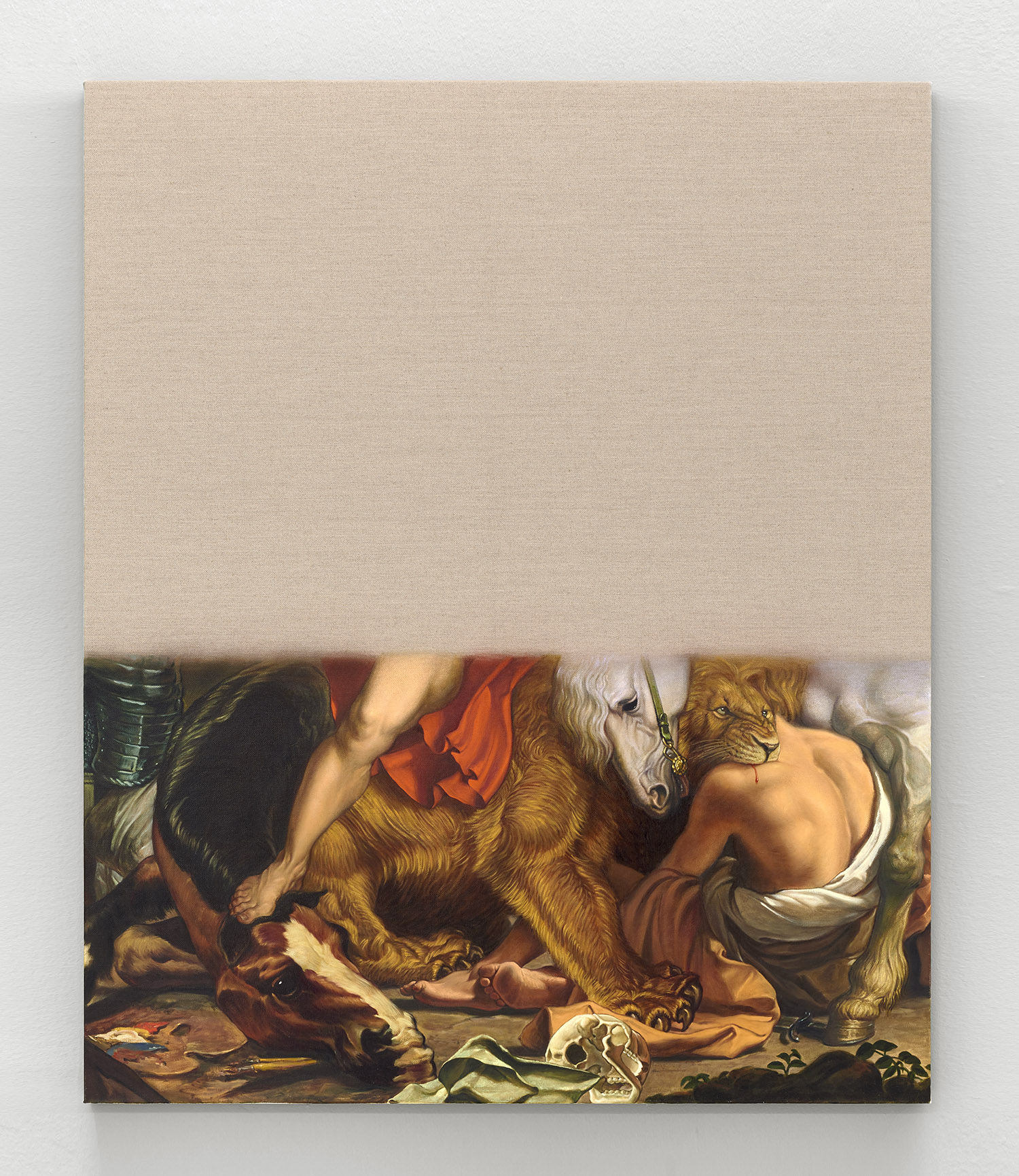 The final works in the exhibition are disappearing Delacroix. In these works a large expanse of raw linen dominates the piece and only the lower half or third of the canvas is painted. At the bottom of each canvas, writhing lions and horses and men jostle together, excerpted from the famous works of Eugene Delacroix, whose recent major exhibition at the MET many New Yorkers will have fresh in memory. Humorously grouping together incongruous characters and settings—while also throwing in a few paint brushes and easels—Hansel depicts a mish-mash of familiar moments as if they were disappearing, or perhaps still loading. The exciting bits of the artwork look like they have sunk down into the bottom of the work, the image has “settled” and the bottom section is the concentrate.