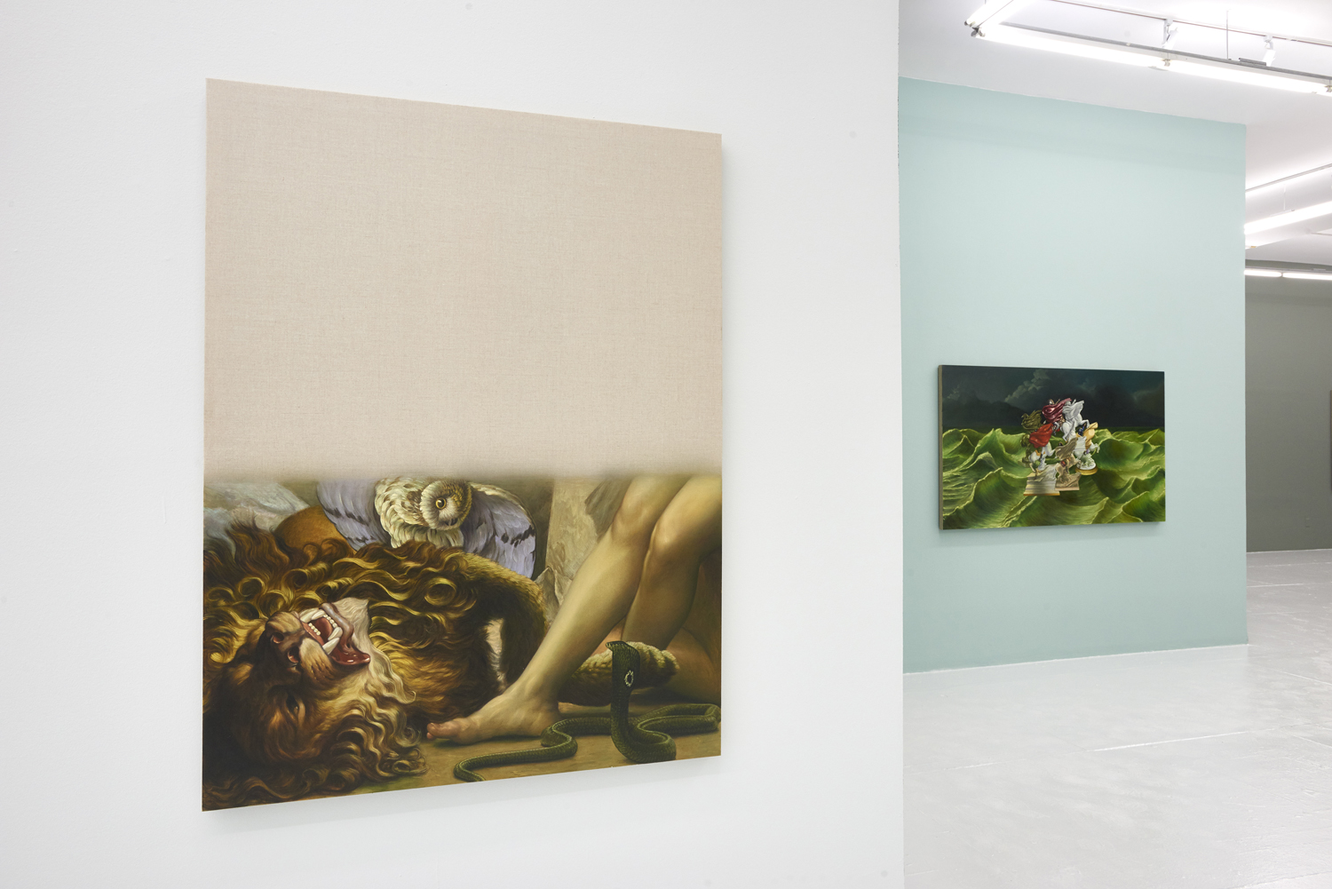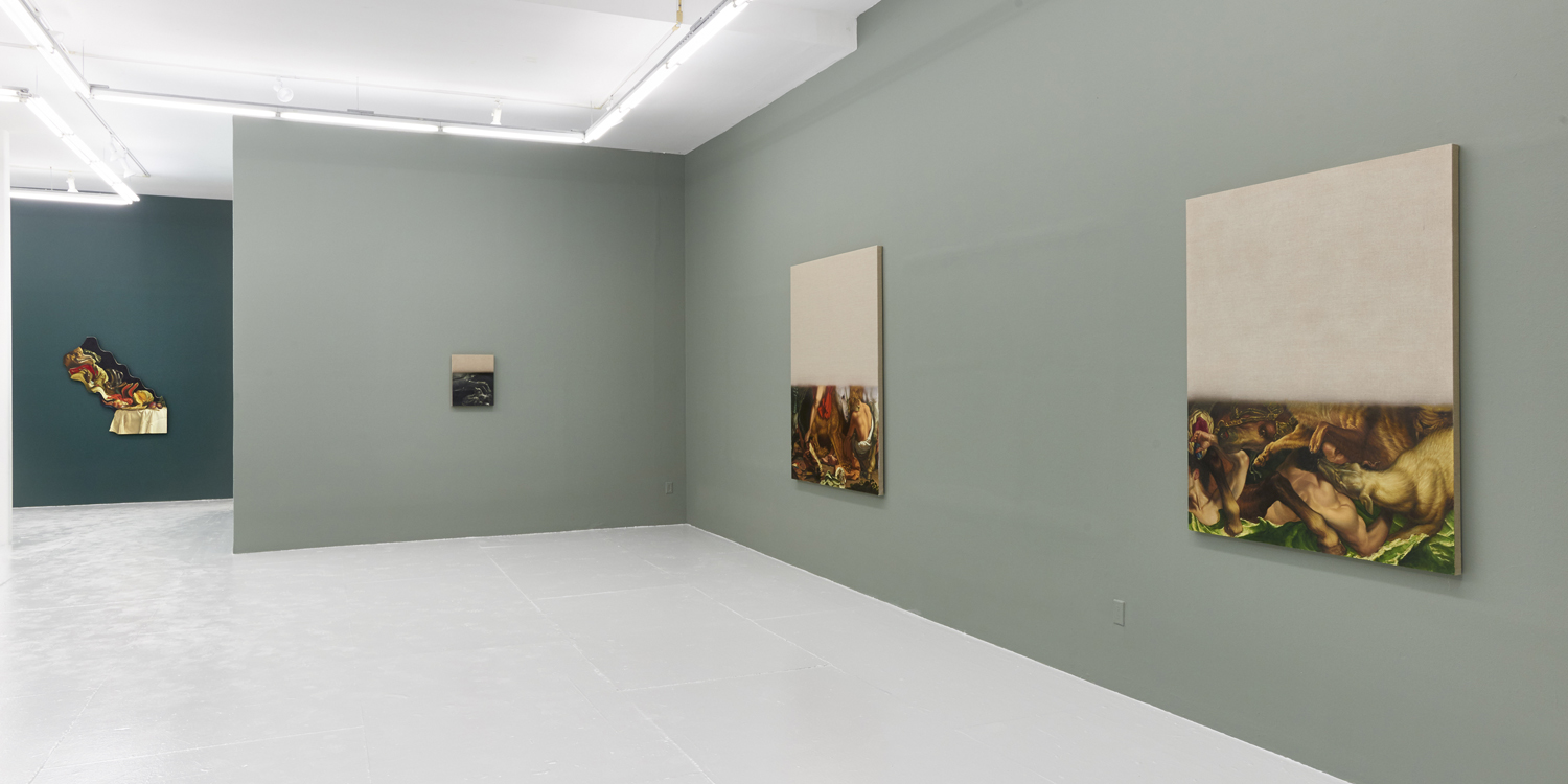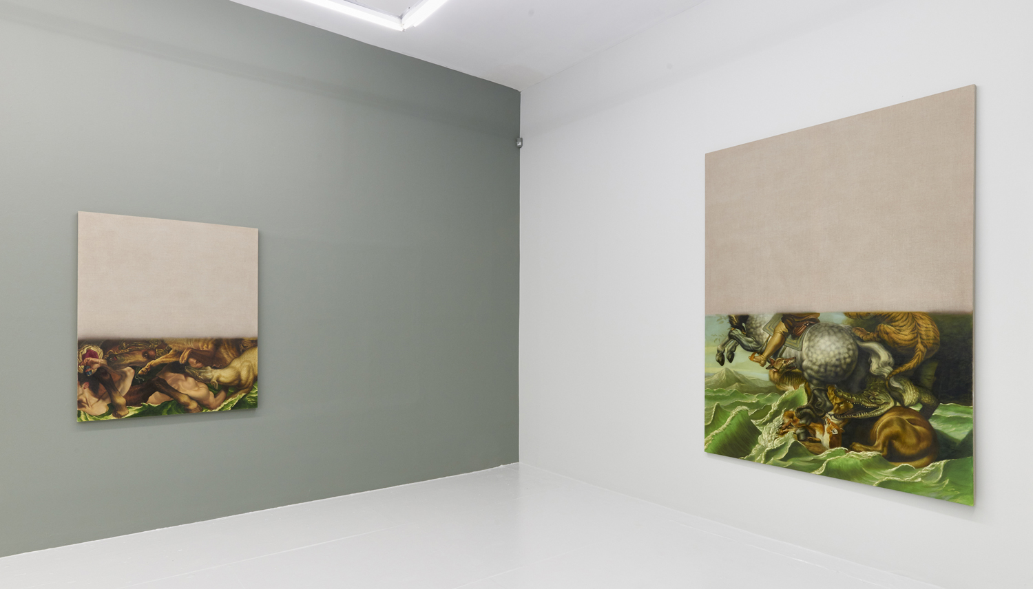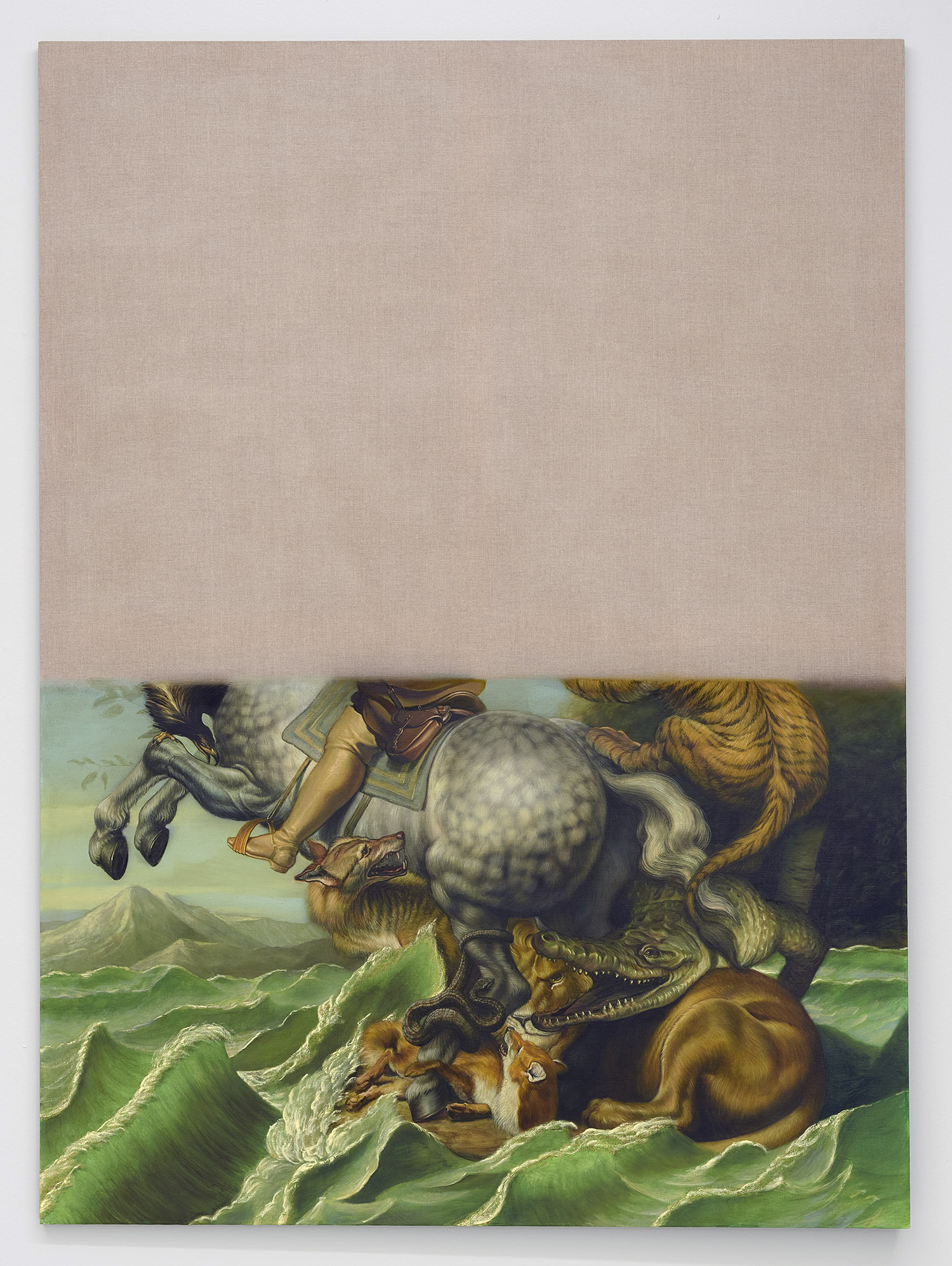 The final works in the exhibition are disappearing Delacroix. In these works a large expanse of raw linen dominates the piece and only the lower half or third of the canvas is painted. At the bottom of each canvas, writhing lions and horses and men jostle together, excerpted from the famous works of Eugene Delacroix, whose recent major exhibition at the MET many New Yorkers will have fresh in memory. Humorously grouping together incongruous characters and settings—while also throwing in a few paint brushes and easels—Hansel depicts a mish-mash of familiar moments as if they were disappearing, or perhaps still loading. The exciting bits of the artwork look like they have sunk down into the bottom of the work, the image has “settled” and the bottom section is the concentrate.