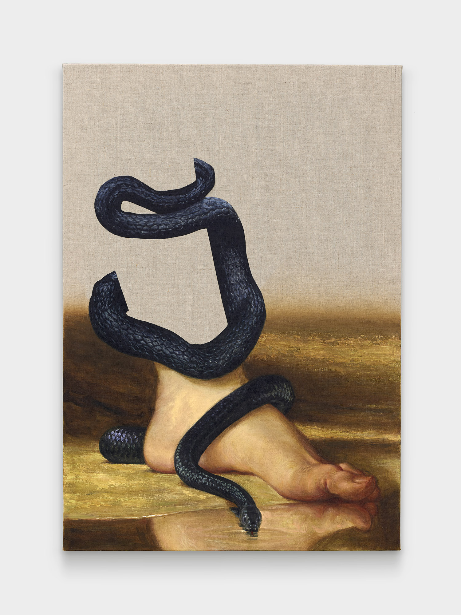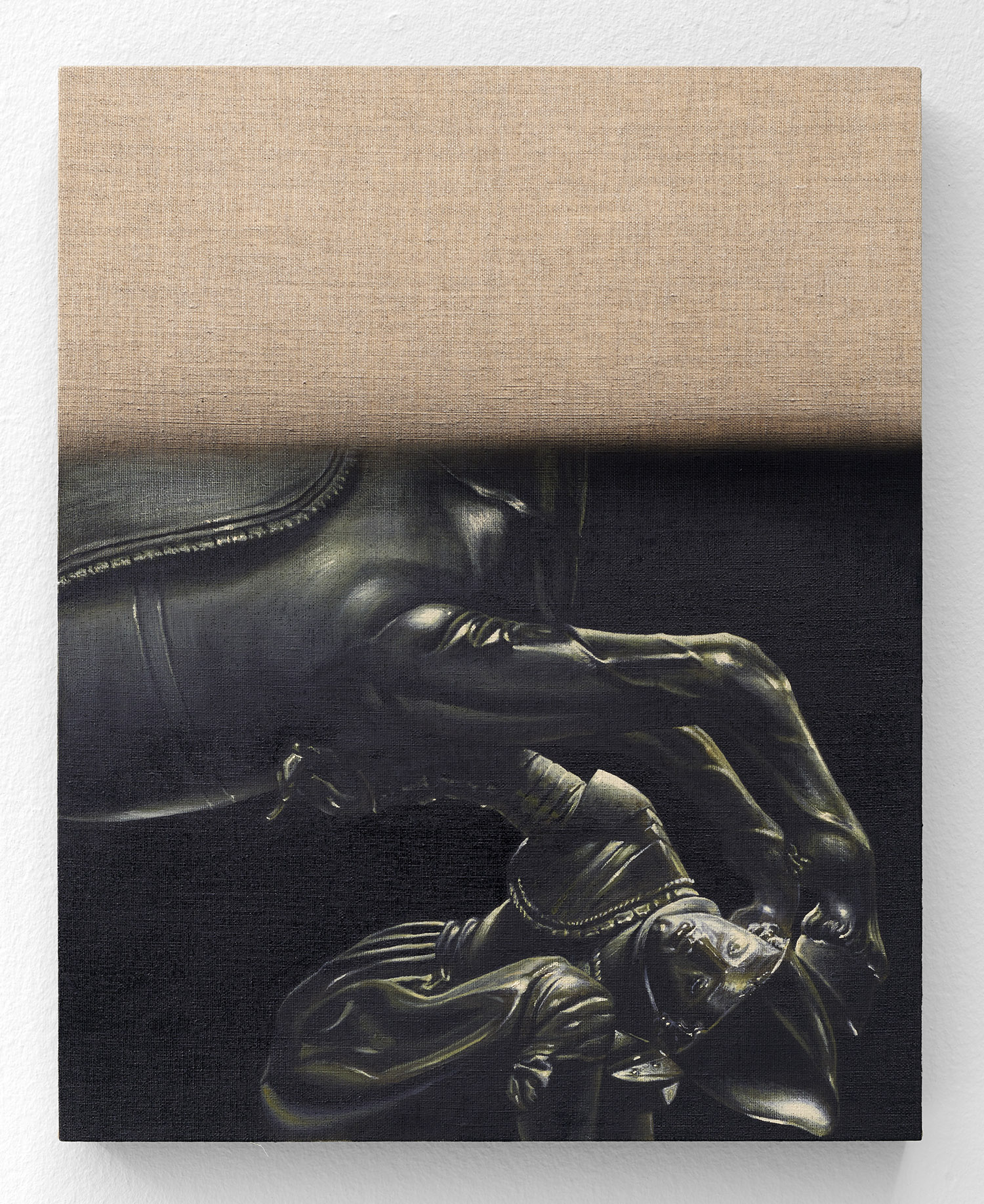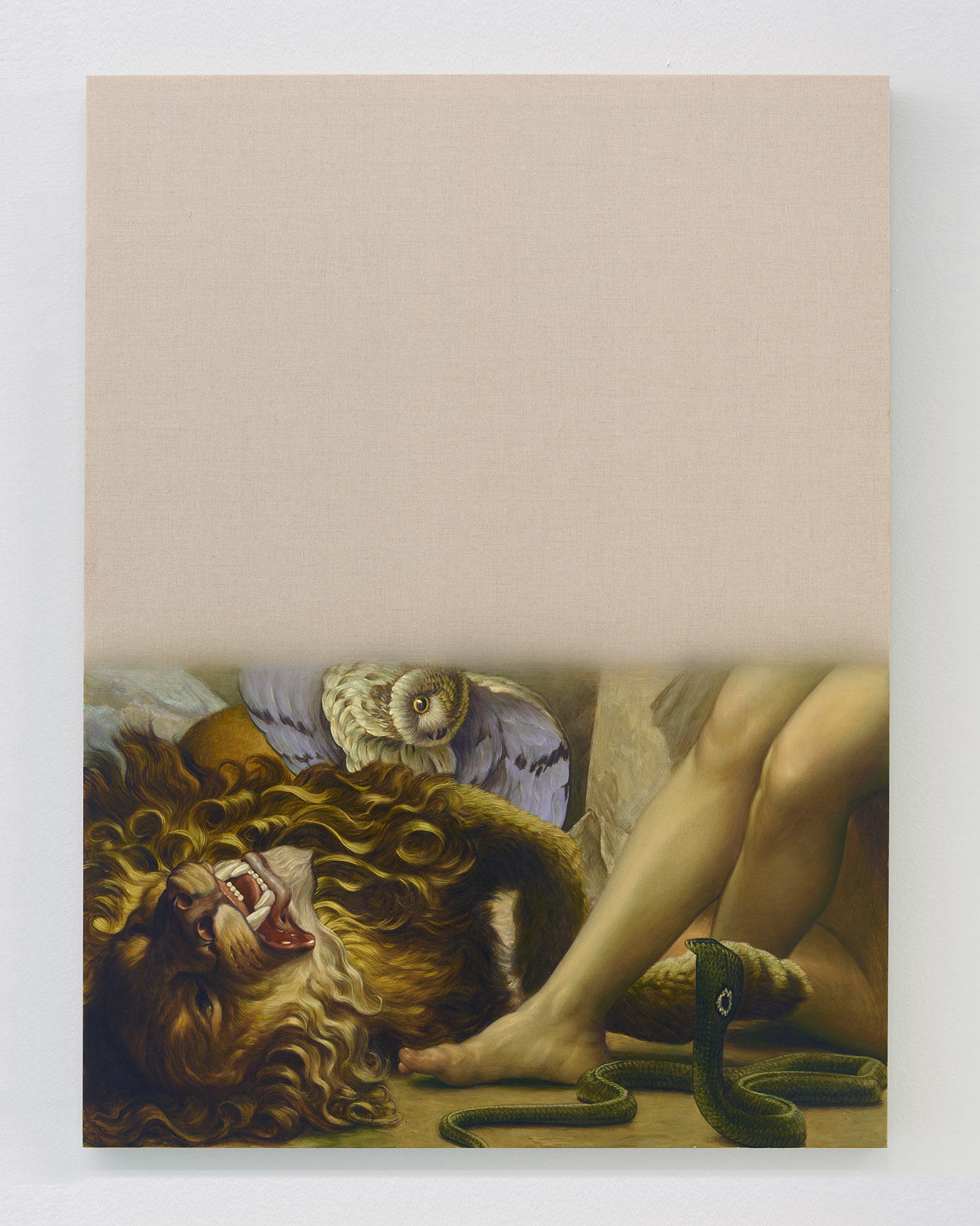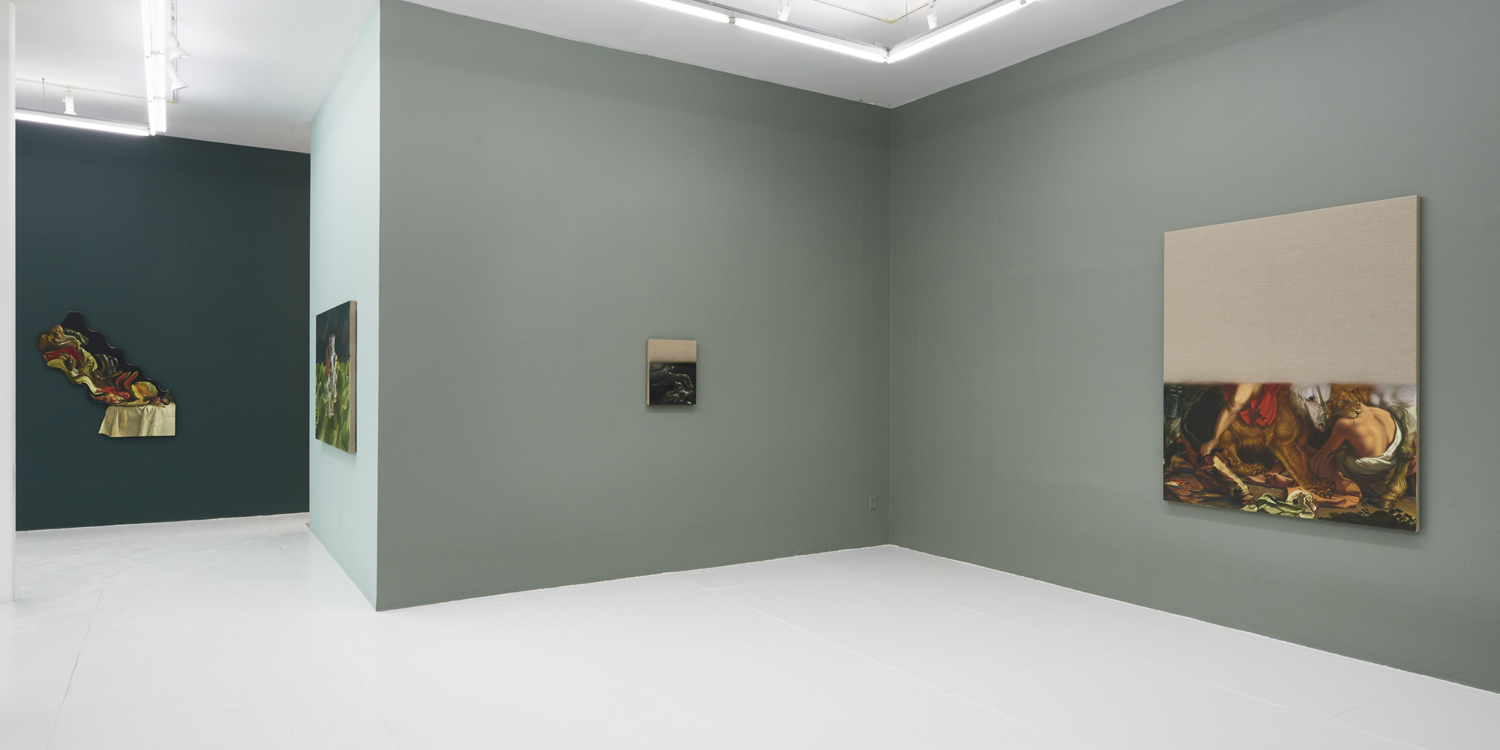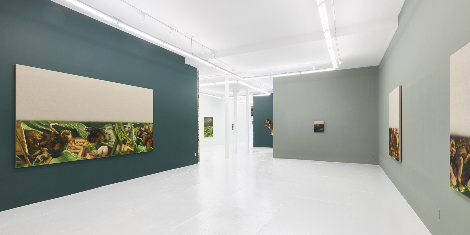 The final works in the exhibition are disappearing Delacroix. In these works a large expanse of raw linen dominates the piece and only the lower half or third of the canvas is painted. At the bottom of each canvas, writhing lions and horses and men jostle together, excerpted from the famous works of Eugene Delacroix, whose recent major exhibition at the MET many New Yorkers will have fresh in memory. Humorously grouping together incongruous characters and settings—while also throwing in a few paint brushes and easels—Hansel depicts a mish-mash of familiar moments as if they were disappearing, or perhaps still loading. The exciting bits of the artwork look like they have sunk down into the bottom of the work, the image has “settled” and the bottom section is the concentrate.
