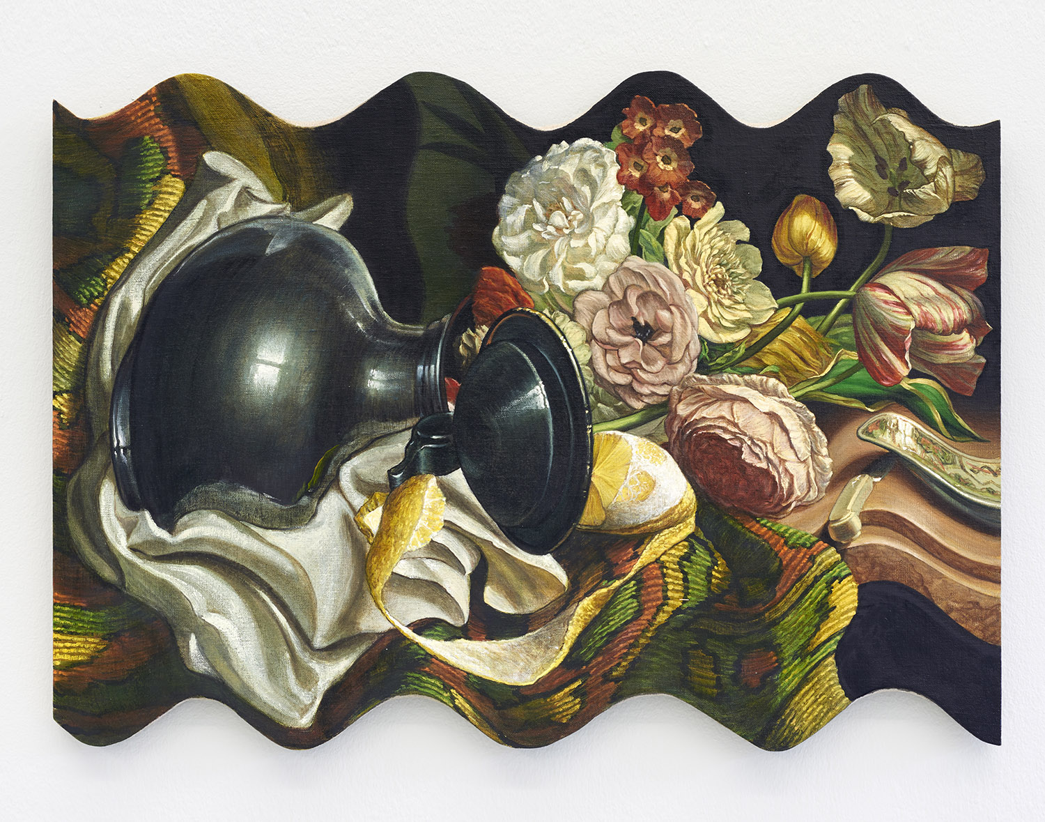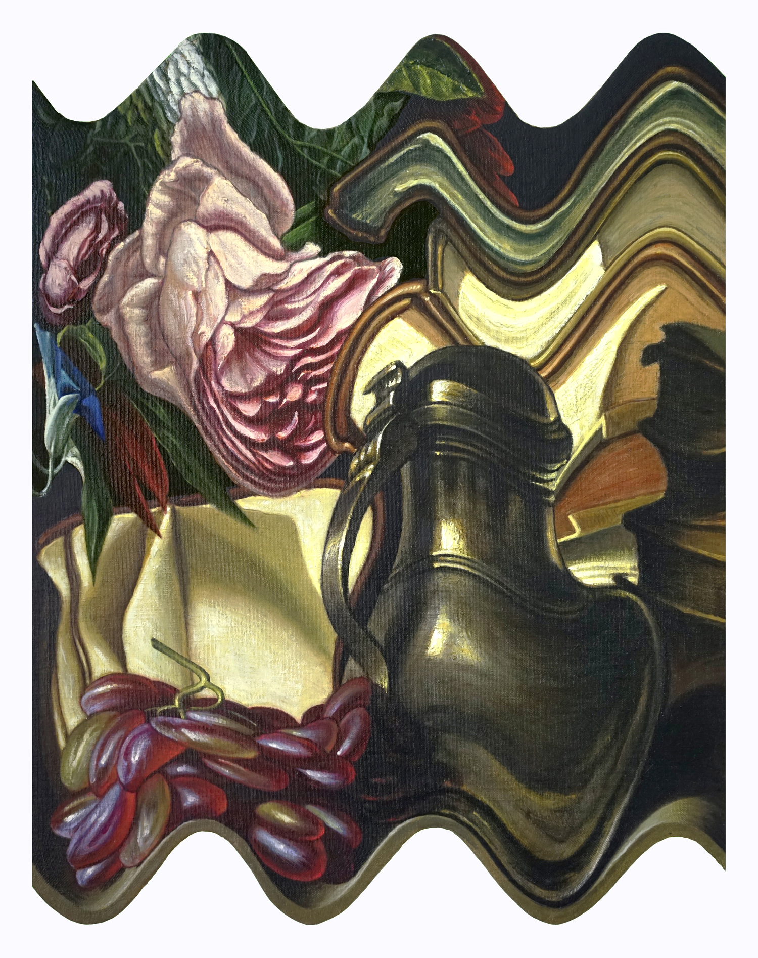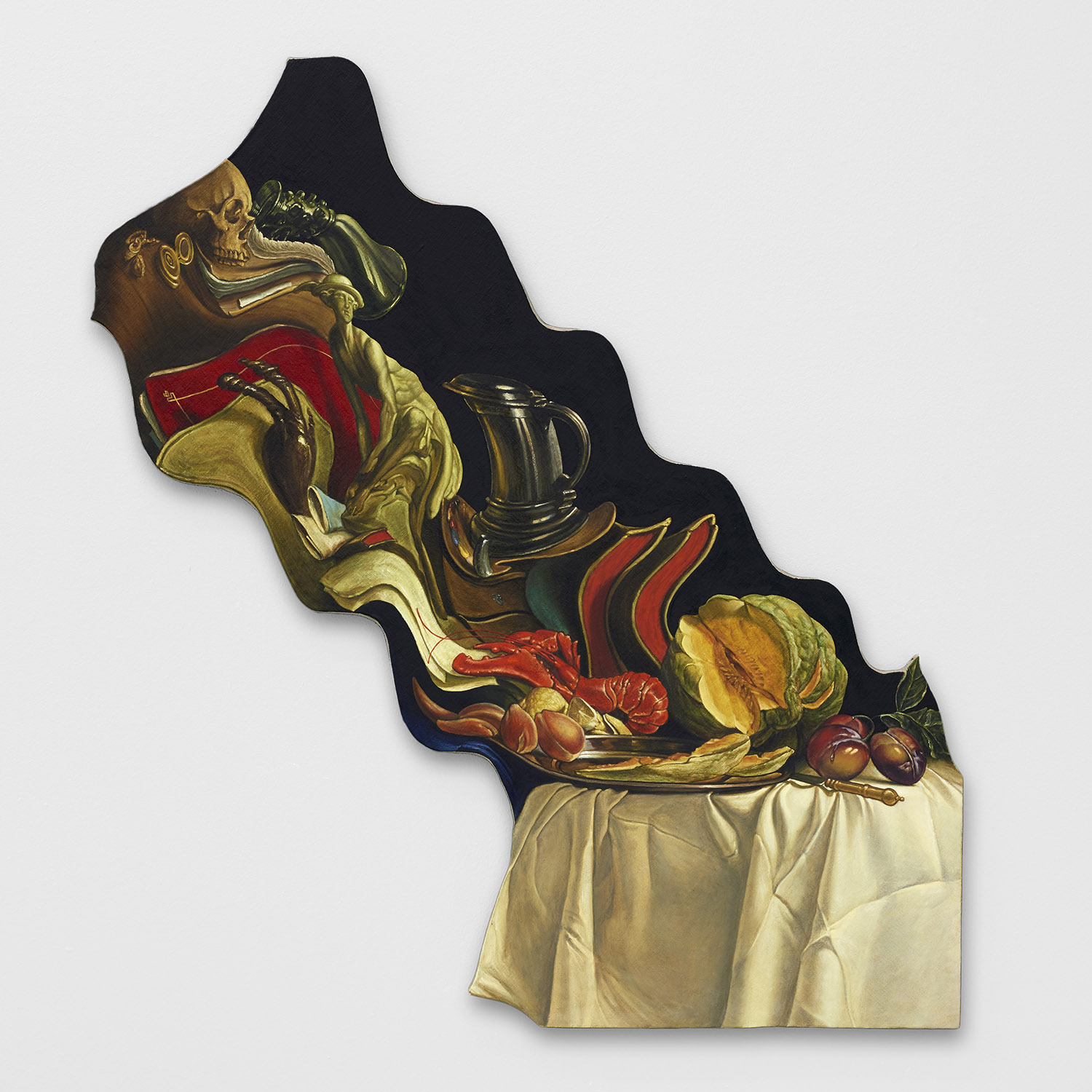 In what are perhaps his best known works—wave distorted Dutch still life paintings—Hansel originated his approach to updating famous works from art history with a technologically assisted distortion. Skulls, grapes, half-peeled lemons; and now lobsters, melons, tankards of ale, all sort of quasi-familiar from Heda, De Heem, Claesz or other Flemish masters are rendered pretty accurately, like a student faithfully copying their master in the atelier. They aren’t a perfect recreation but give you the flavor so to speak, and of course the meat of the matter is the distortion. Not just the image but the whole canvas structure has a wave going through it. Unlike Holbein’s analog anamorphism, Hansel uses digital tools to take our misremembered museum memories into a new era of imagery.