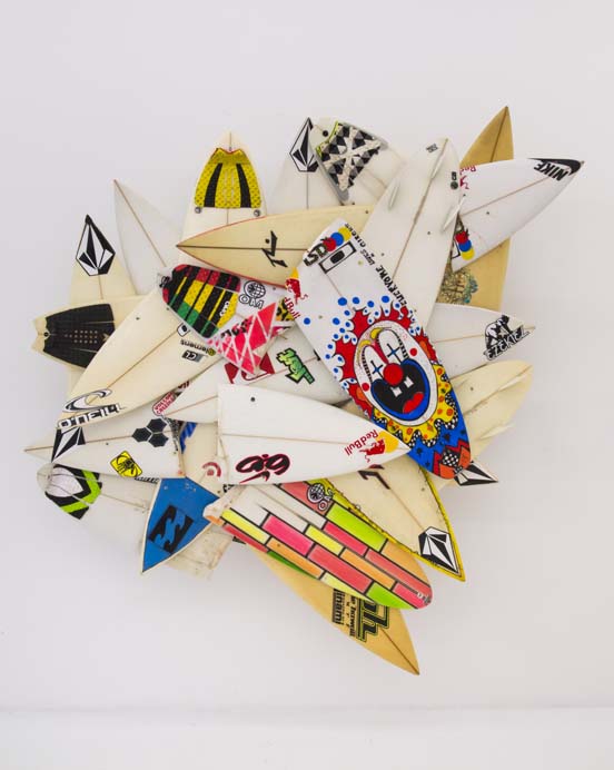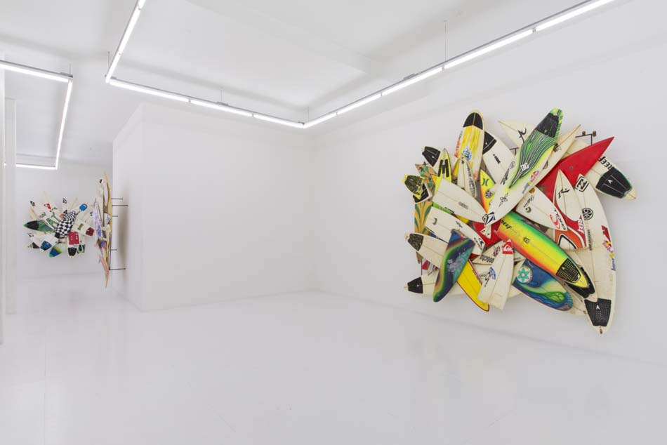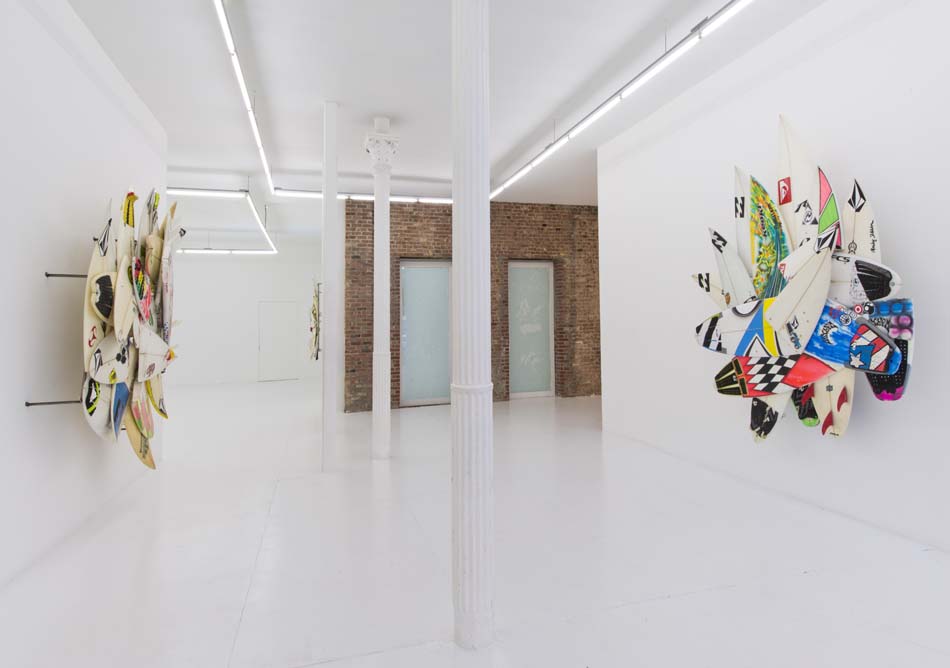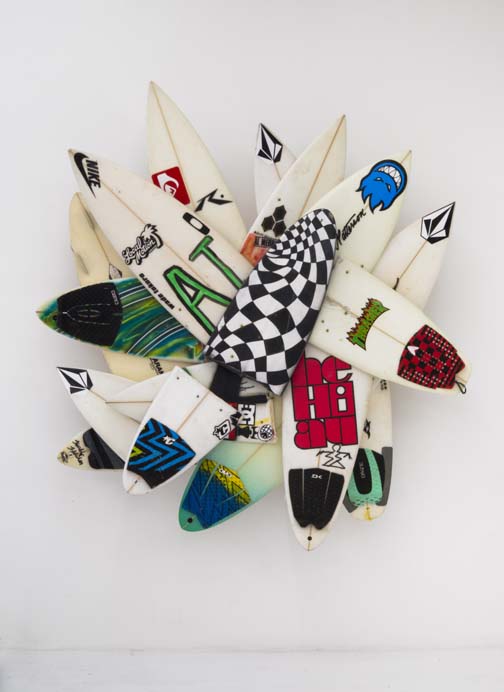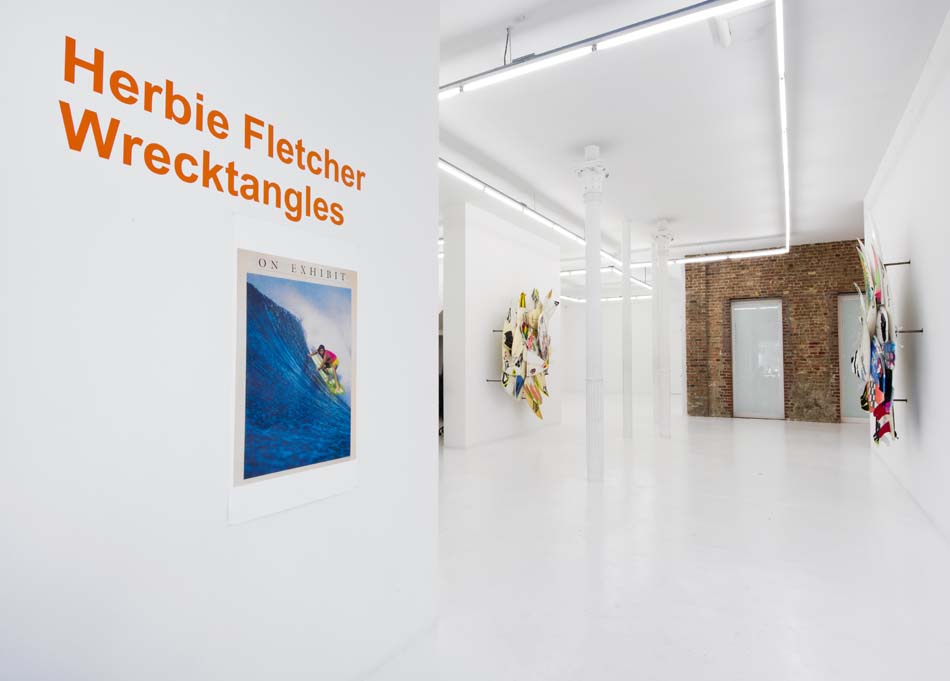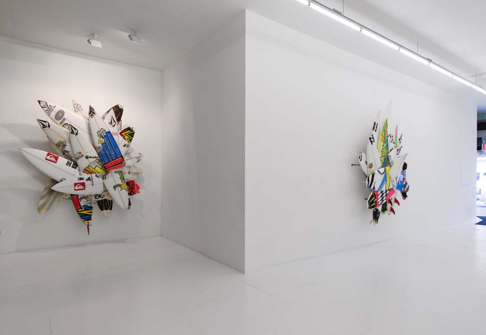 The Hole is very proud to present six major new works by surf legend and artist Herbie Fletcher in the main gallery at 312 Bowery. These artworks are massive and vital, like the huge waves this artist was known for pioneering during his fifty-year plus career as a surfer. These pieces are made from the wave-munched fragments of broken boards actually used when surfing giant waves. The thunderous force of the ocean is apparent in these jagged and mishapen “wrecktangles”, but perhaps the most eye-catching component is the various decals, traction pads, fins or logos that show both the personalization of each board and the sponsorship and awards circuits of pro surfing. The combination of the odd formal geometries of a late Frank Stella with the pop cacophony of logos and images, makes for a very interesting work of art that is charged with energy and life.