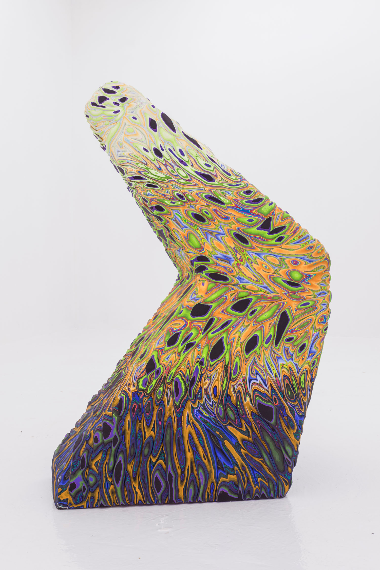 These “cutaways” were debuted at Venus LA earlier this year in a full show of multiple wall and floor pieces. Here we exhibit the longest piece from that show and a new partner completed recently with the same dimensions. These extreme panorama works were designed as mates in scale and palette, one featuring a cresting wave or perhaps a precipice, the other a plateau. Intervening between the paintings is a floor piece pictured above, showing how this type of “3D painting” can itself be turned into a 3D object, the shape of this work a “cliffhanger” as well.