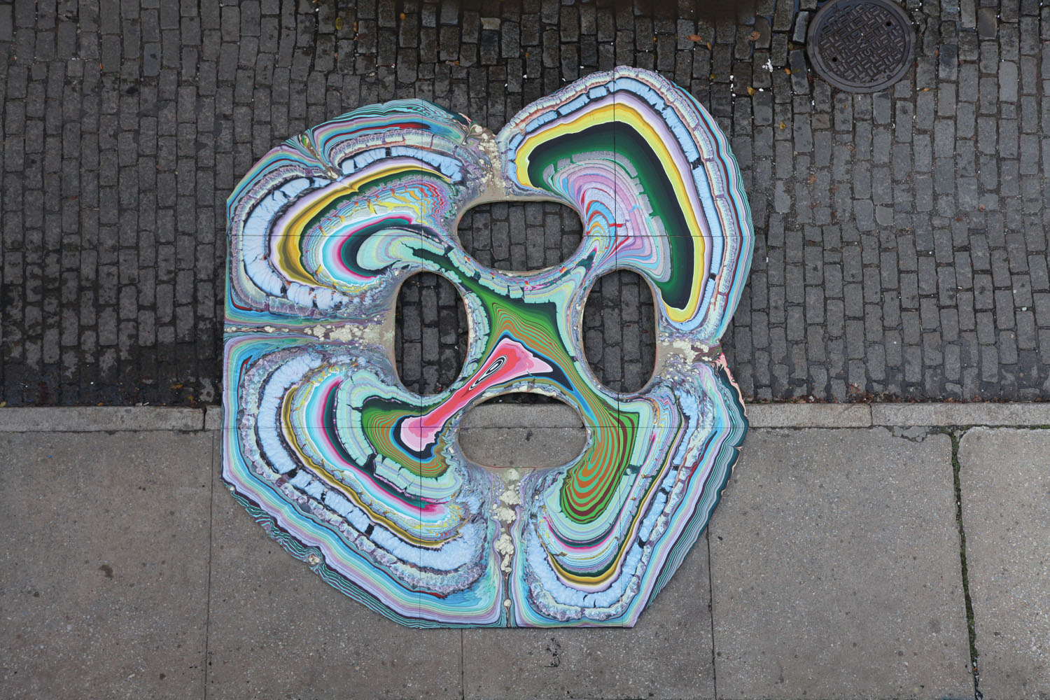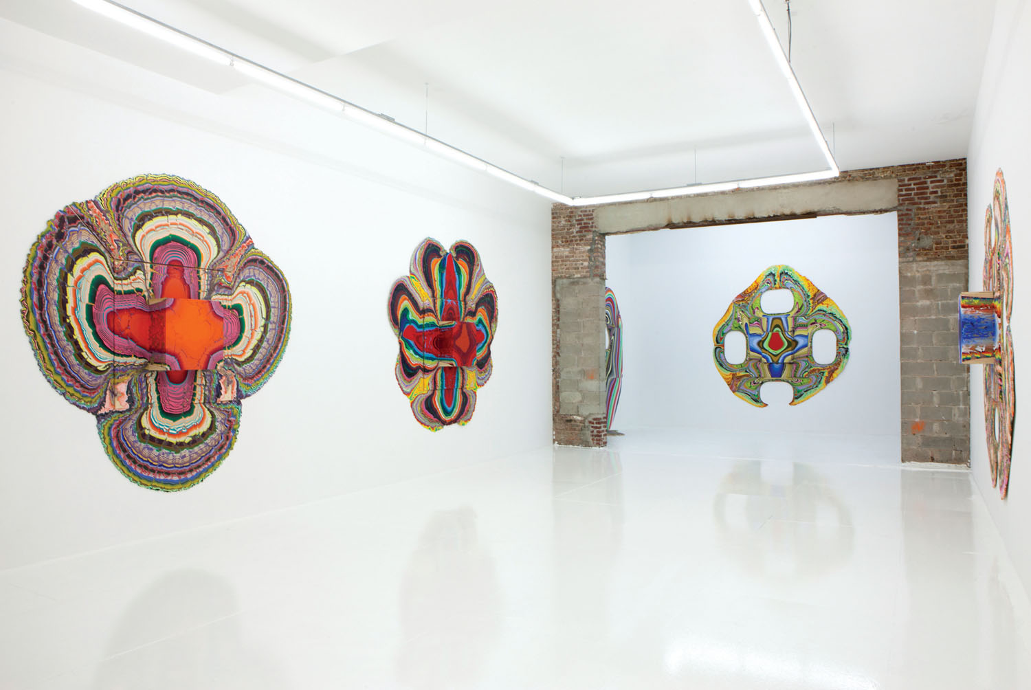 Rower’s pours come closer to the abstracting nature photos of Edward Weston than to the works of Pollock or de Kooning, painters who, even when most abstract, always left behind traces of the actions of their hands. Meanwhile, the breadth of suggestibility Rower’s pieces spans such a huge range: from the geode-type pieces to the brain scannish works, from spaceships to vertebrae to Northern Lights, lace antimacassars, ghoulish masks, surfaces of distant planets, adipose tissue, underwater mollusks, dendrites, coral, sexual bodies, Christian relics, mitochondria and Golgi complexes: it’s hard for the poetic mind not to run amok.
