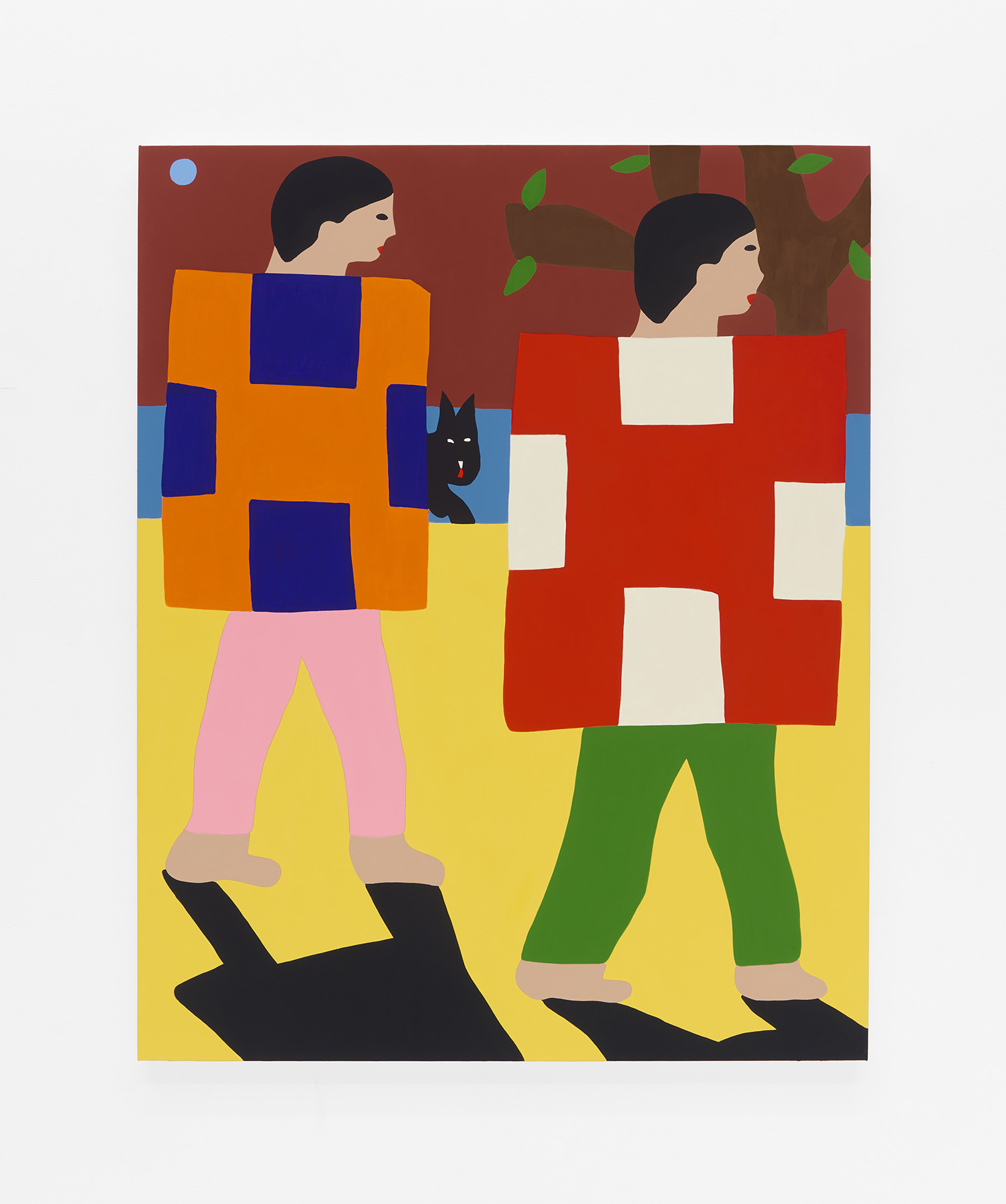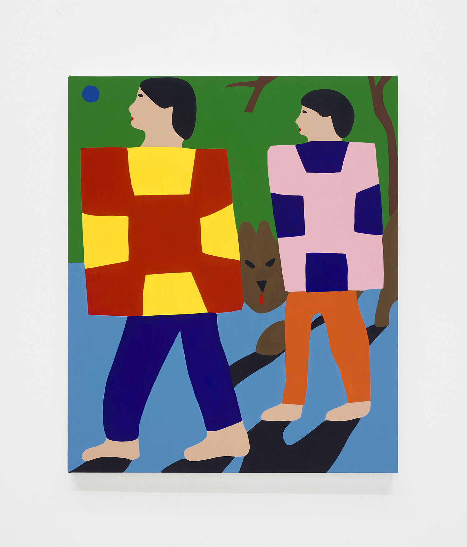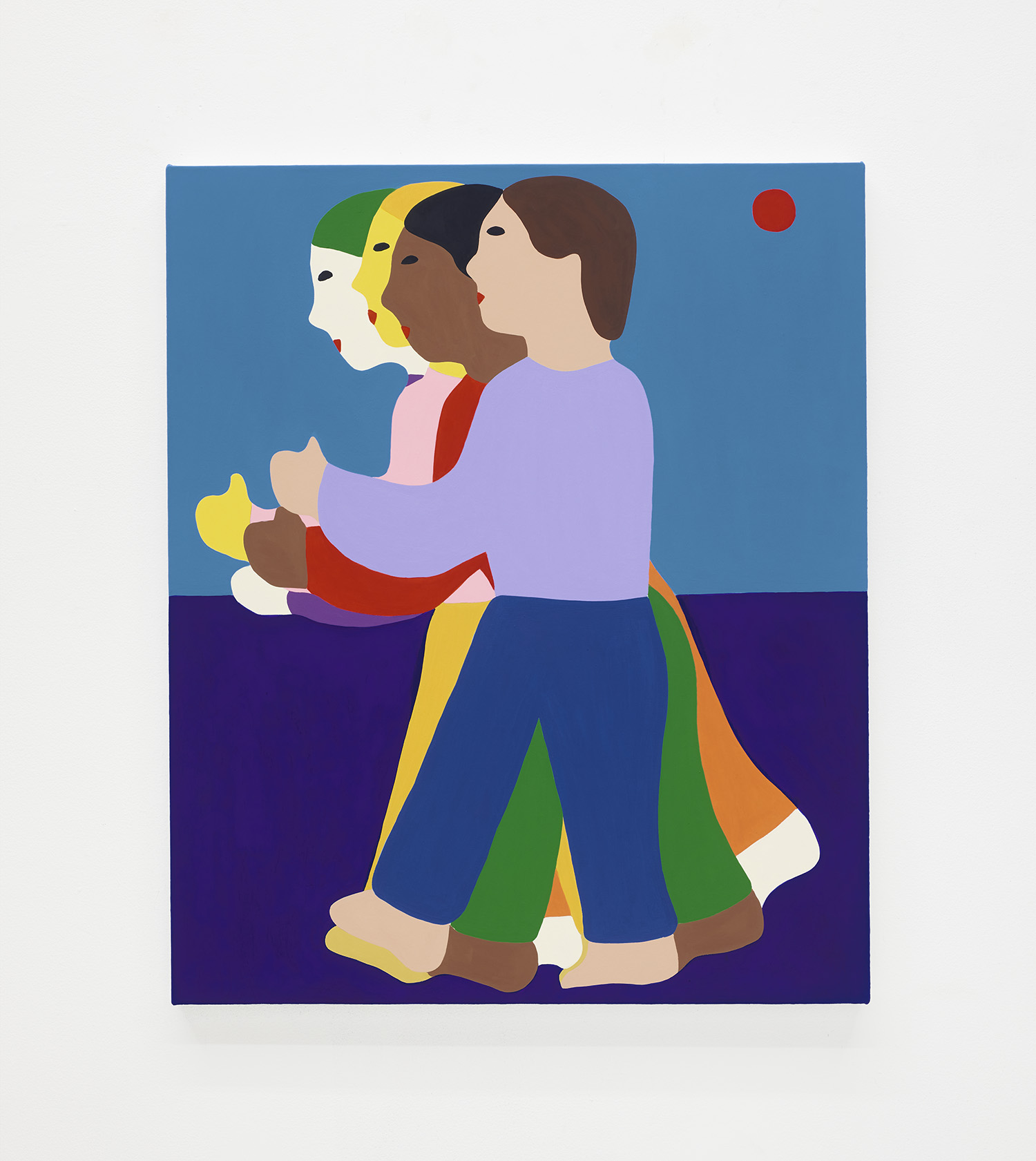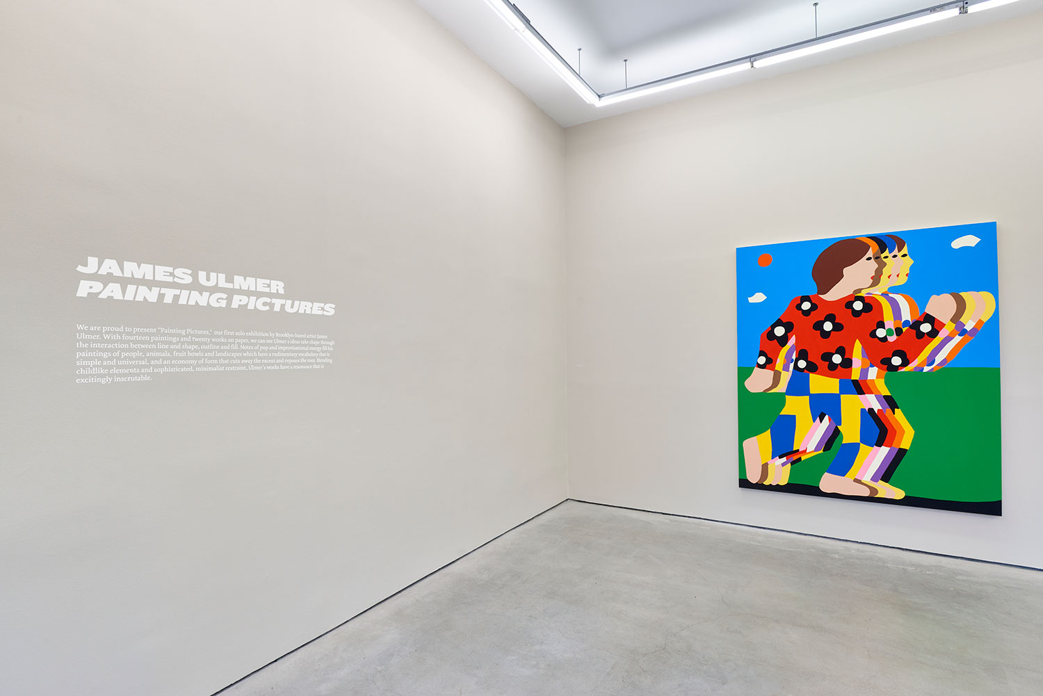 With notes of pop and improvisational energy, Ulmer’s paintings of people, animals, fruit bowls and landscapes are sure to please. They have a rudimentary vocabulary that is simple and universal, and an economy of form that cuts away the excess and exposes the root. They have the detachment of Donald Baechler or Baldessari, the “wrongness” of Japanese punk styles, and a hint of inspiration from John Wesley in the repeated forms and comic orientation. Certainly the boxy figures, like the above, evoke both children’s toys and high fashion. Blending childlike elements and sophisticated, minimalist restraint, the paintings have an interesting resonance and style not easy to place.