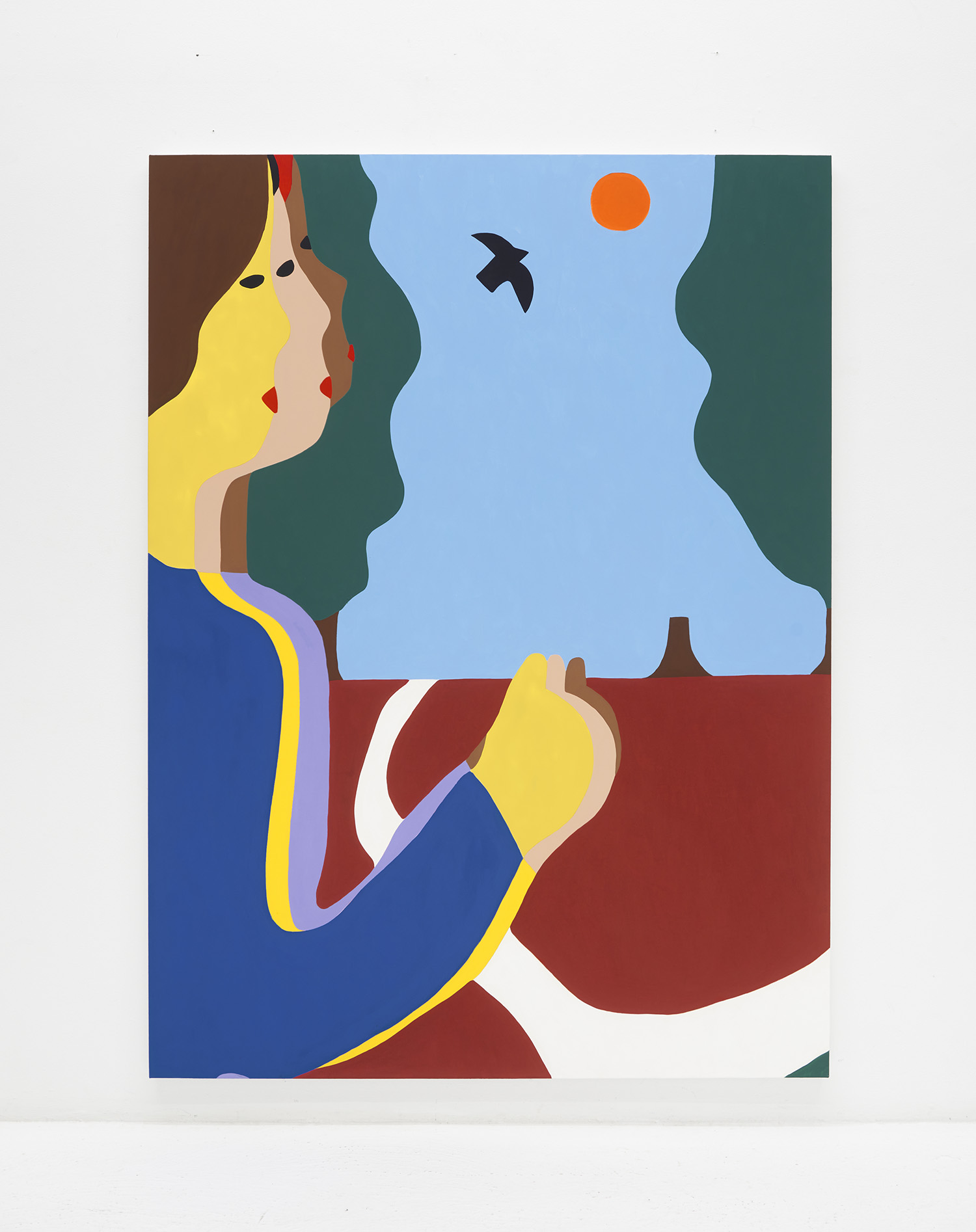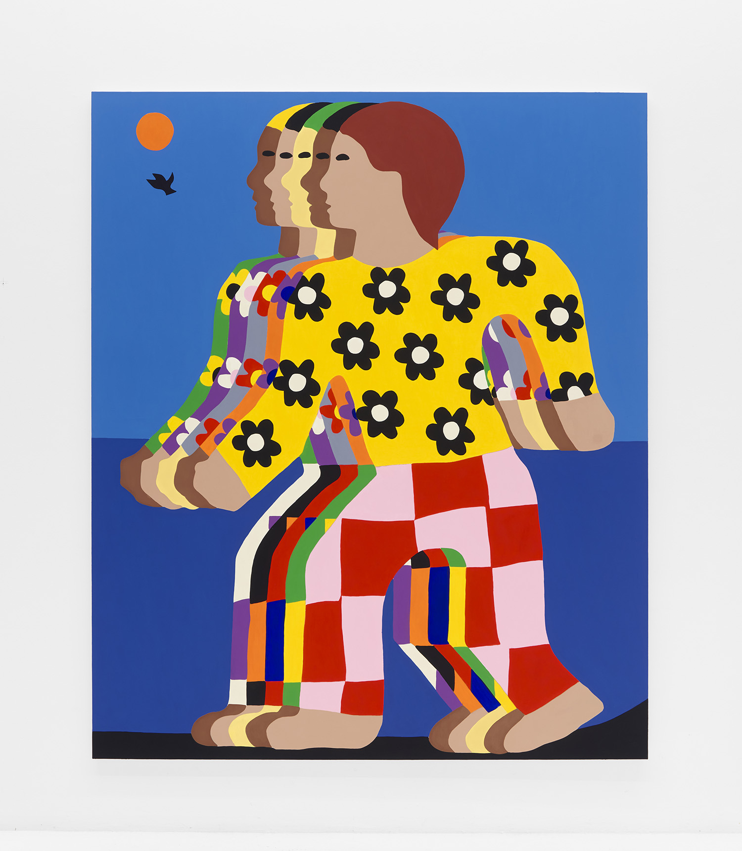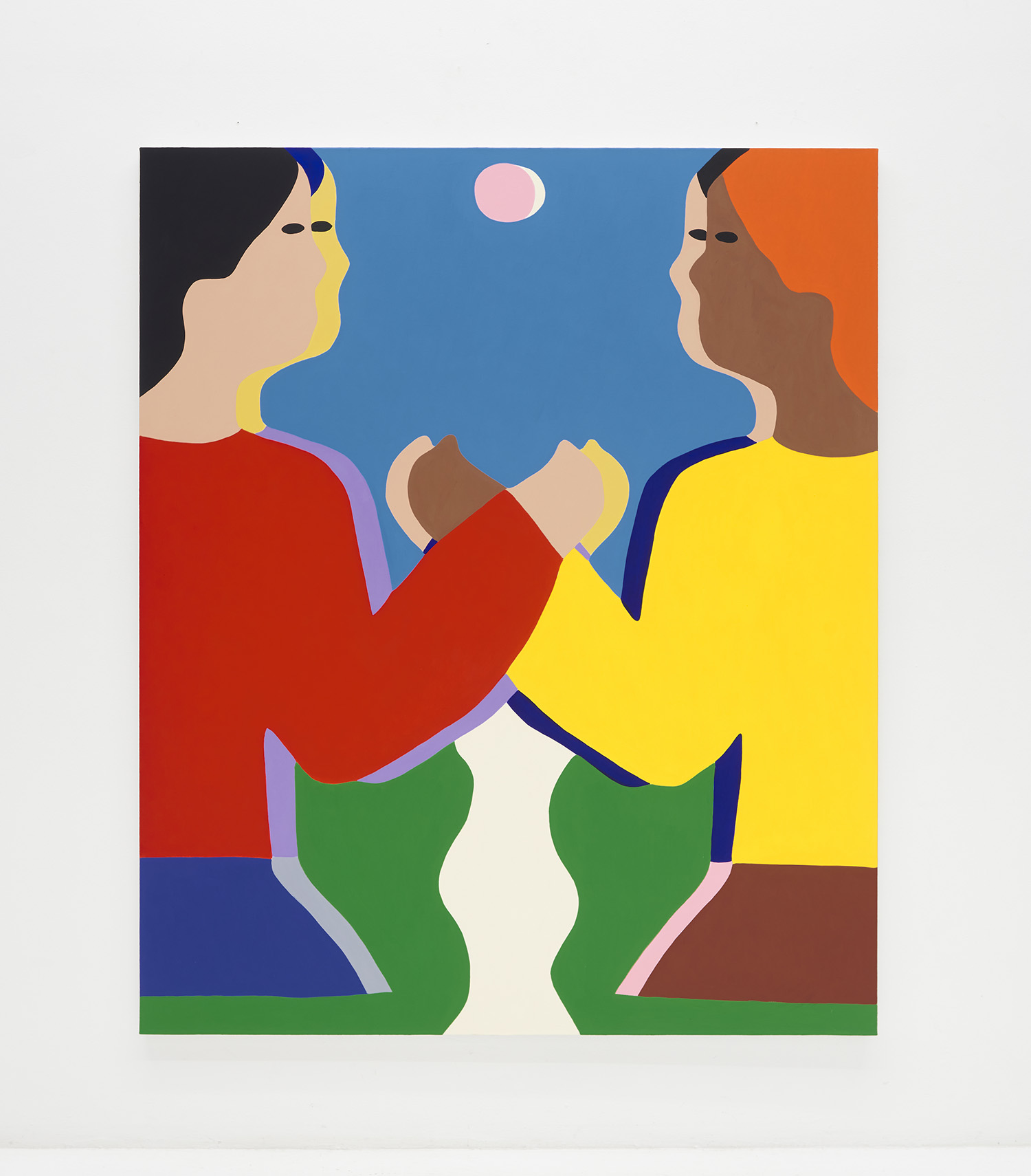 With notes of pop and improvisational energy, Ulmer’s paintings of people, animals, fruit bowls and landscapes are sure to please. They have a rudimentary vocabulary that is simple and universal, and an economy of form that cuts away the excess and exposes the root. They have the detachment of Donald Baechler or Baldessari, the “wrongness” of Japanese punk styles, and a hint of inspiration from John Wesley in the repeated forms and comic orientation. Certainly the boxy figures, like the above, evoke both children’s toys and high fashion. Blending childlike elements and sophisticated, minimalist restraint, the paintings have an interesting resonance and style not easy to place.